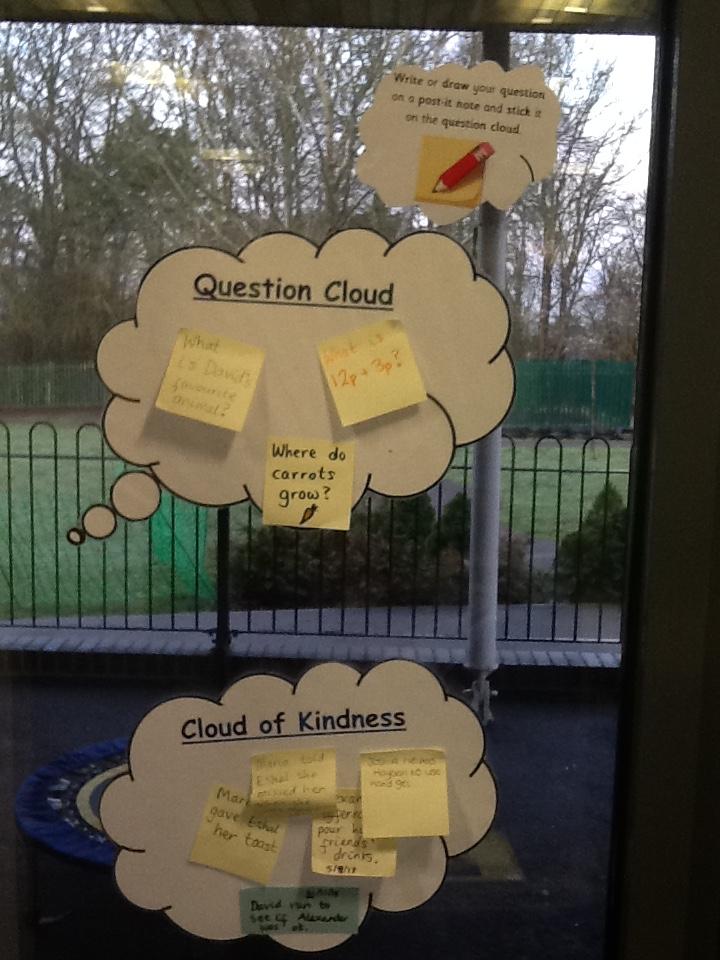 We also have a question cloud and a kindness cloud. The children can write or draw their questions on a postit note and stick it on the question cloud to be answered at a later, appropriate time - this is great if the children have questions to ask but are in the middle of a lesson.