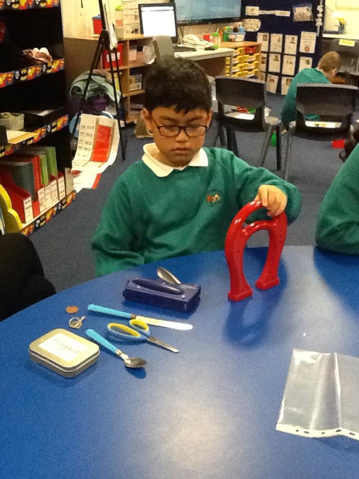 Pearl class have been exploring different materials to identify which ones are magnetic and which ones are not magnetic. Each child had a five minute mission to collect as many magnetic items as they could. We then discussed the magnetic materials and talked about their shared properties e.g. hard, shiny, metal.