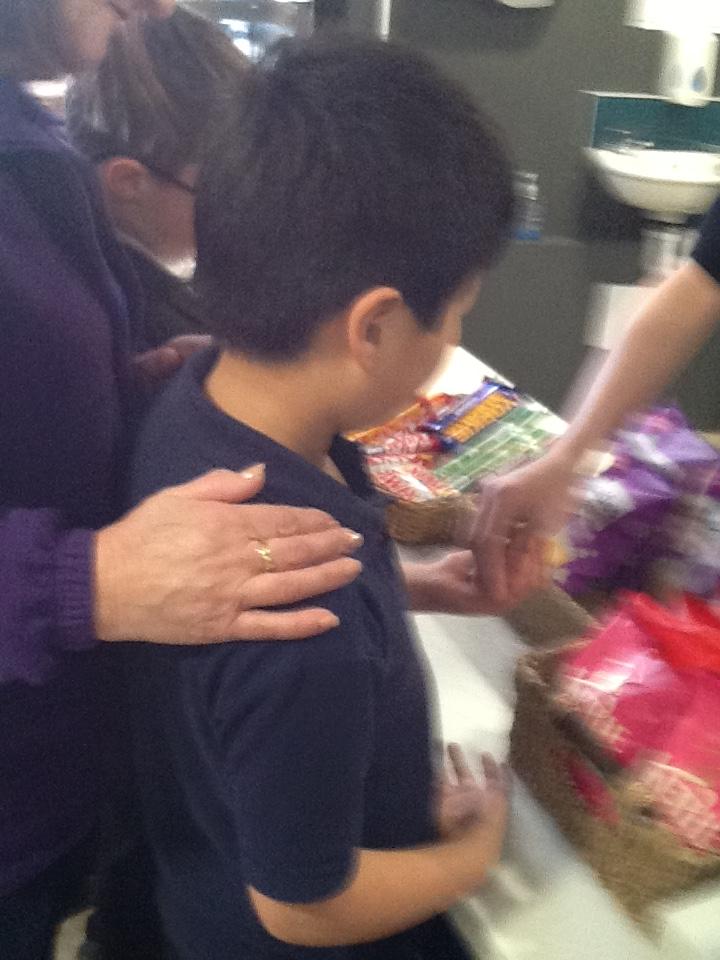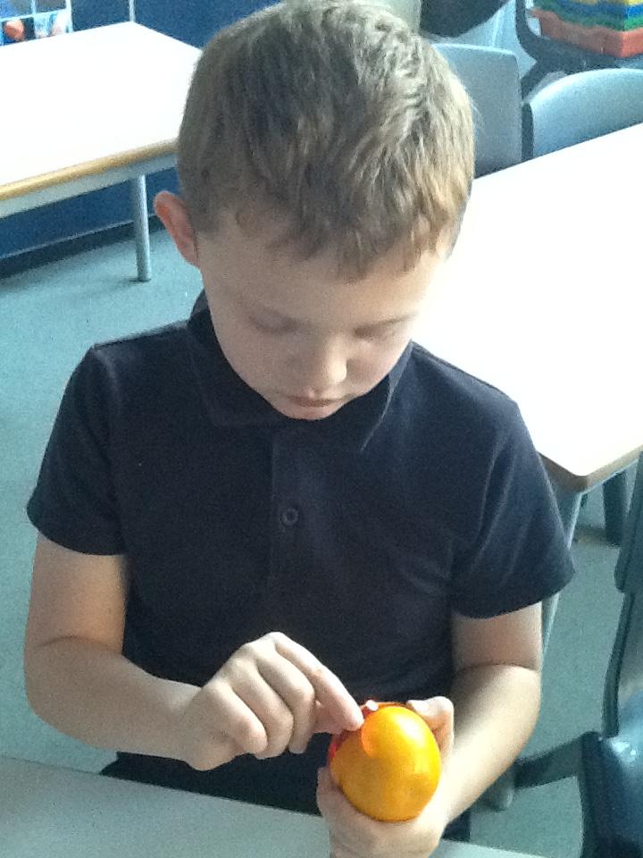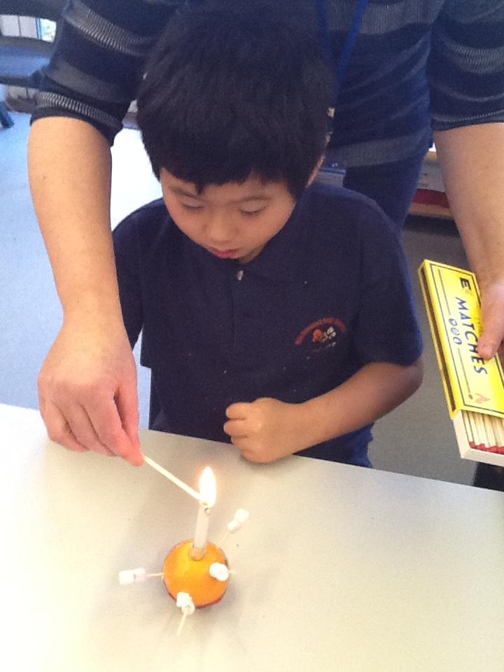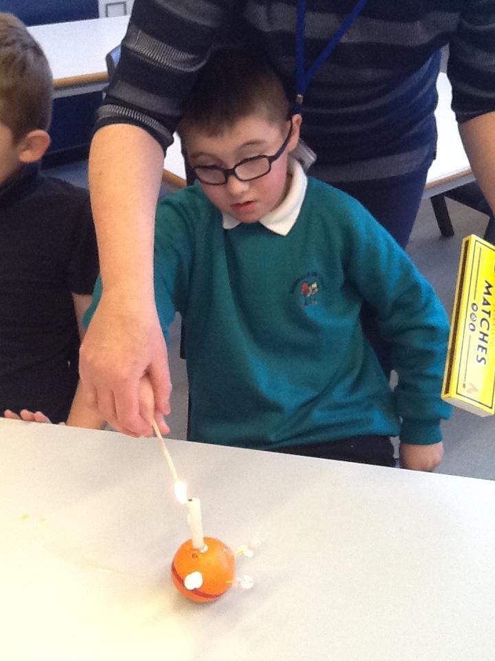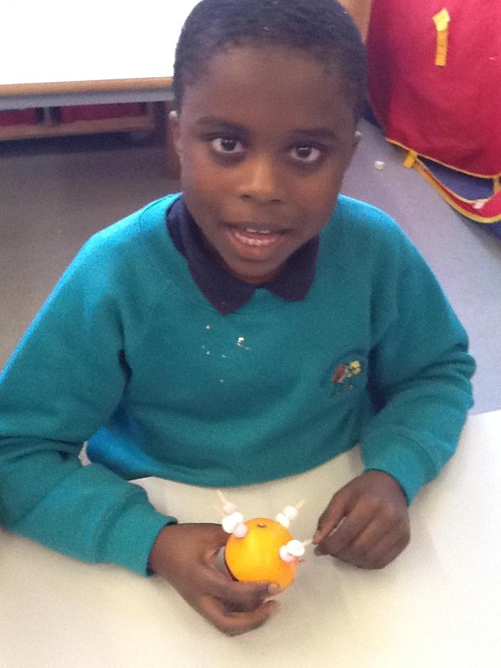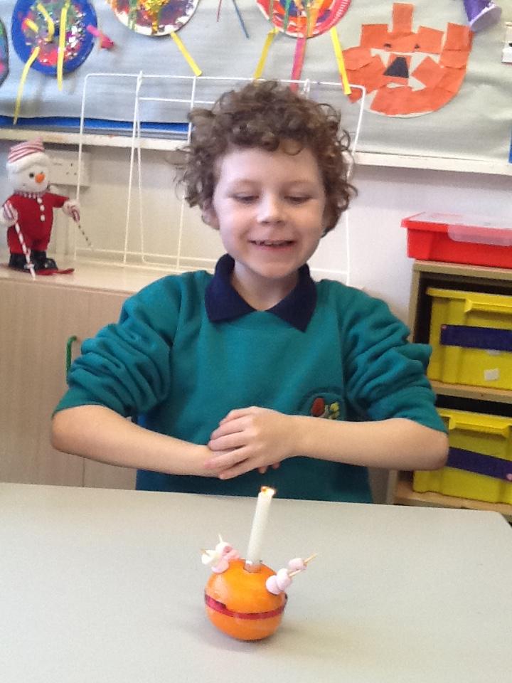 We had fun making Christingles. We got some oranges and put a red ribbon around them. Then we picked up sweets with cocktail sticks. Then we poked these into the oranges. We then made a hole for a candle. We put the candle in and then we use a match (with Sarah's help) to light the candles.