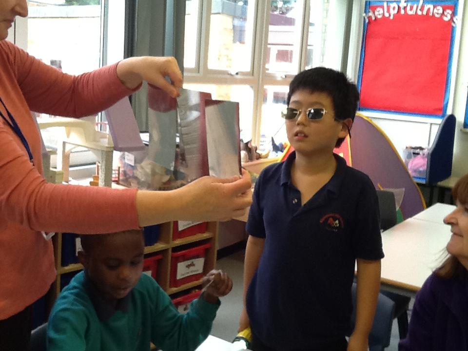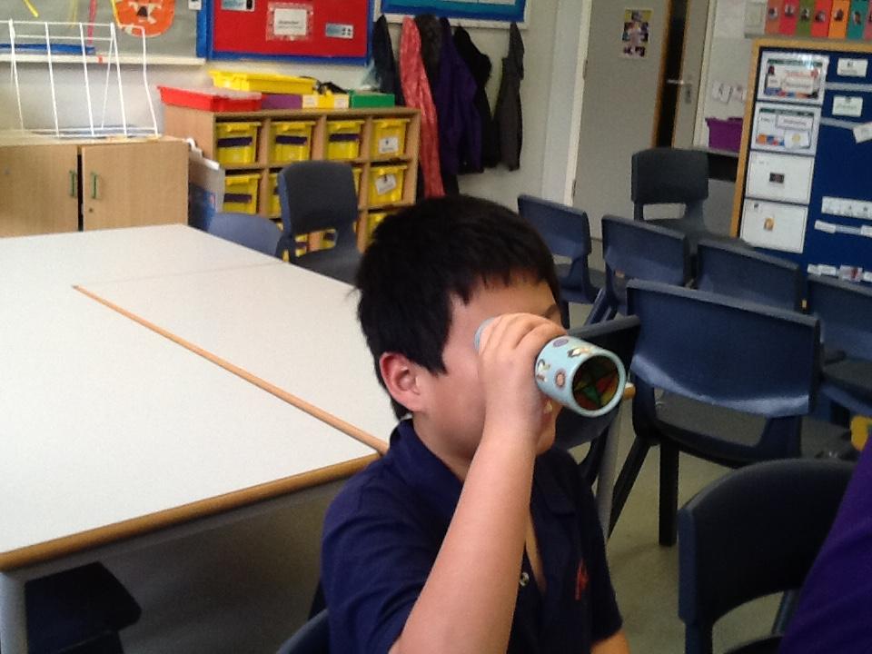 In Science we have been exploring light. We used torches to find jewels in the dark. We looked through kaleidoscopes and put on sunglasses. We used mirrors to make our own kaleidoscope.