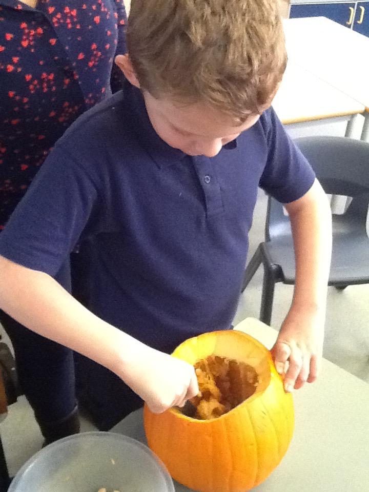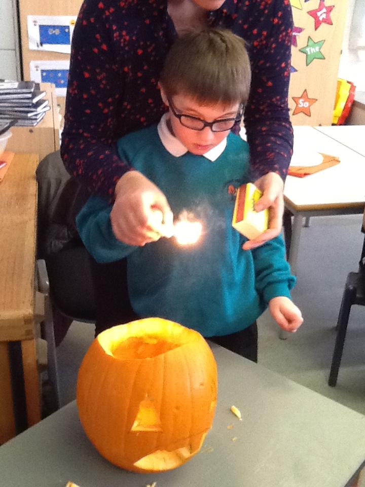 We have been looking at the tradition of Halloween. We got a pumpkin and everyone helped scoop out the inside and then Sarah carved a face in it. Then some children helped light candles to put inside.