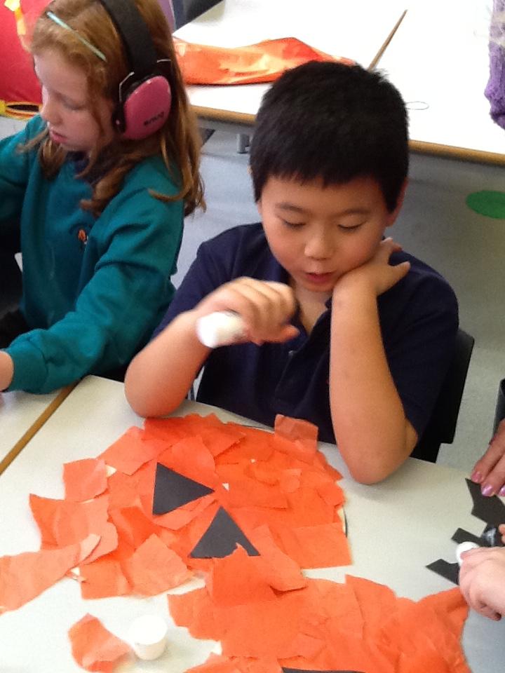 We then use coloured tissue paper to try and make our own pumpkin and drew faces on them with coloured pens.