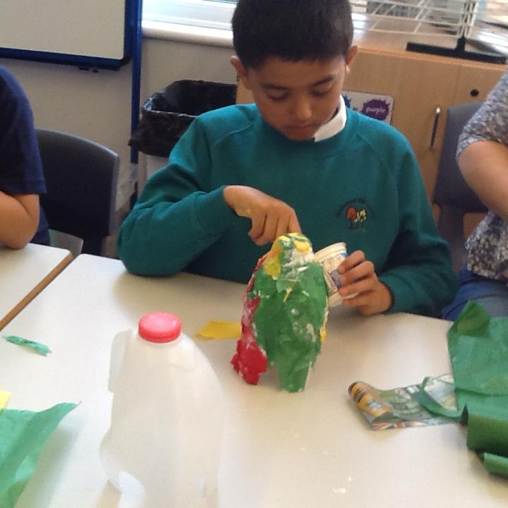 We have been busy looking at things made from plastic and how we can recycle them. We collected empty plastic milk cartons and then we turned them into elephants :)