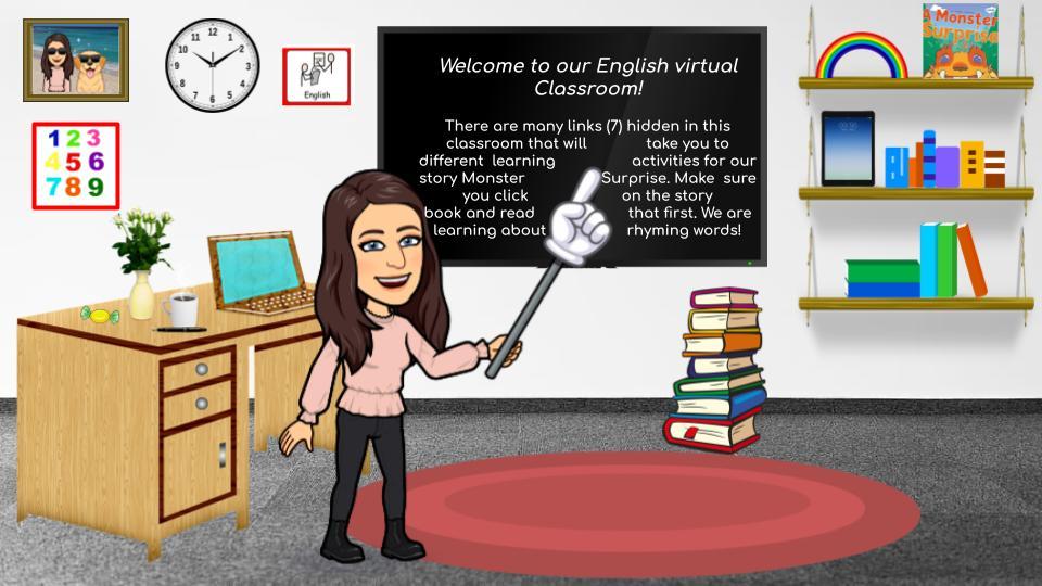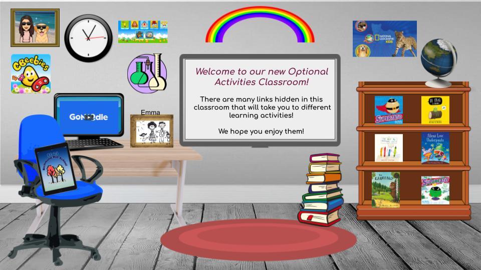 Have a look and explore a virtual classroom I made for this weeks activities. Click on some of the objects in the classroom, they will take you to some fun learning sites and platforms (you need to open the PDF version for the links to work).