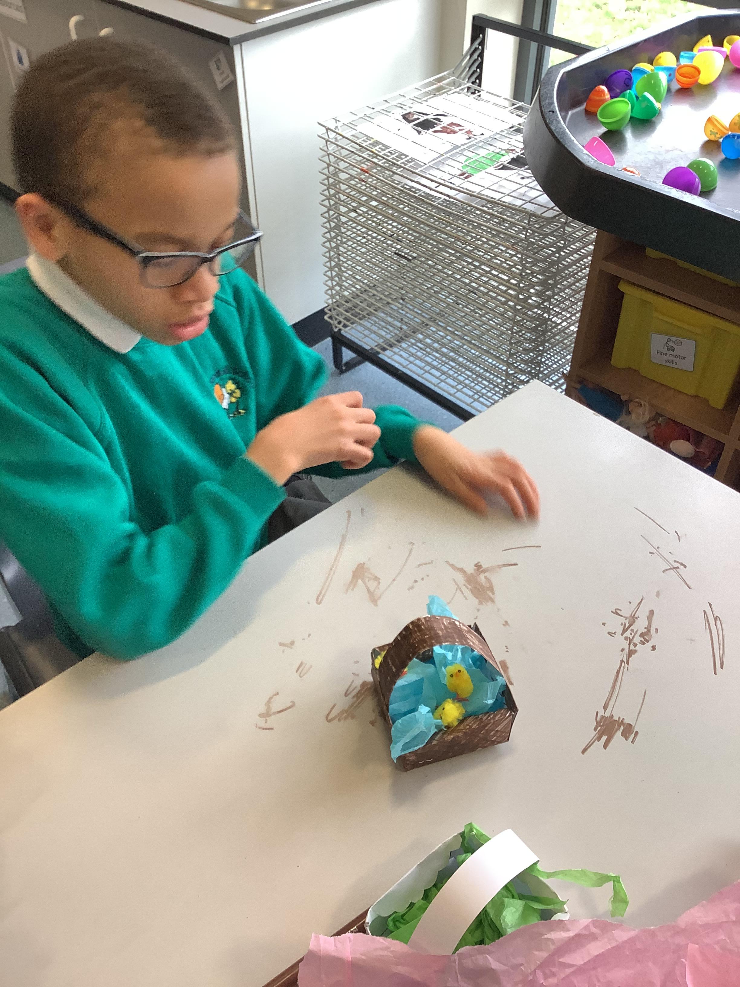 This week has been much more settled in class, the children are getting used to sharing the space with one another. We saw the Easter bunny on our walk this week and we have taken part in a few Easter egg hunts that have developed their communication skills and developed their problem solving skills when working out all the clues! Most of our work has been Easter themed, alongside their PLP work.