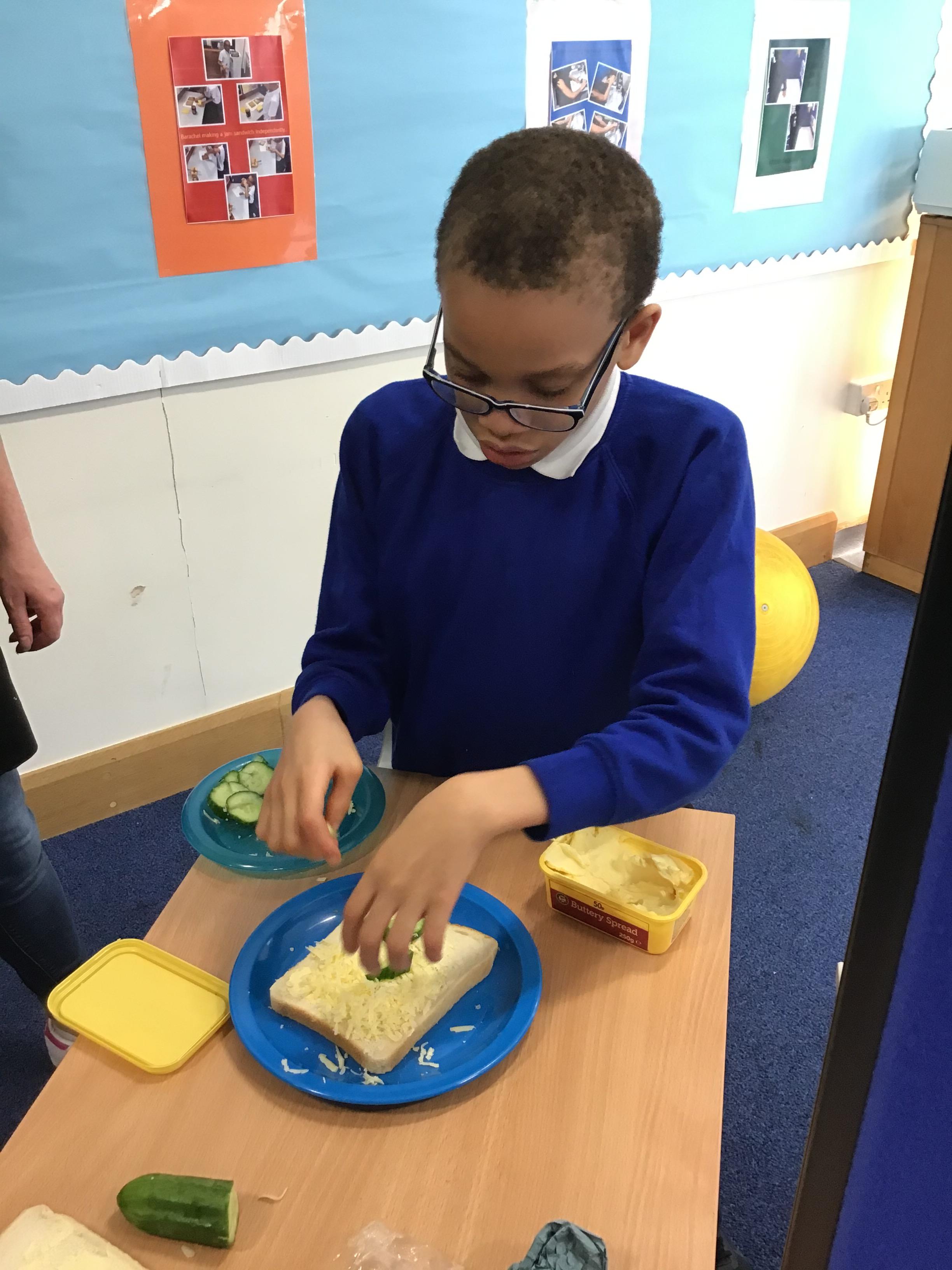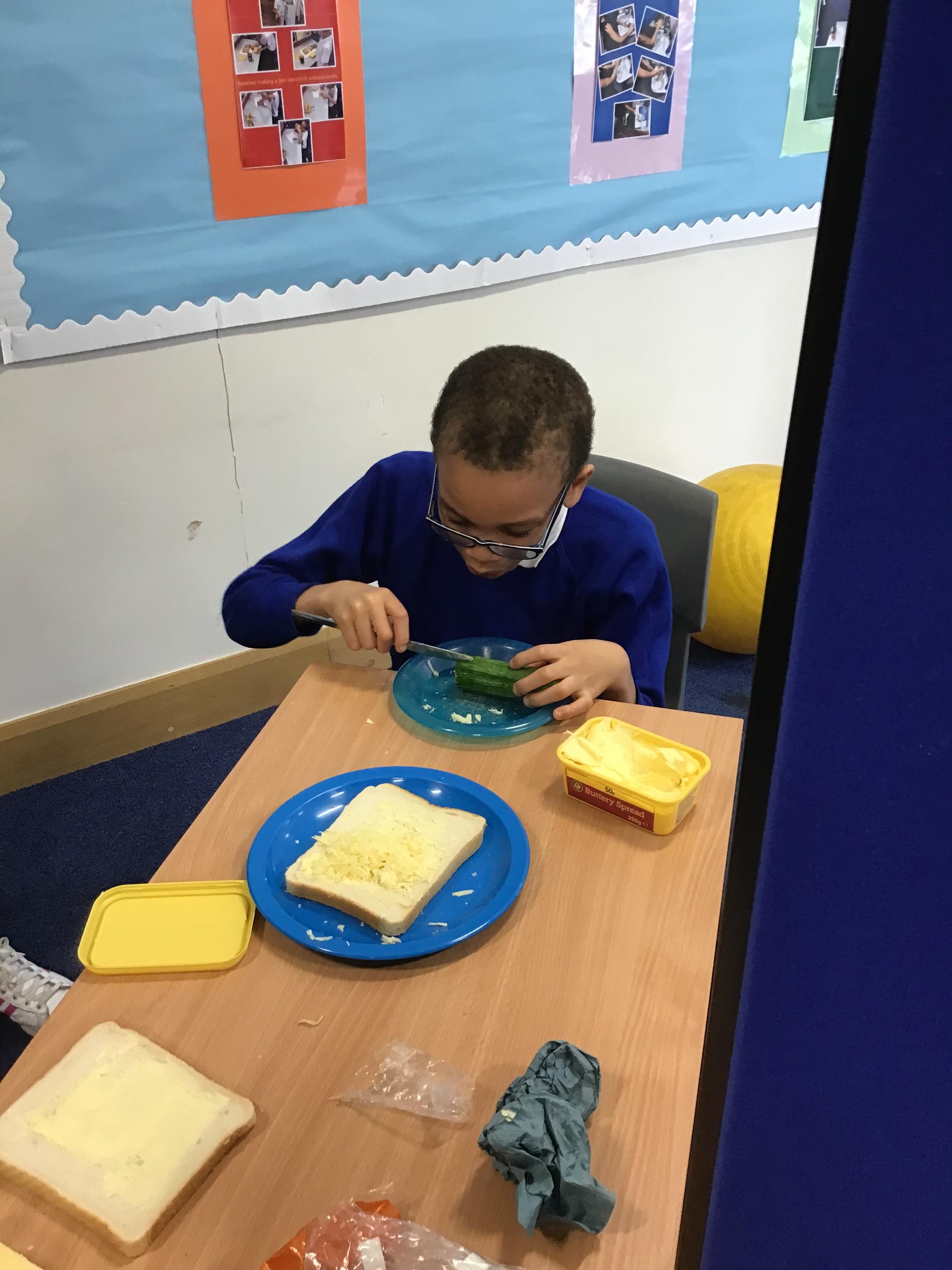 In cookery this half term the class are learning to make their own sandwiches. They are using PECs and Communication Aids to ask for what equipment and ingredients they need.