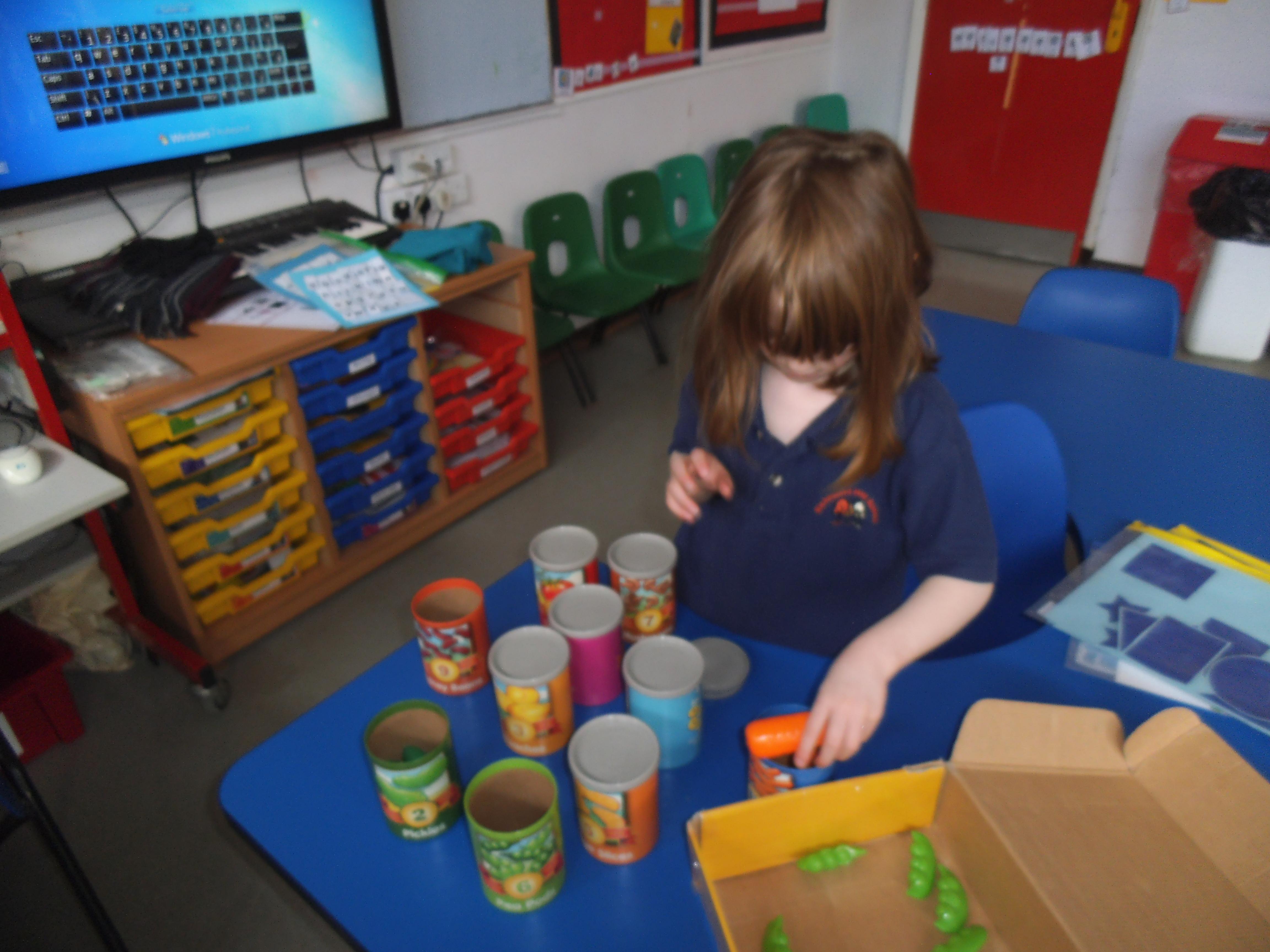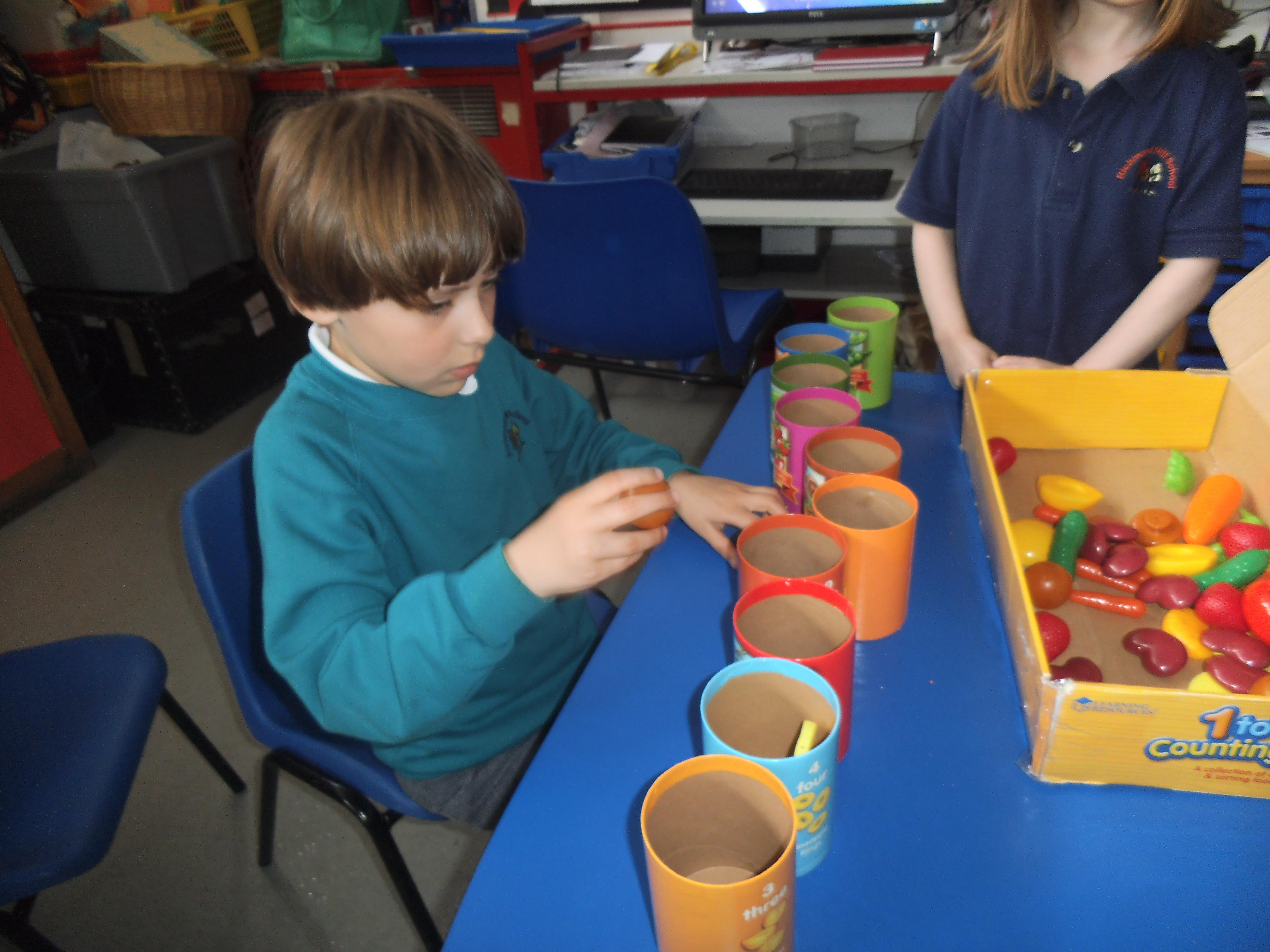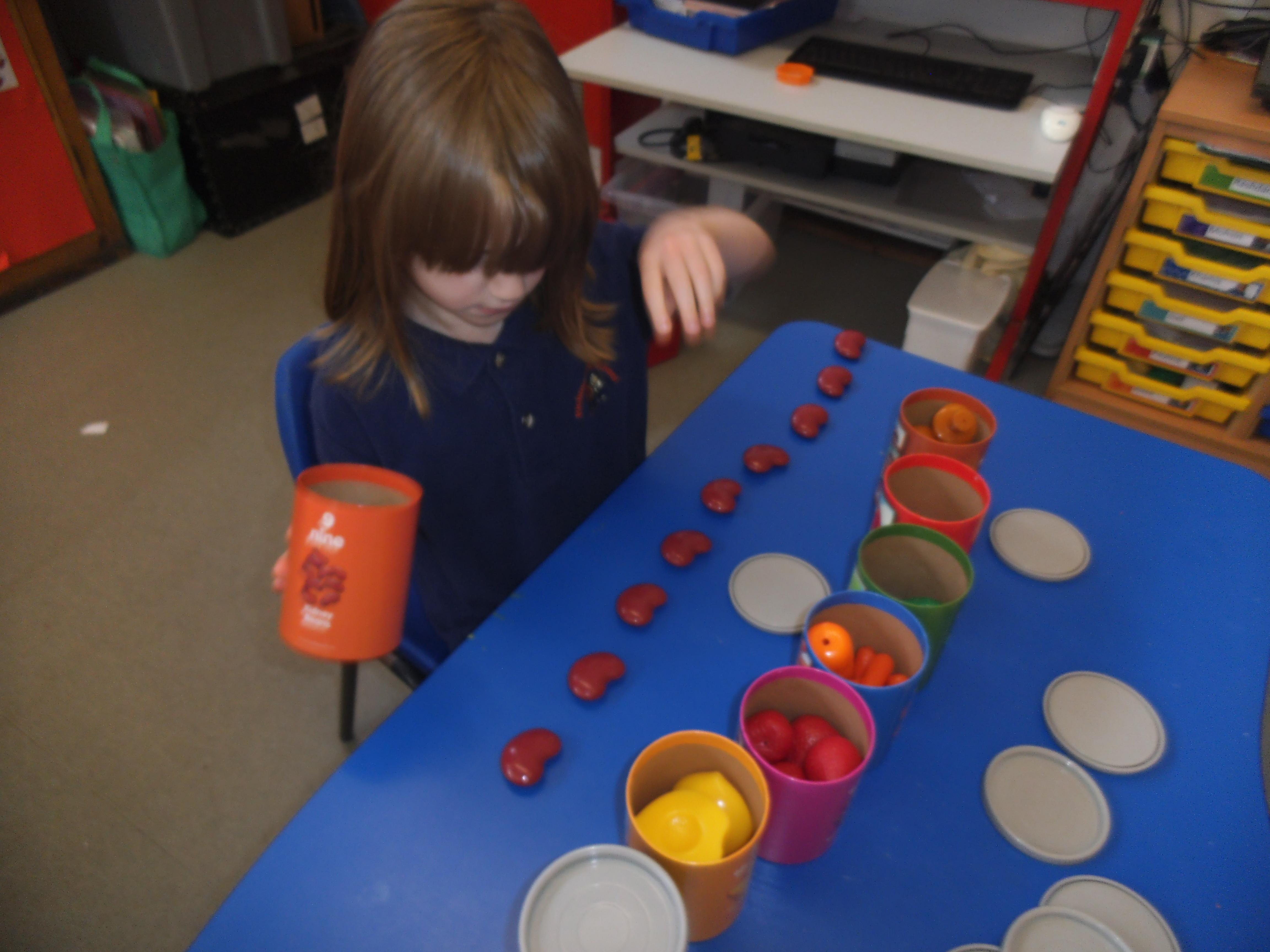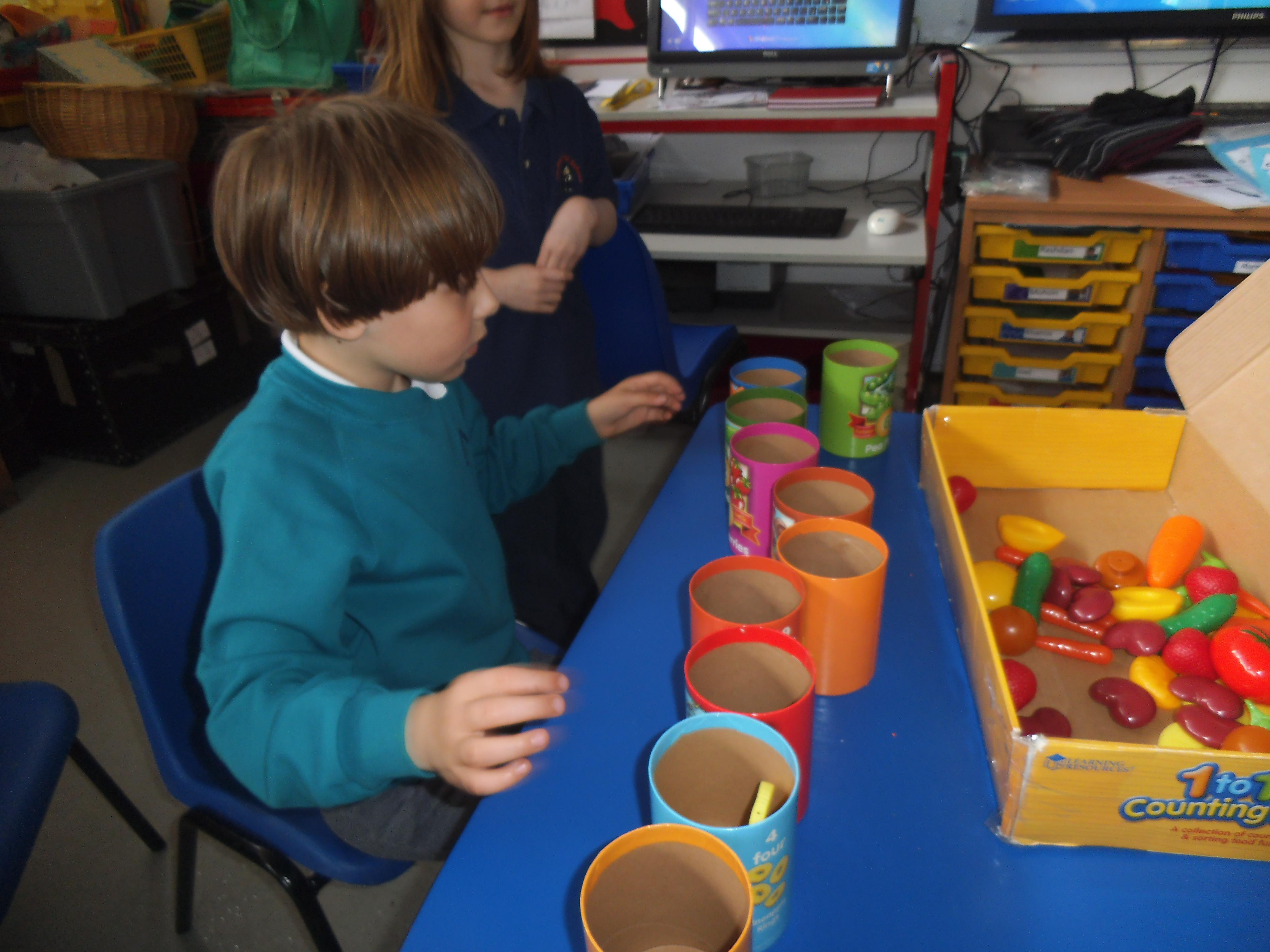 In Maths we are focusing mainly on number and being able to make groups of different sizes. Some of the children can count objects and some are able to recognise numbers, but the skill of stopping at a given number is quite tricky and the children need a little help to recognise when they have reached the correct amount. All the children have an understanding of one, so now we are looking to make groups of two and three. We shall also be learning about money and shall use pennies to buy some fruit and vegetables in our role play shop.
