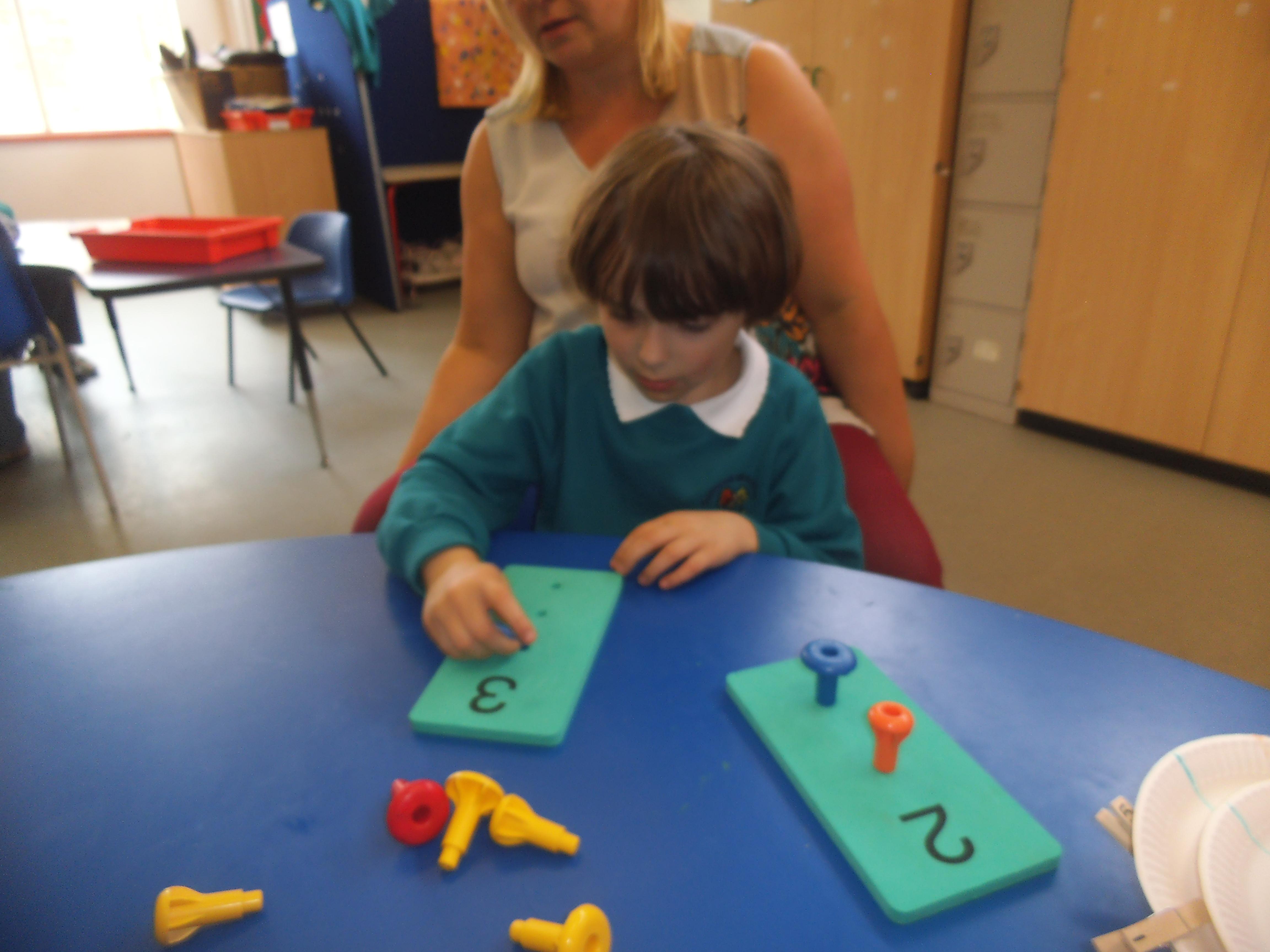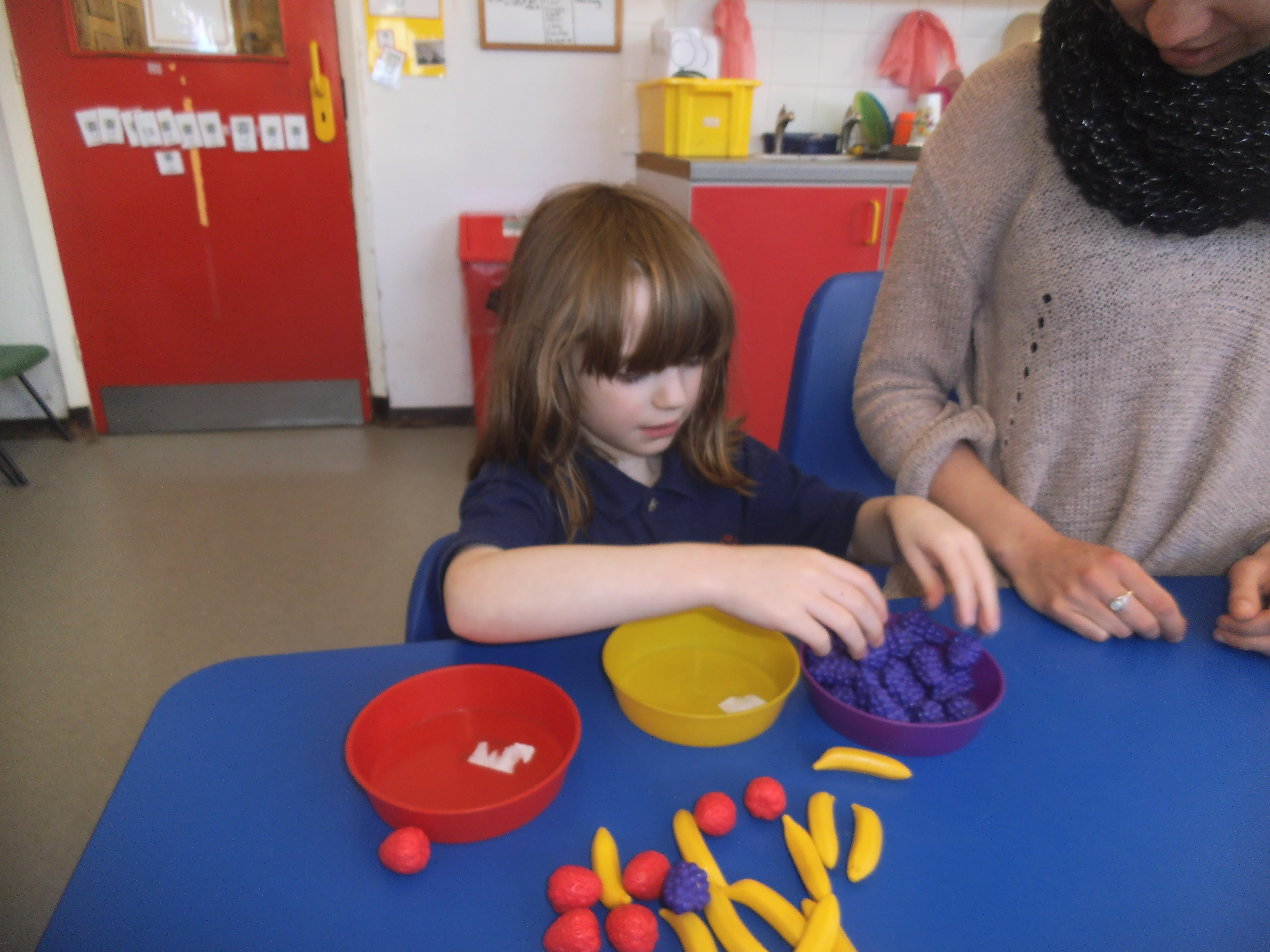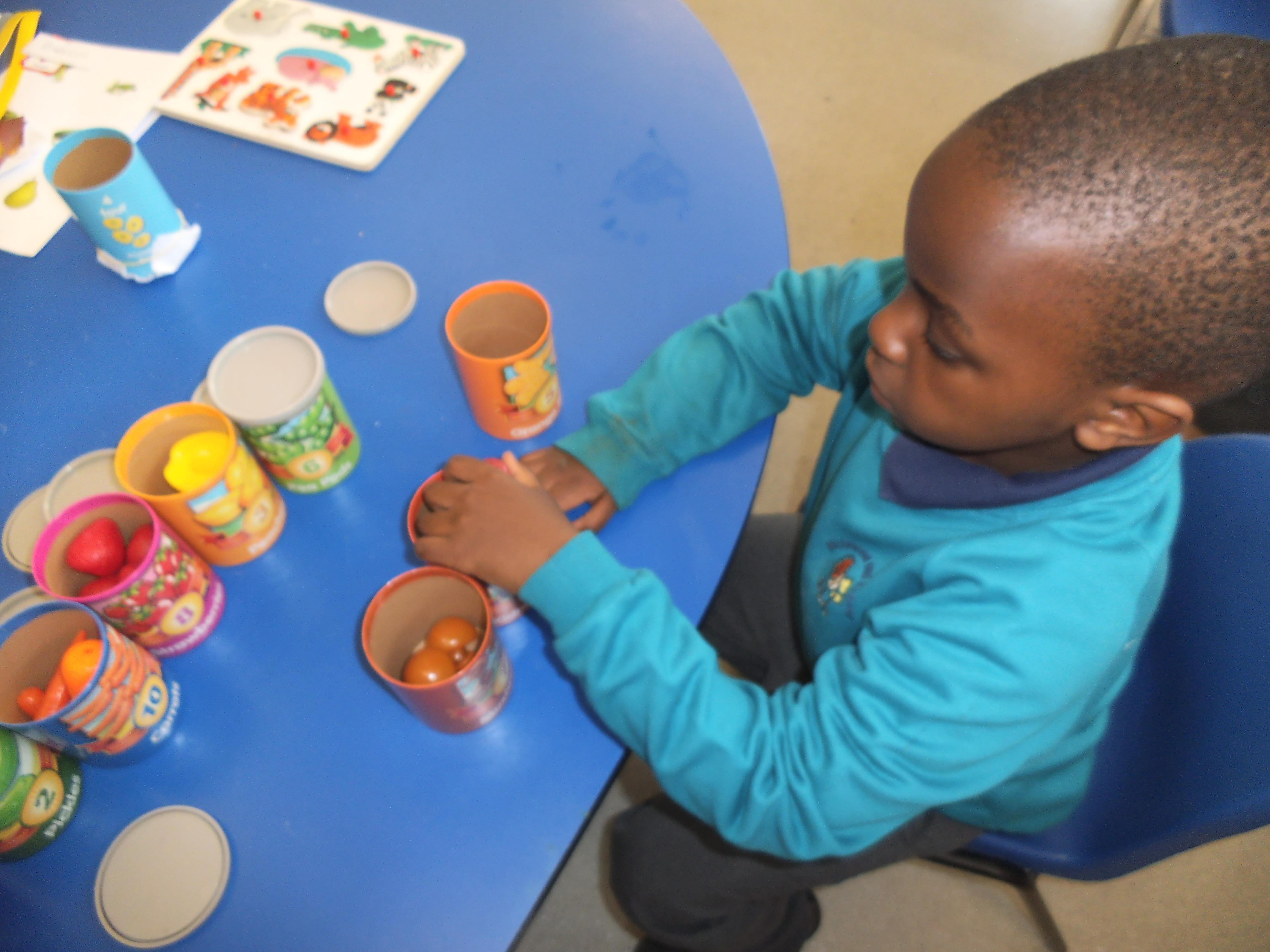 In Maths we are focusing mainly on number and being able to make groups of different sizes. Some of the children can count objects and some are able to recognise numbers, but the skill of stopping at a given number is quite tricky and the children need a little help to recognise when they have reached the correct amount. All the children have an understanding of one, so now we are looking to make groups of two and three. We shall also be learning about money and shall use pennies to buy some fruit and vegetables in our role play shop.