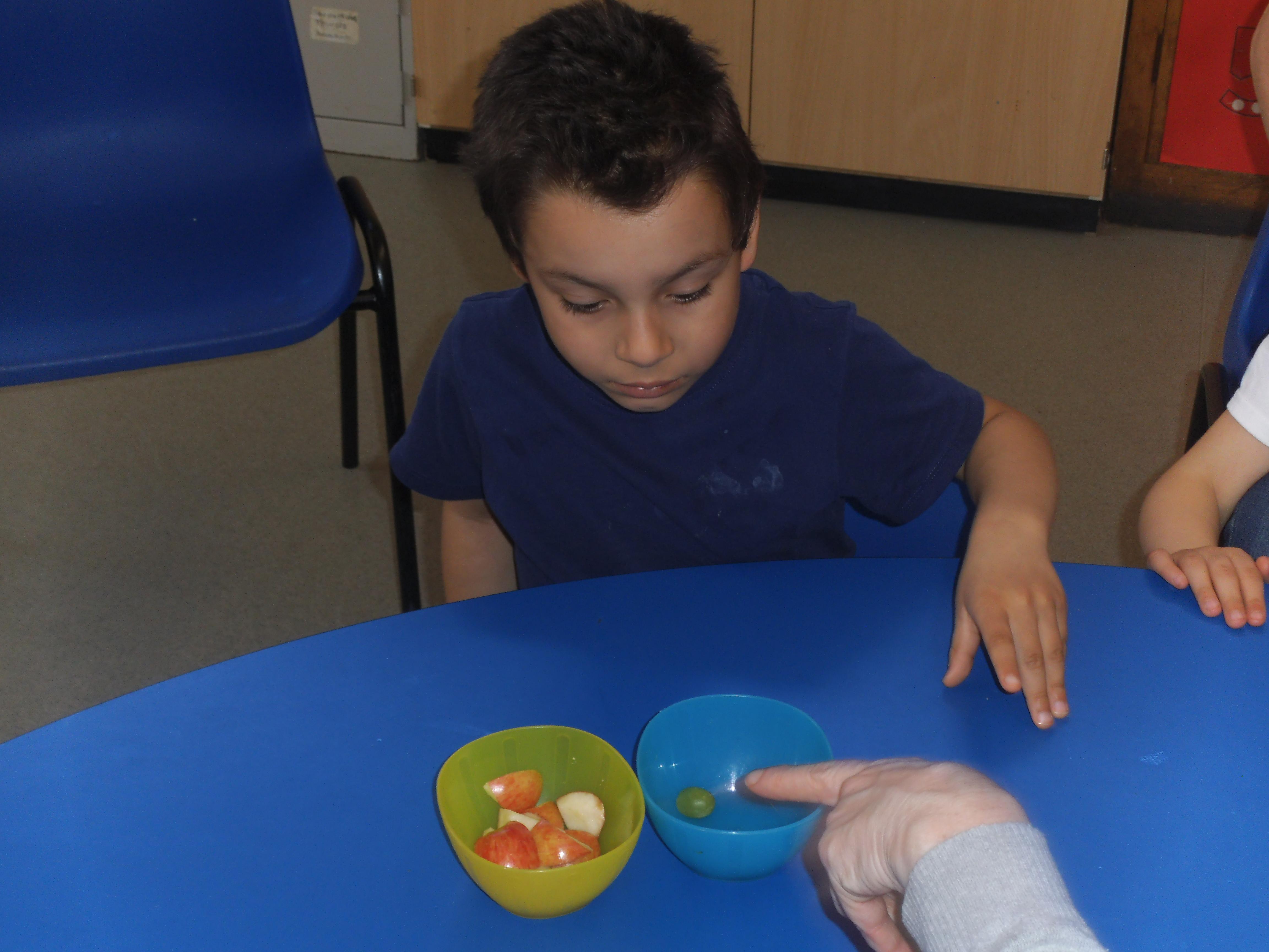We shall be learning to handle books carefully, turn pages and look and point to the pictures. Some of the children will learn the names of the fruit and the animals and a few will be able to recognise some of the words from the story. With some of the children we shall also be listening to the initial sounds of the words and asking the children to repeat those sounds.