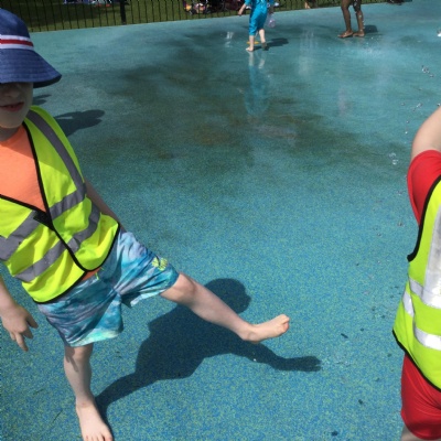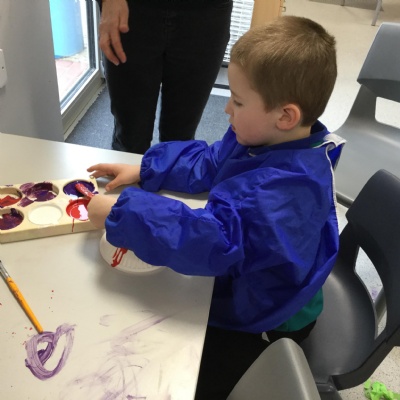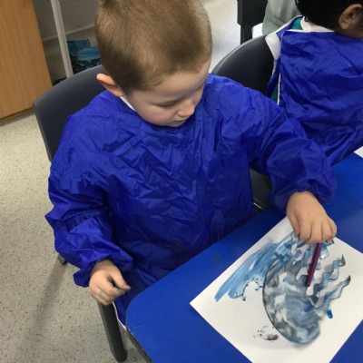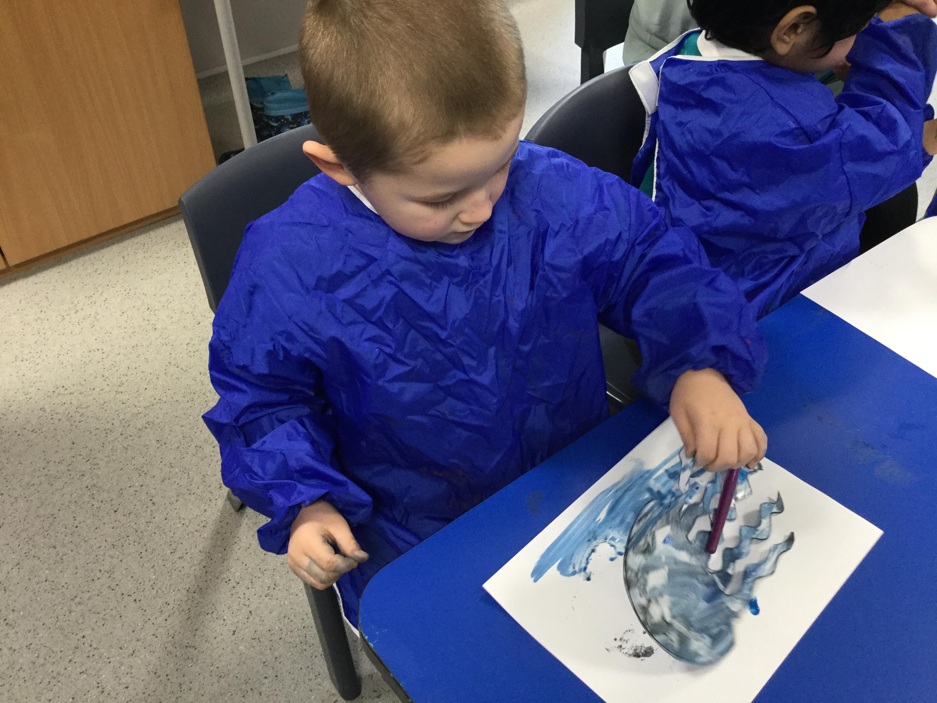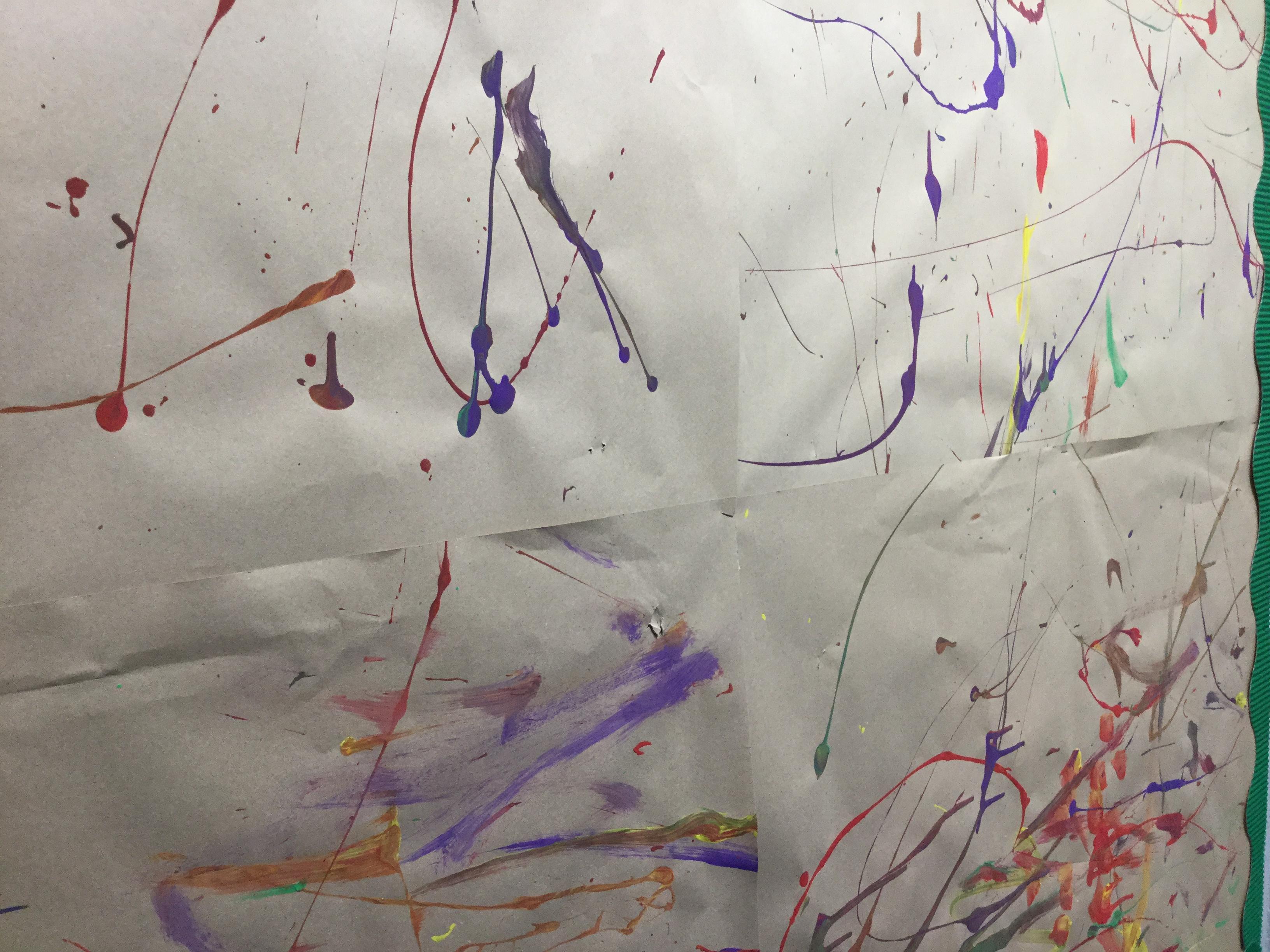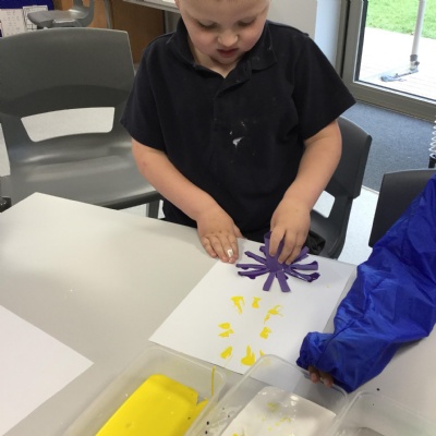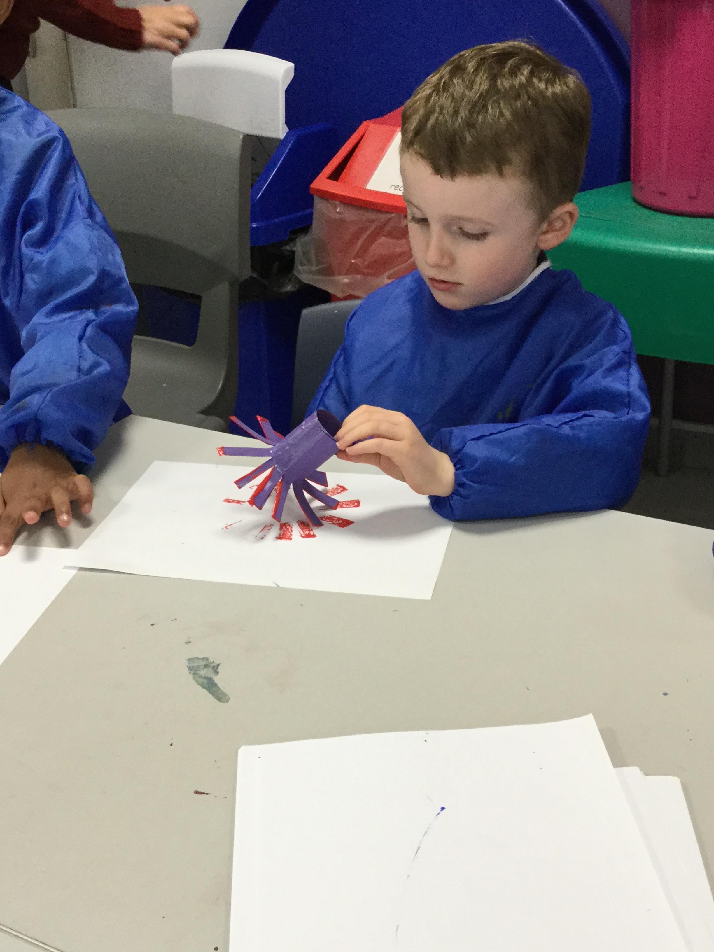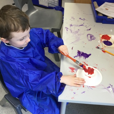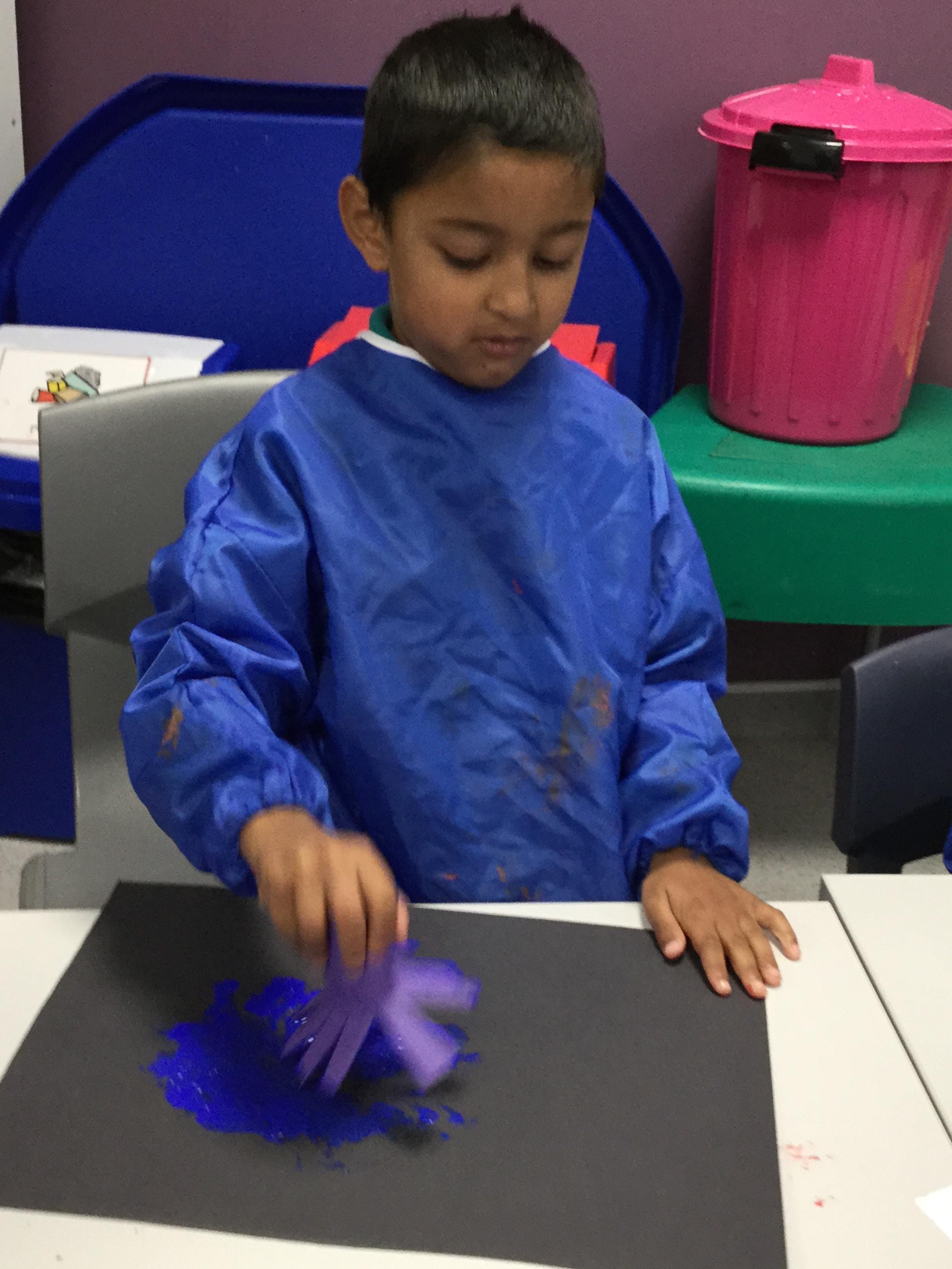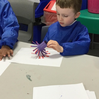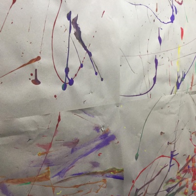 We did splatter painting outside, flicking different coloured paint at the large piece of paper.