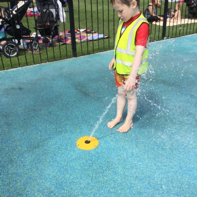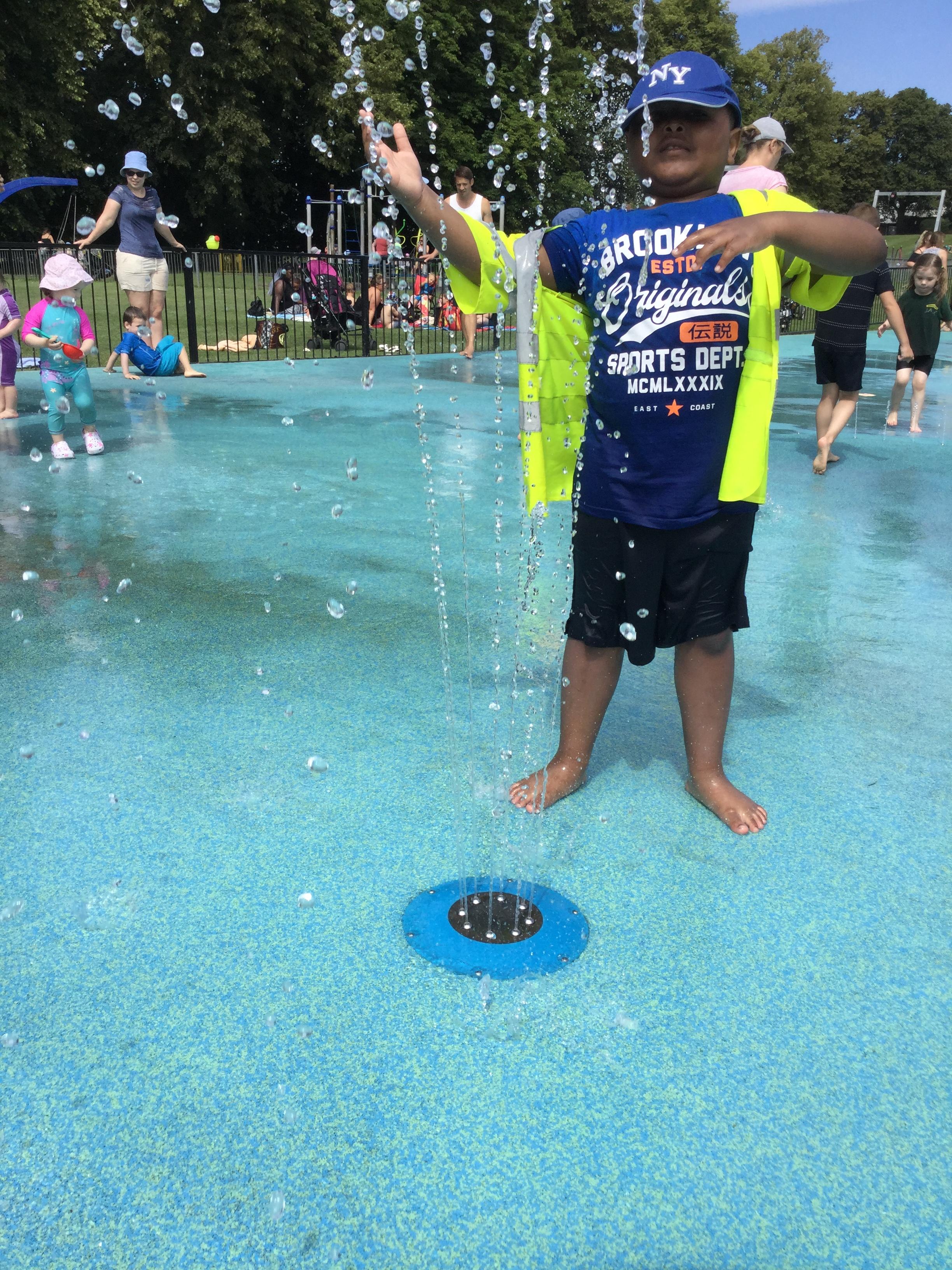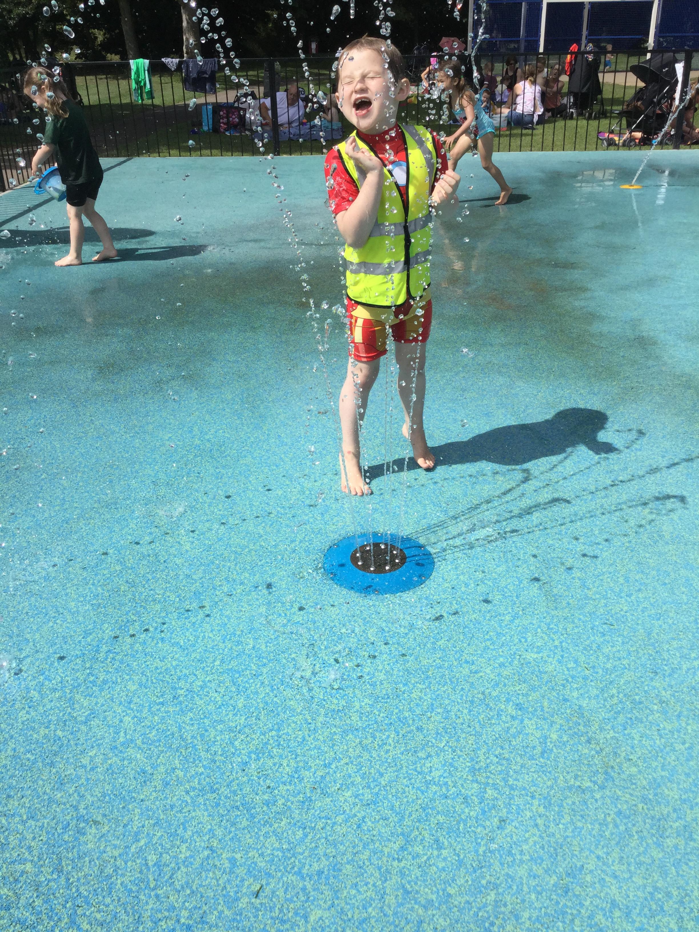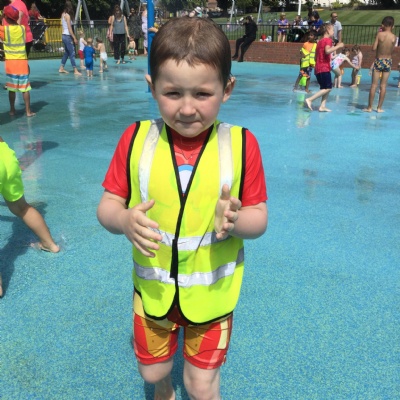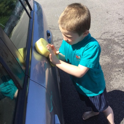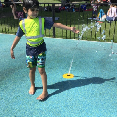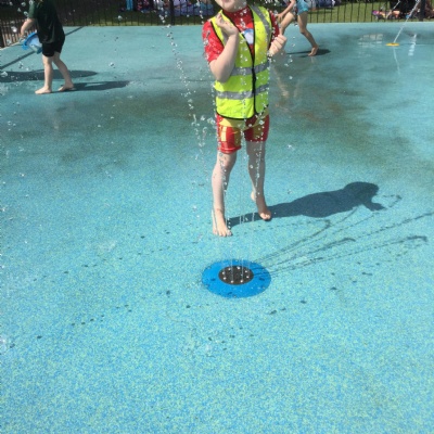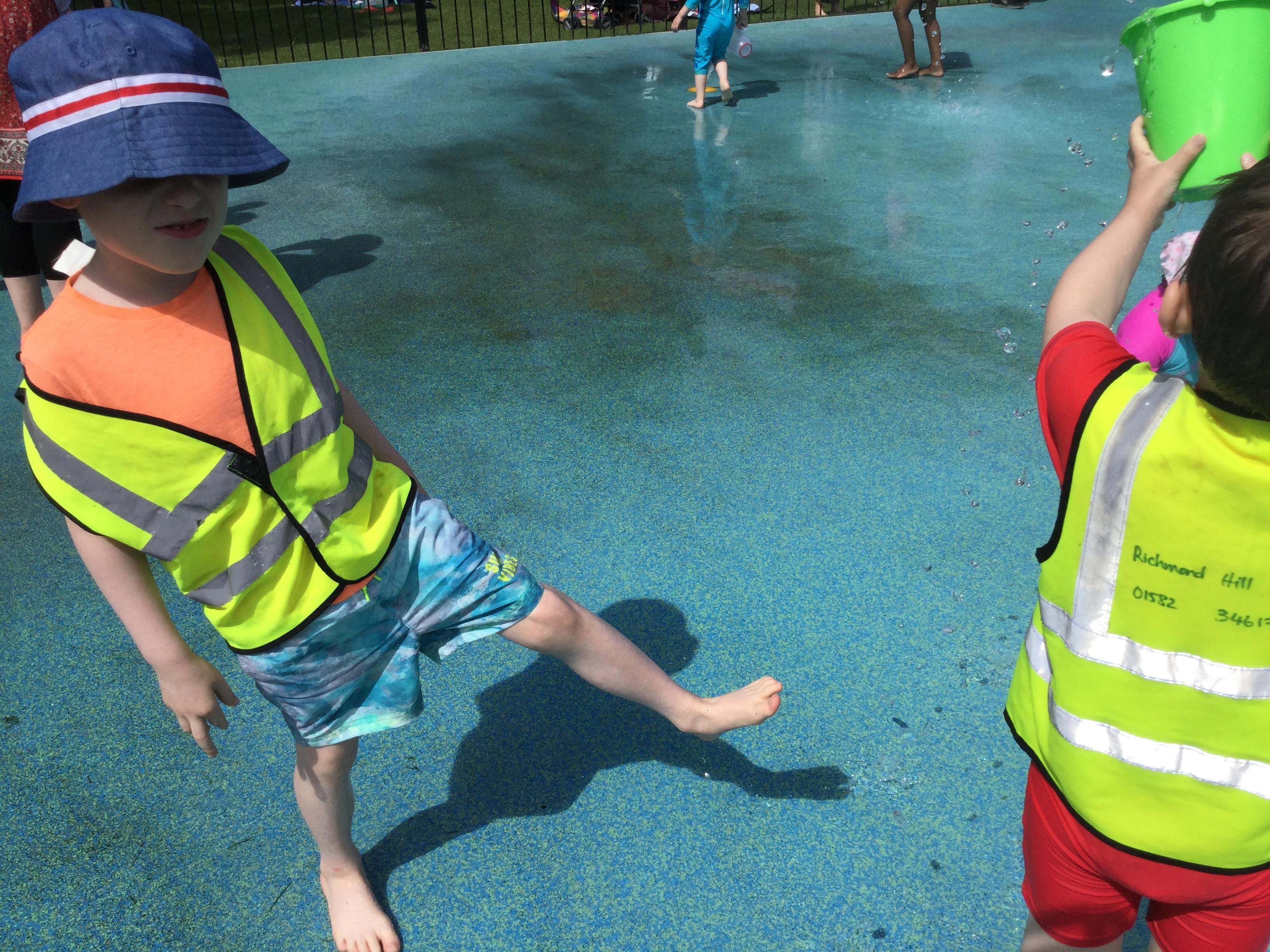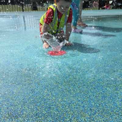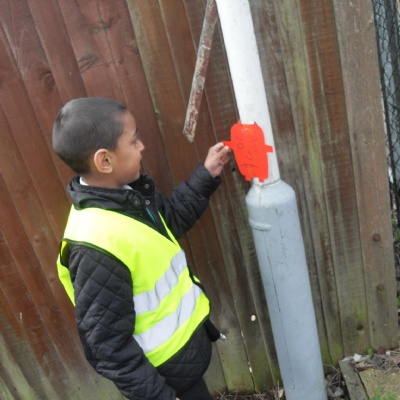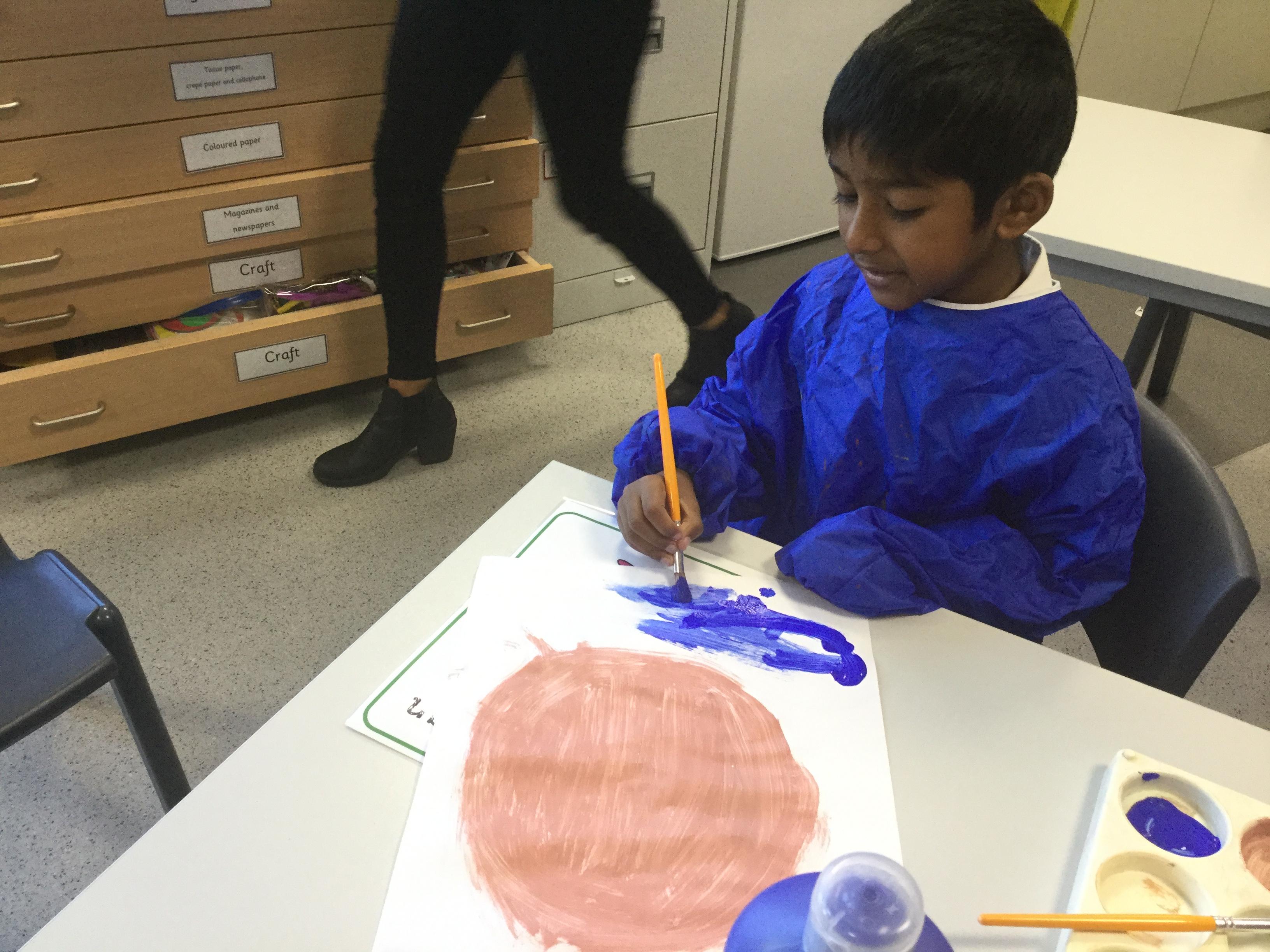 We did splatter painting outside, flicking different coloured paint at the large piece of paper.