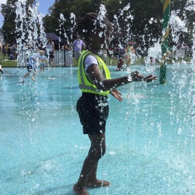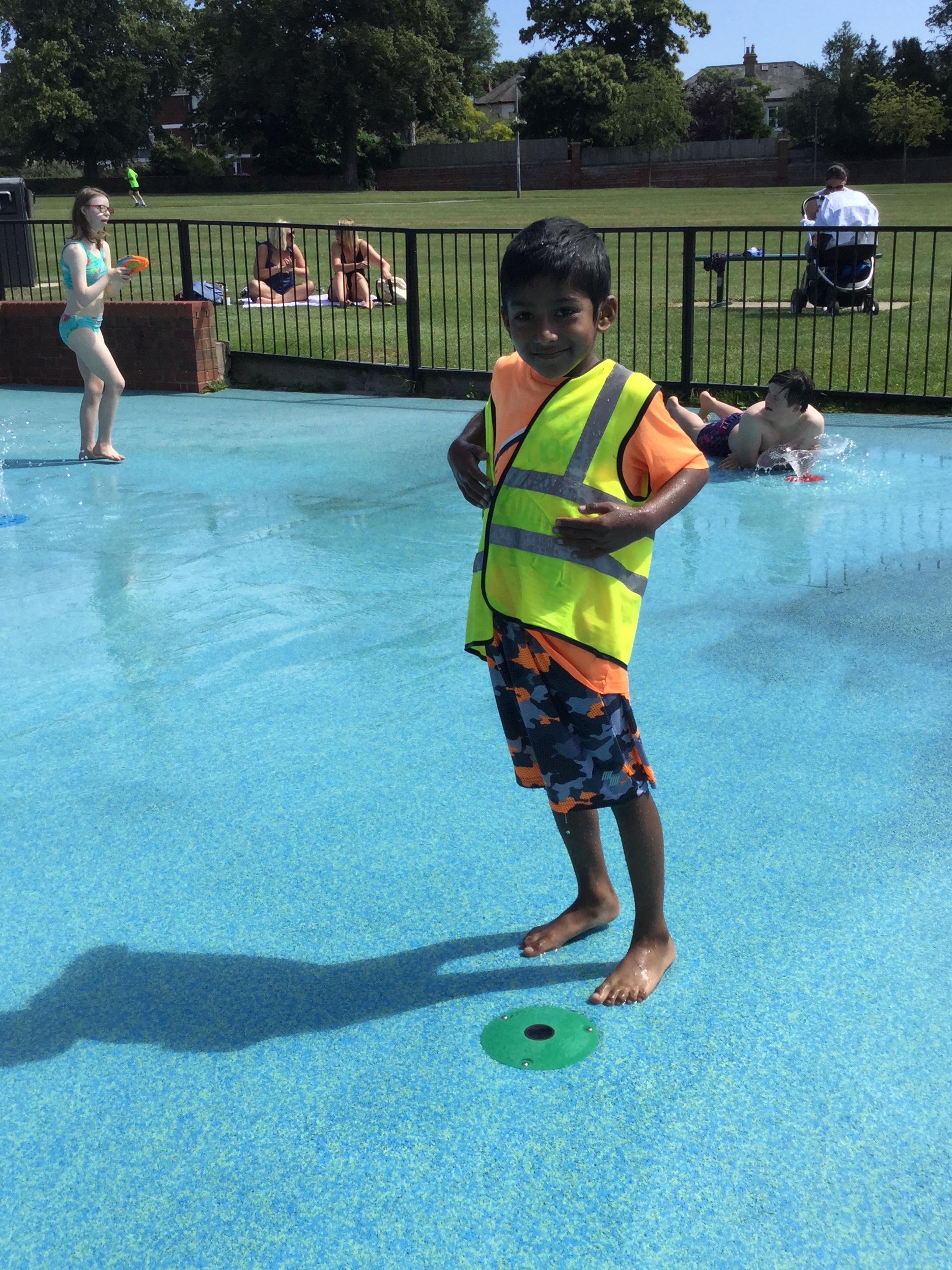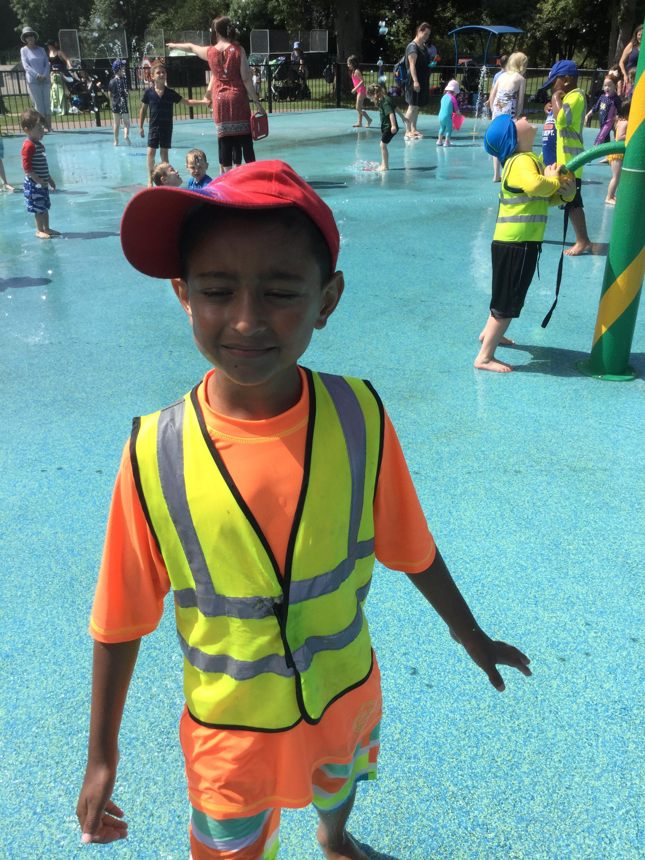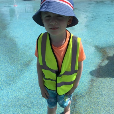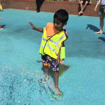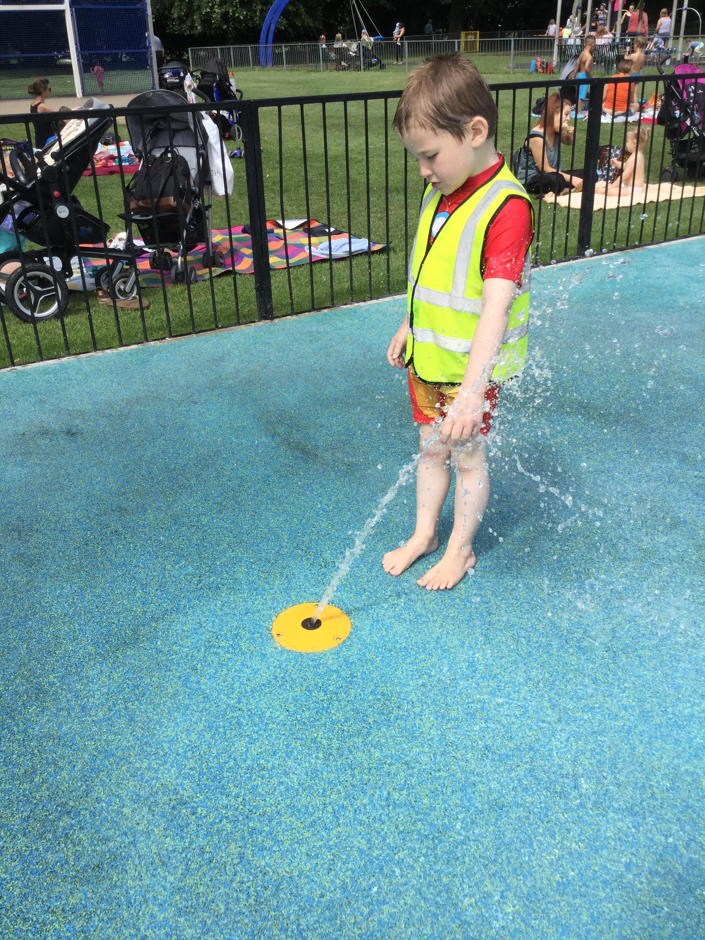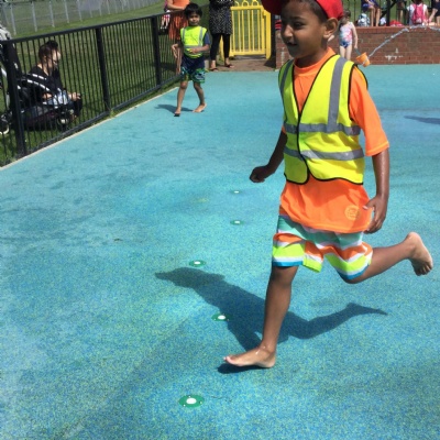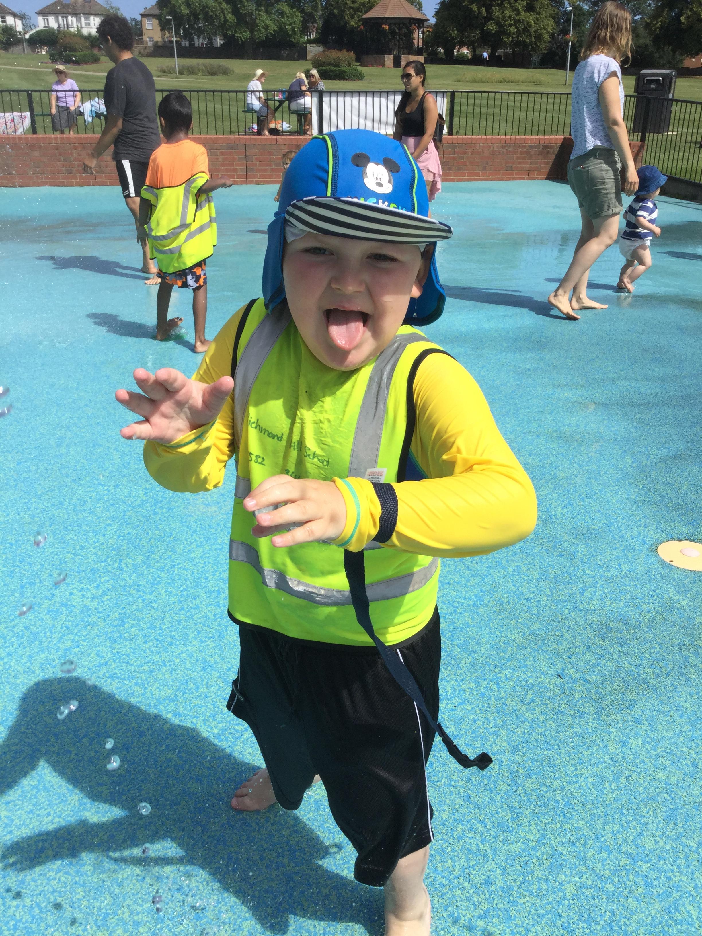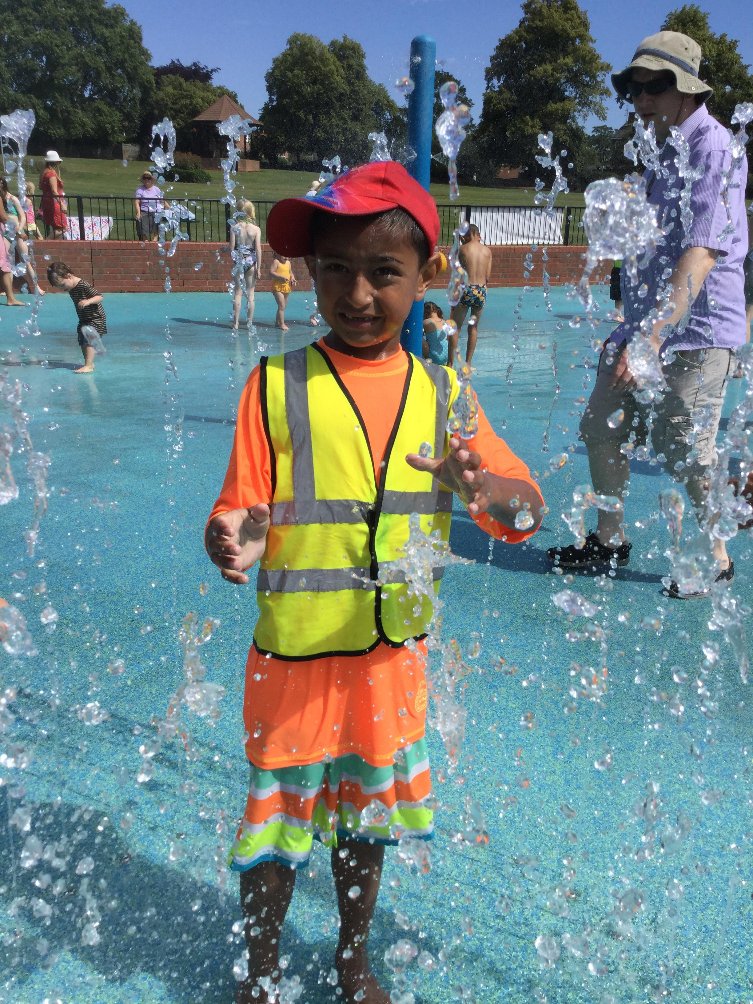 We did splatter painting outside, flicking different coloured paint at the large piece of paper.