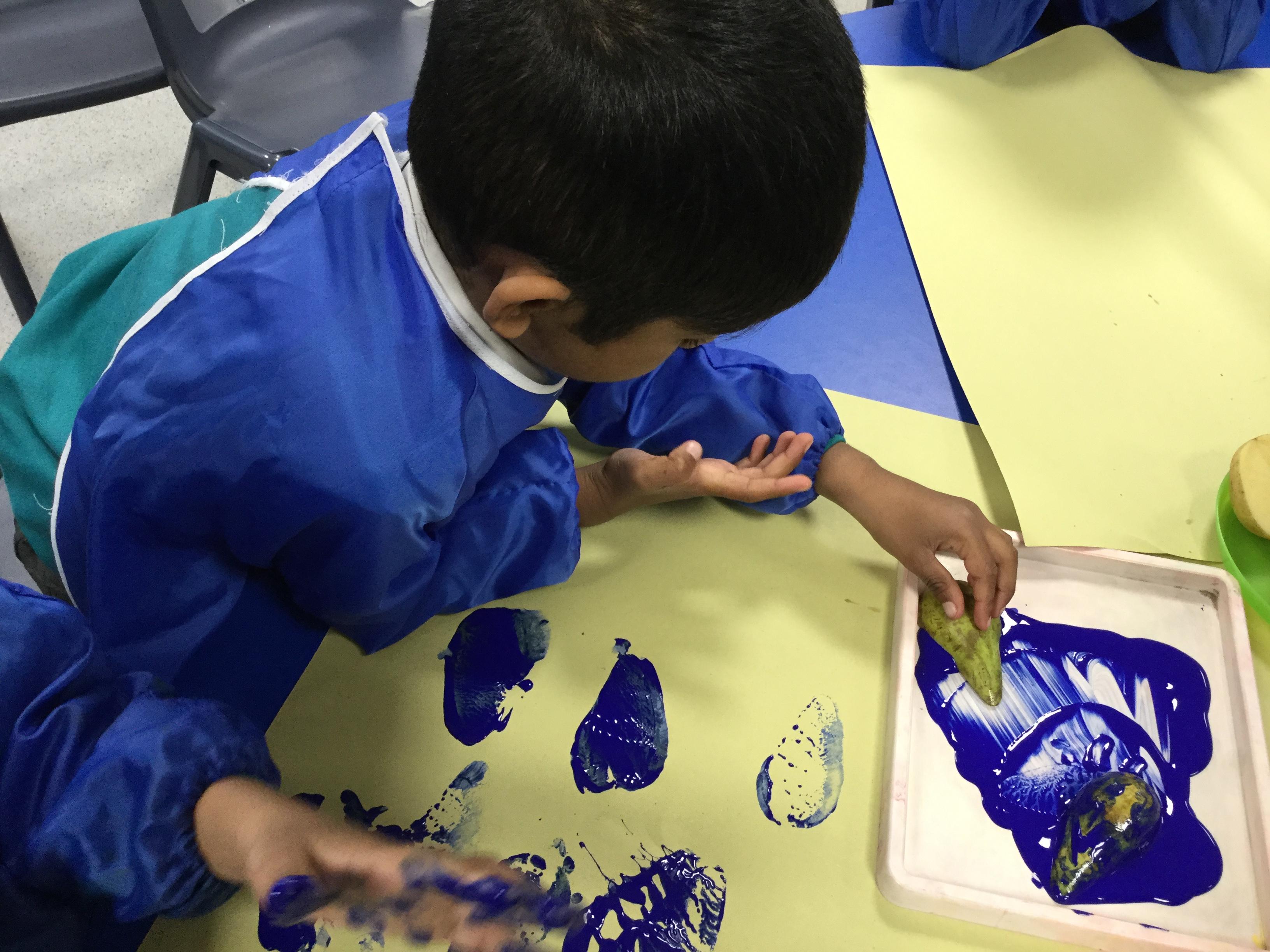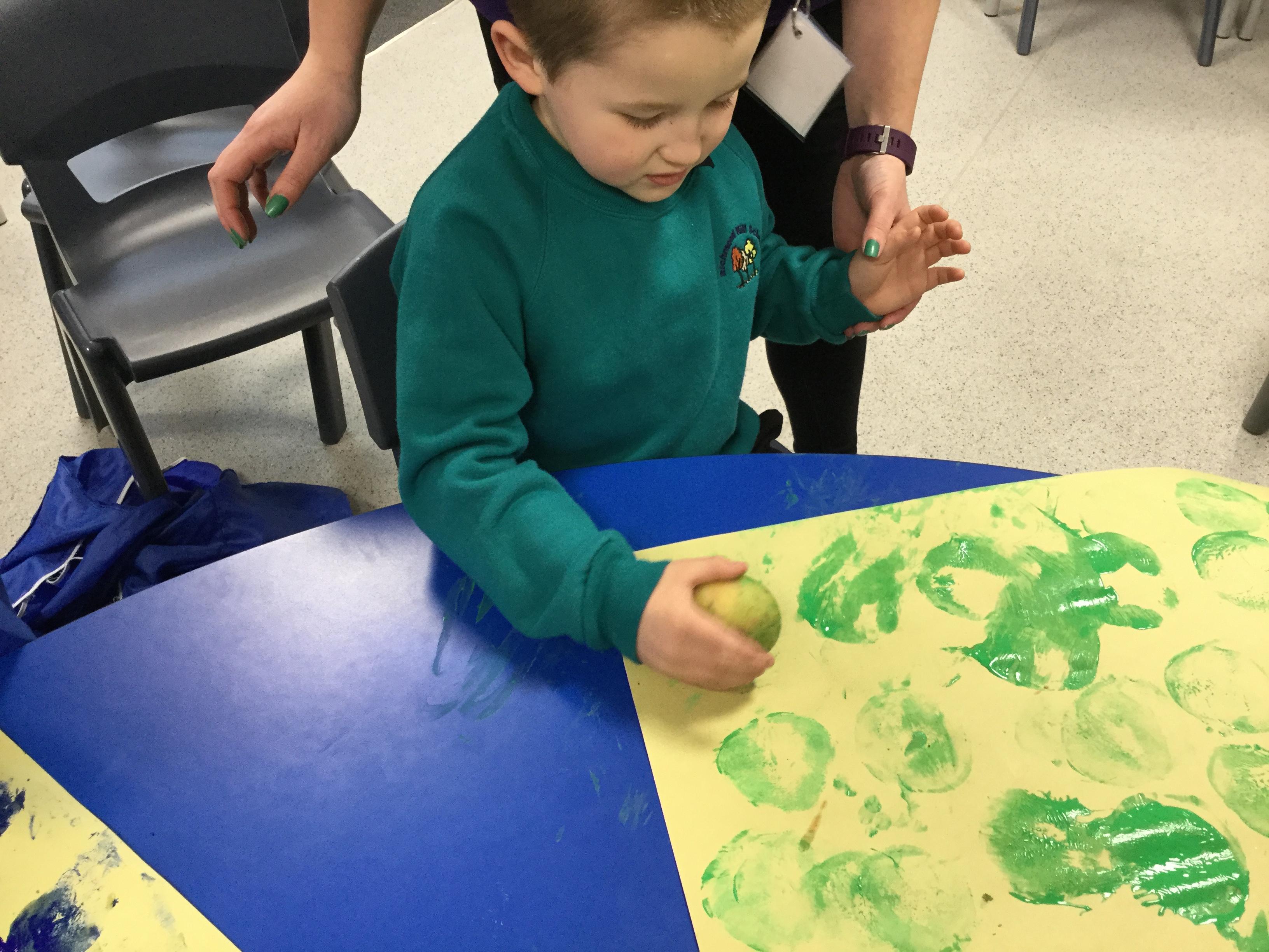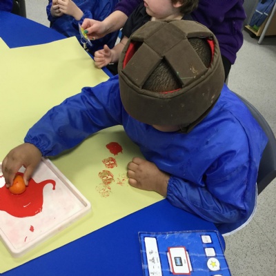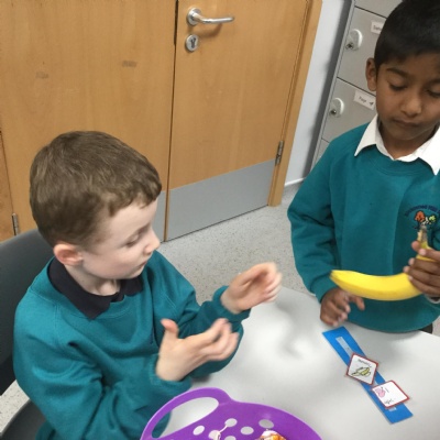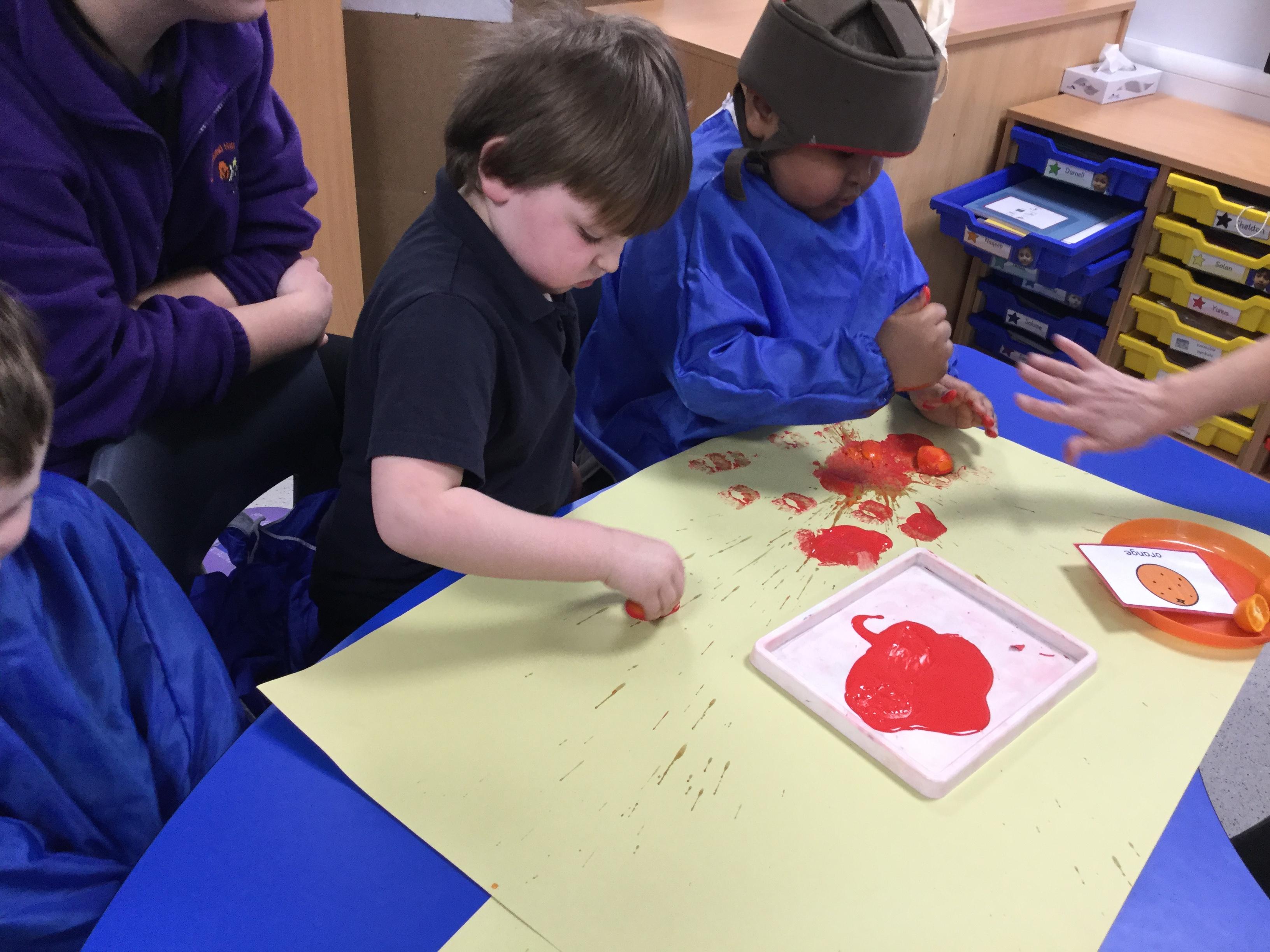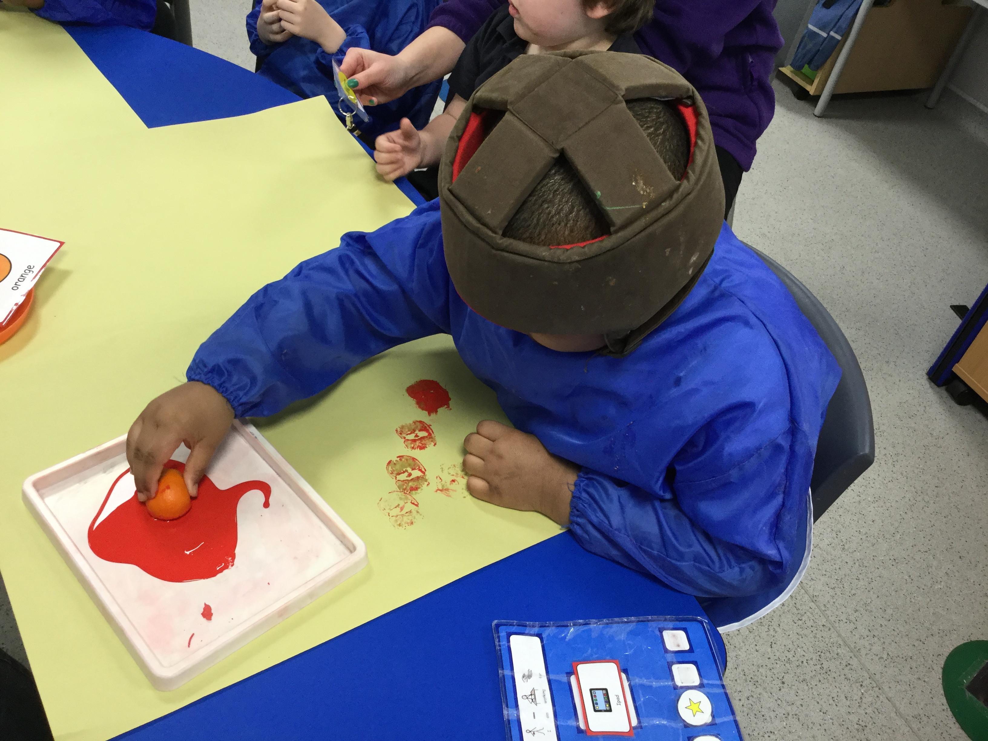 This week we used a variety of fruits and vegetables to do some printing using different colours, using our communication books to request.