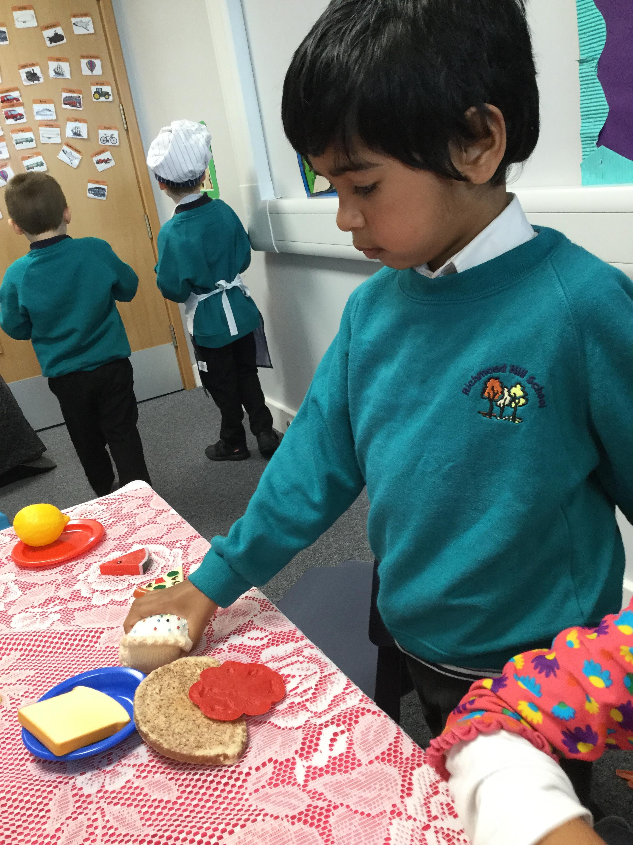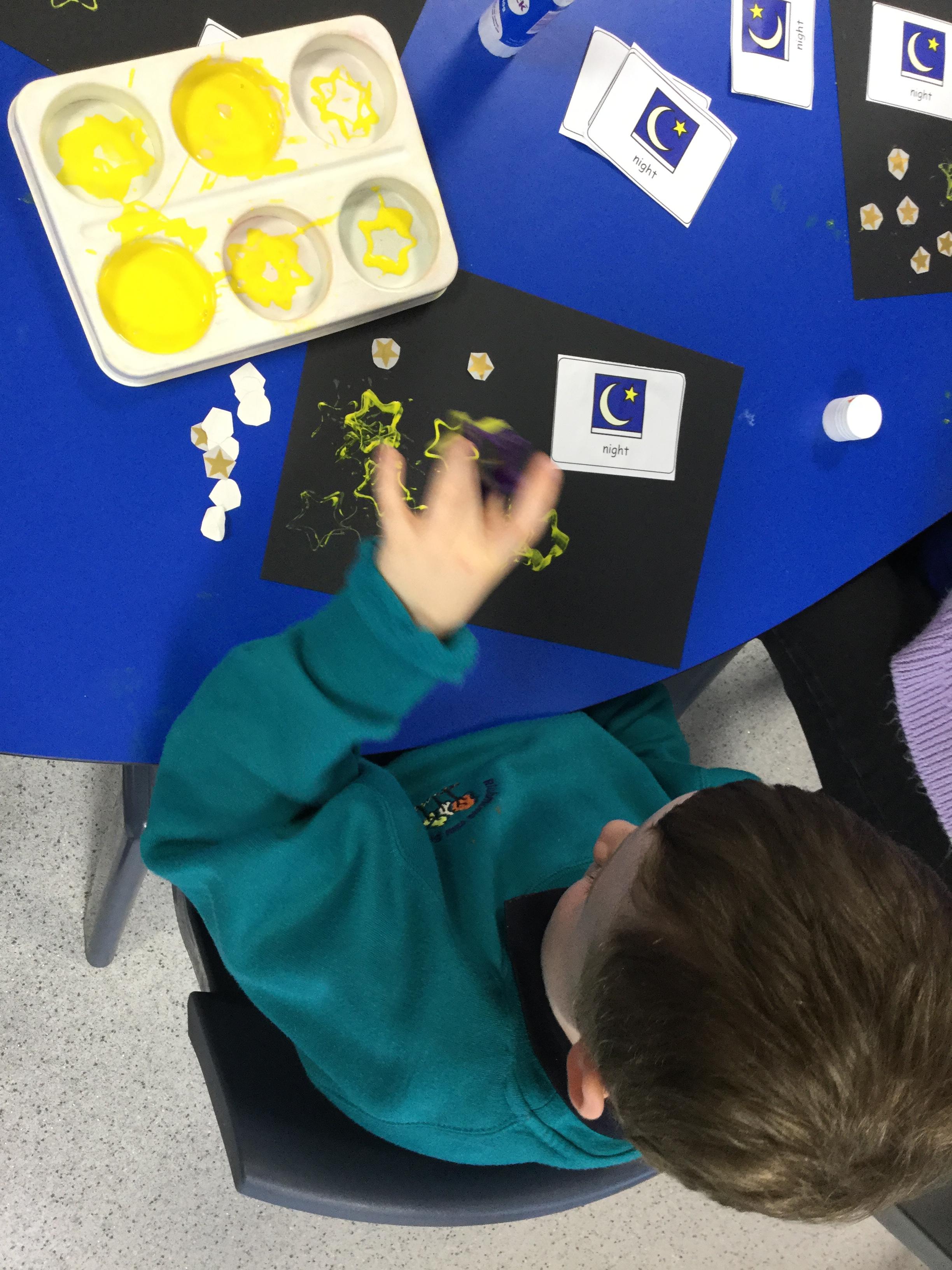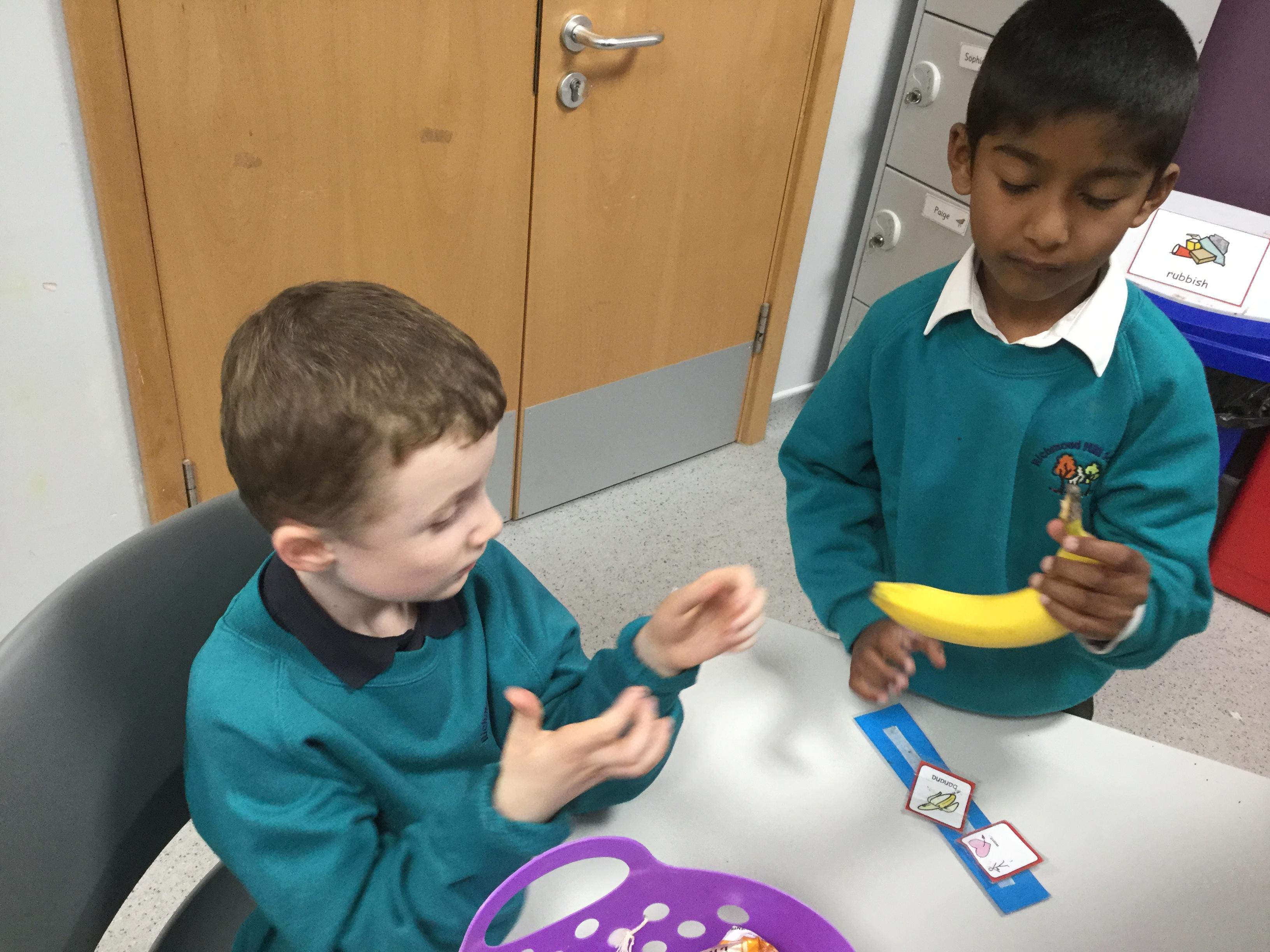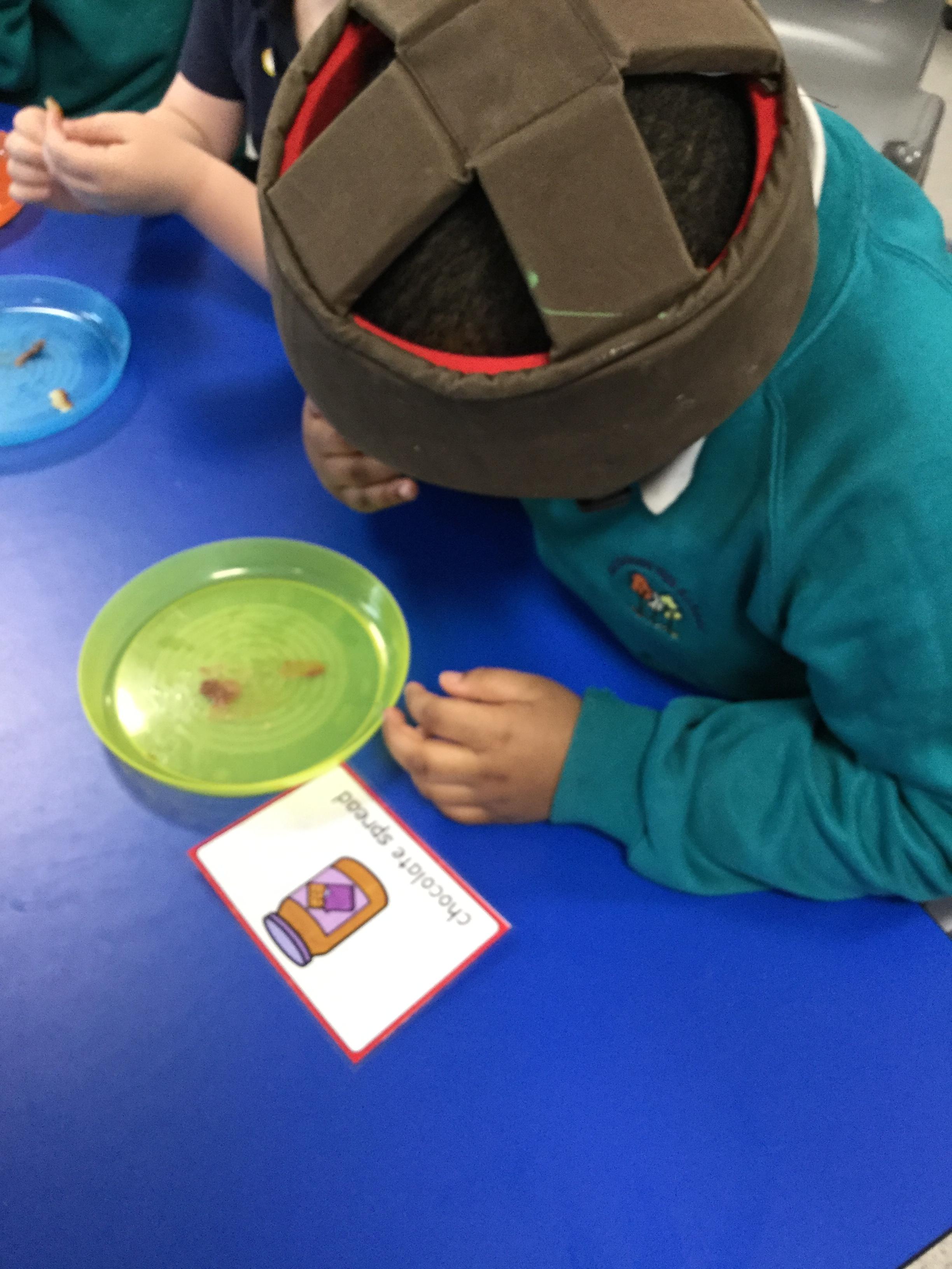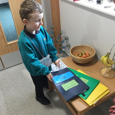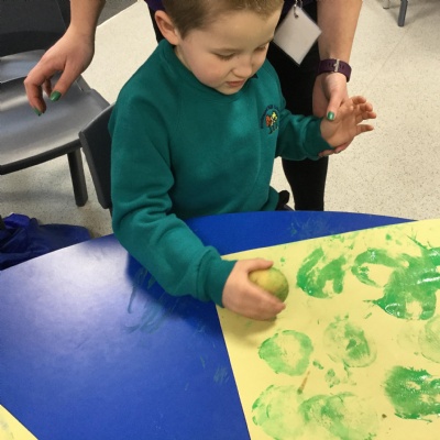 This week we used a variety of fruits and vegetables to do some printing using different colours, using our communication books to request.