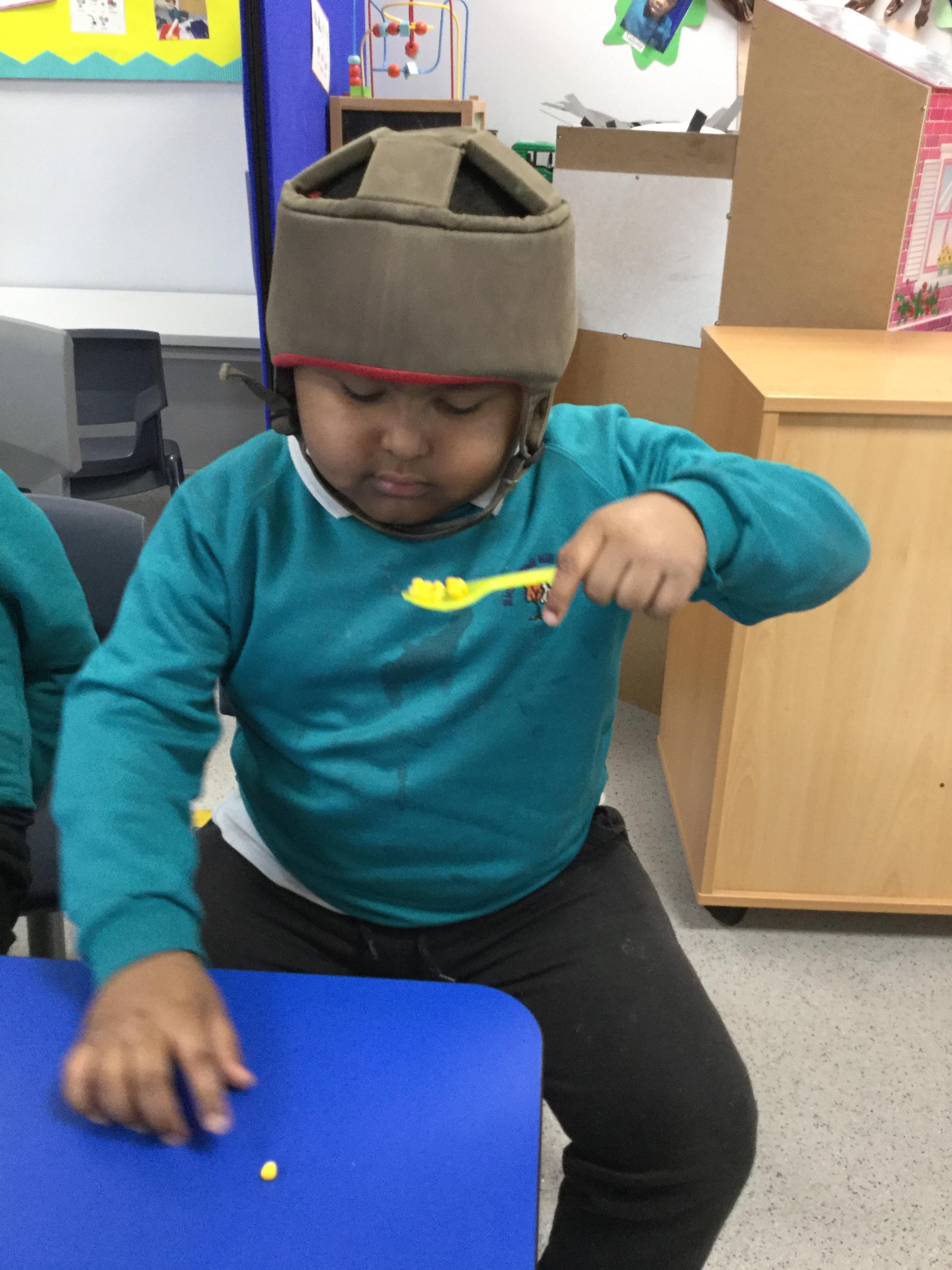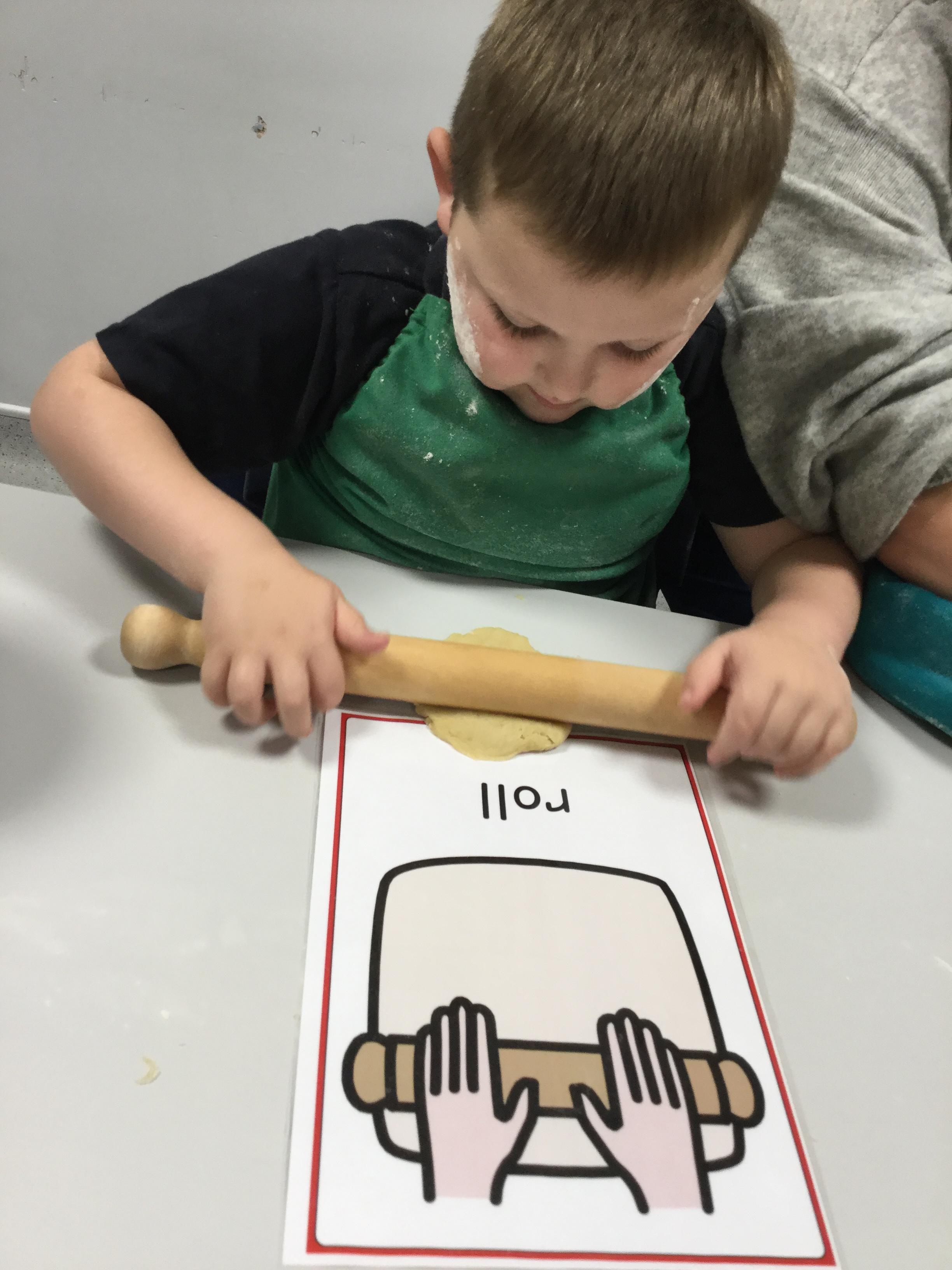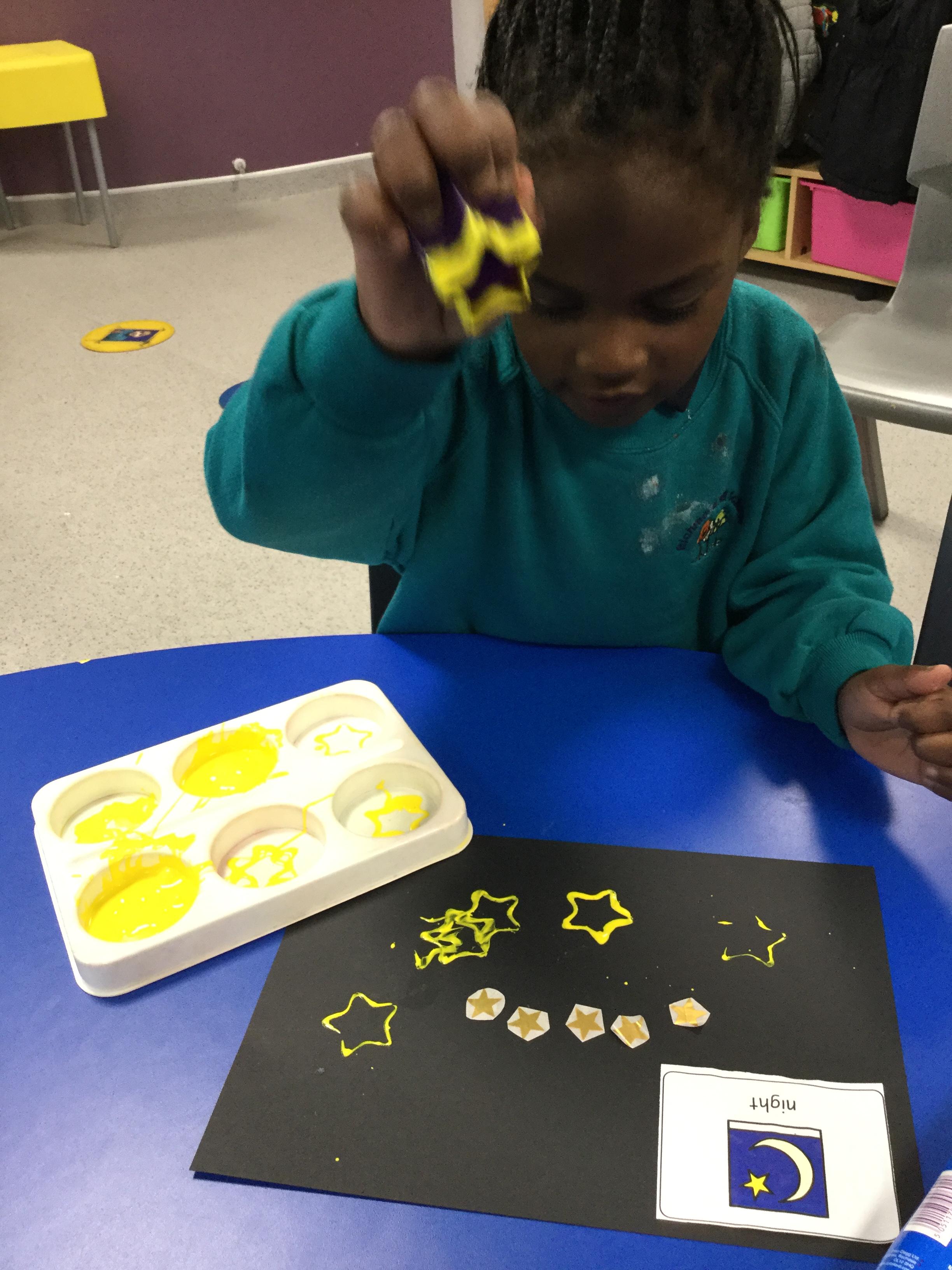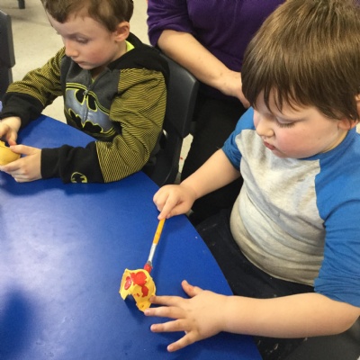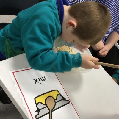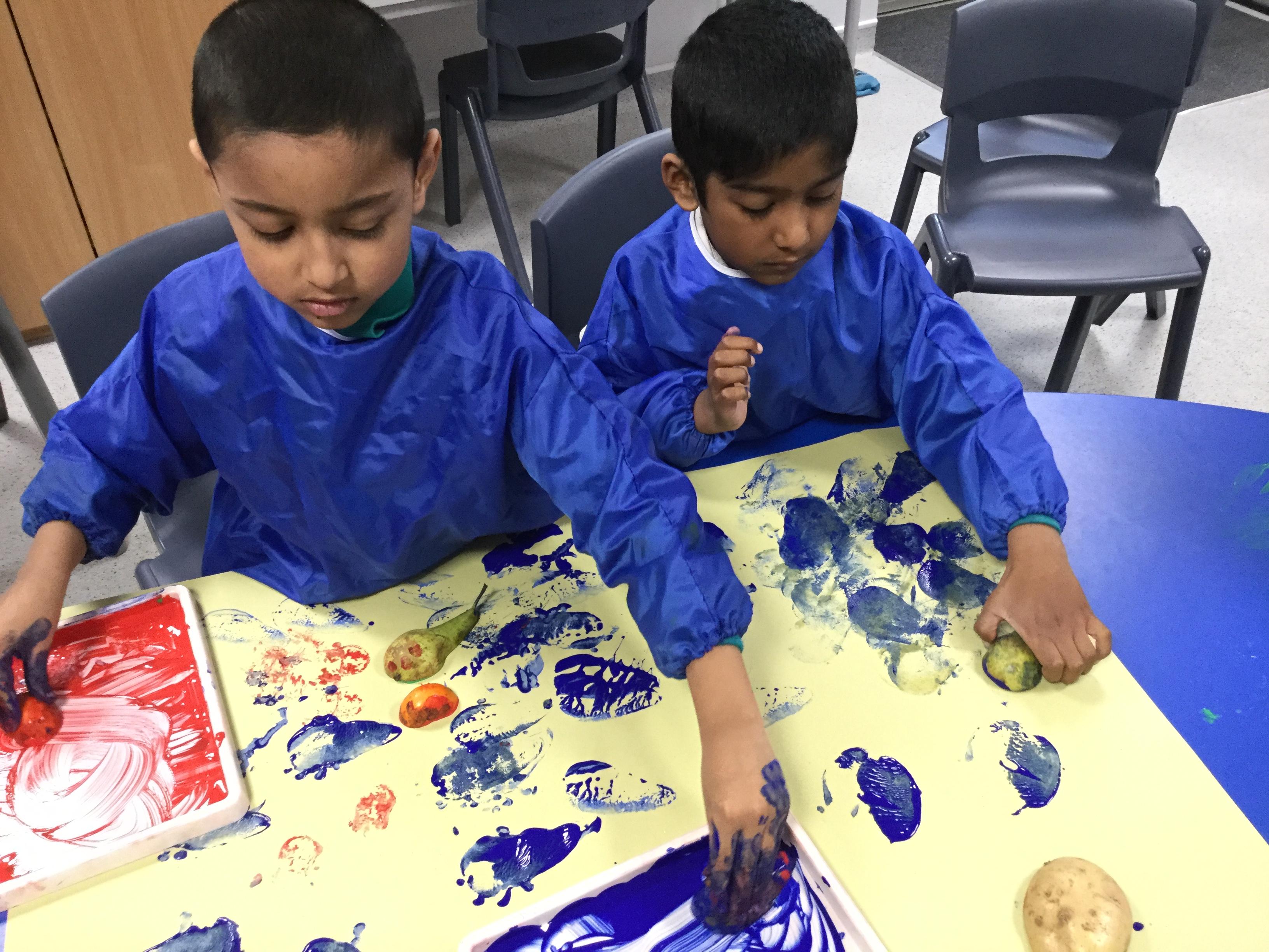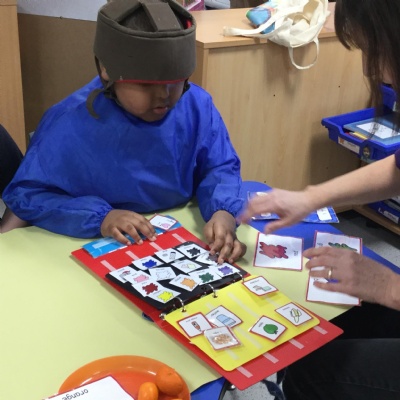 This week we used a variety of fruits and vegetables to do some printing using different colours, using our communication books to request.