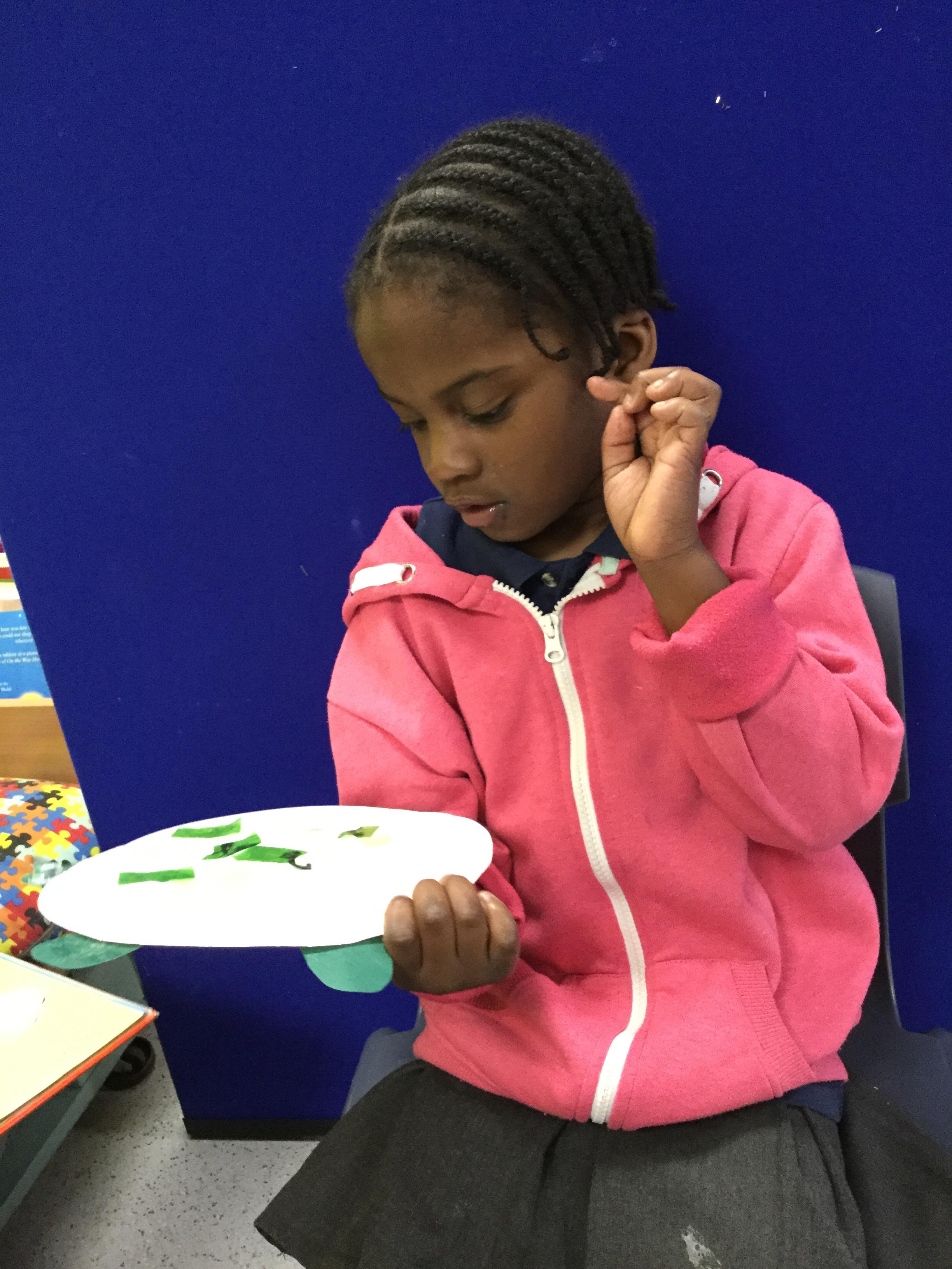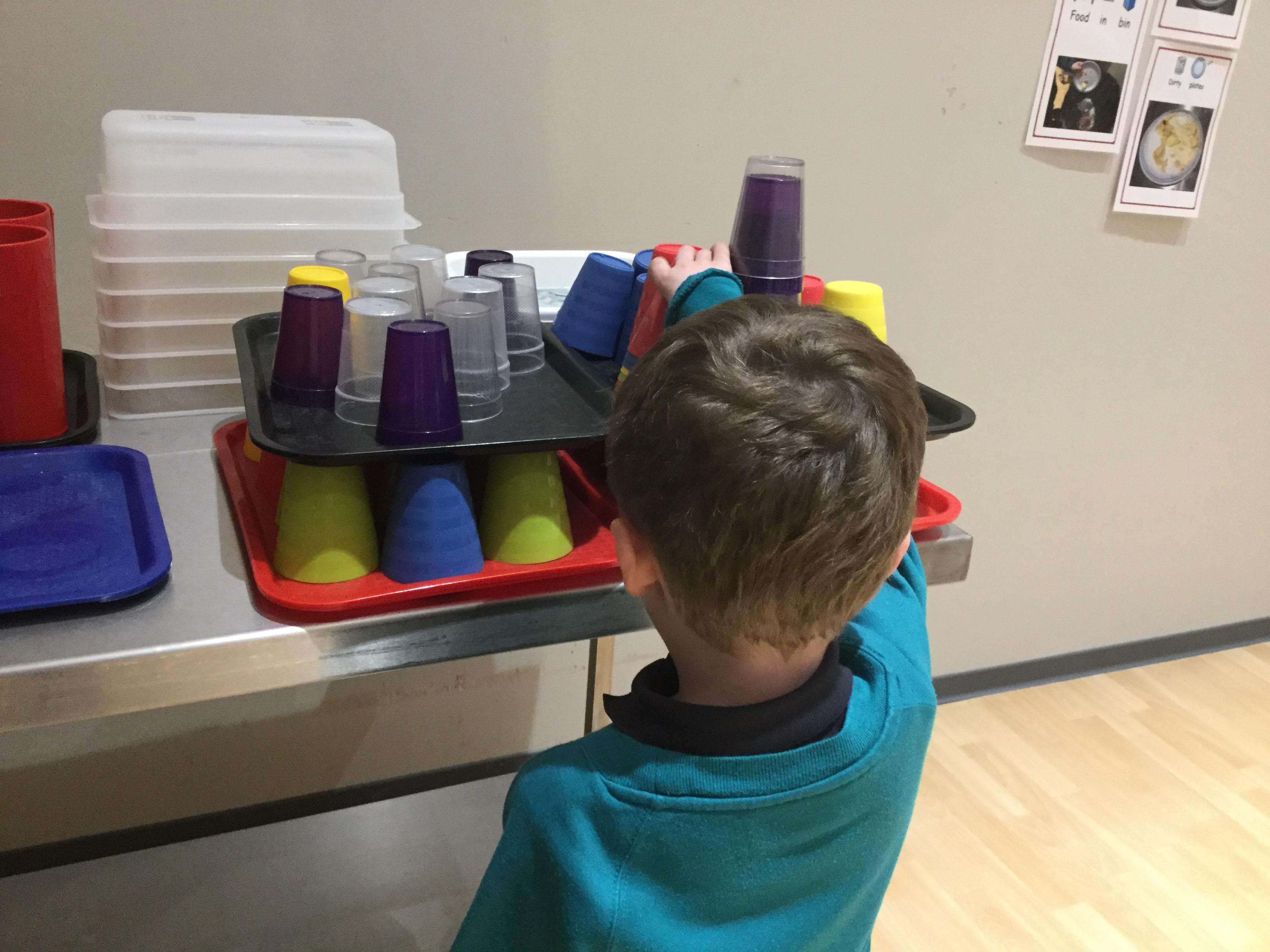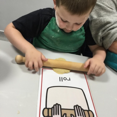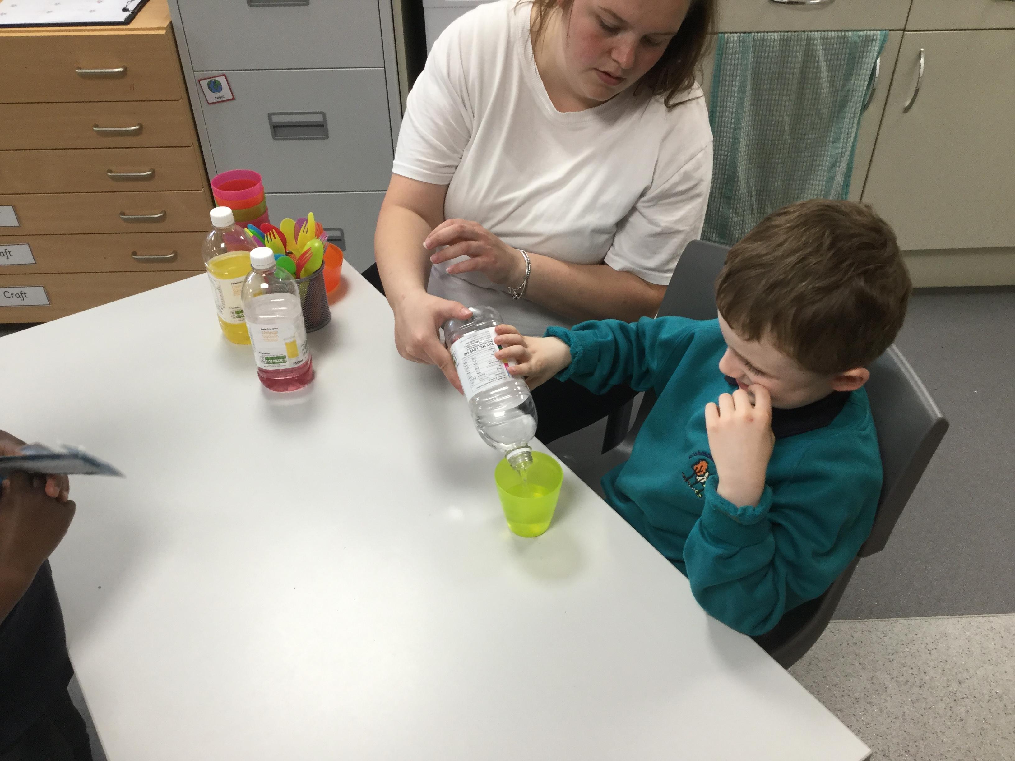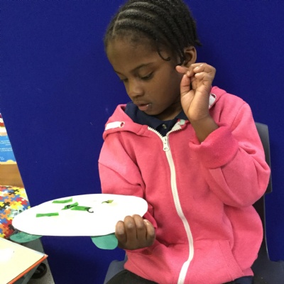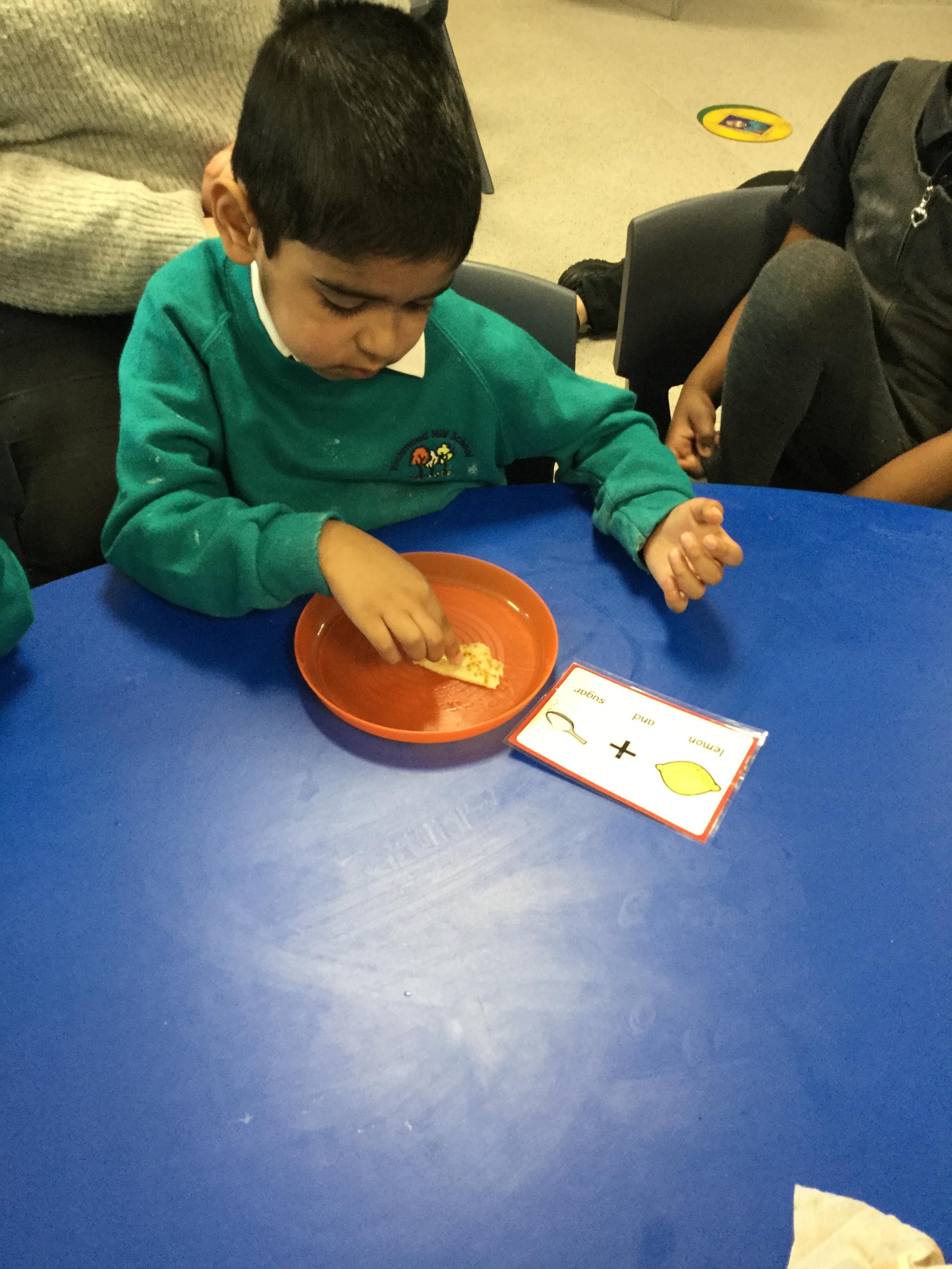 This week we used a variety of fruits and vegetables to do some printing using different colours, using our communication books to request.