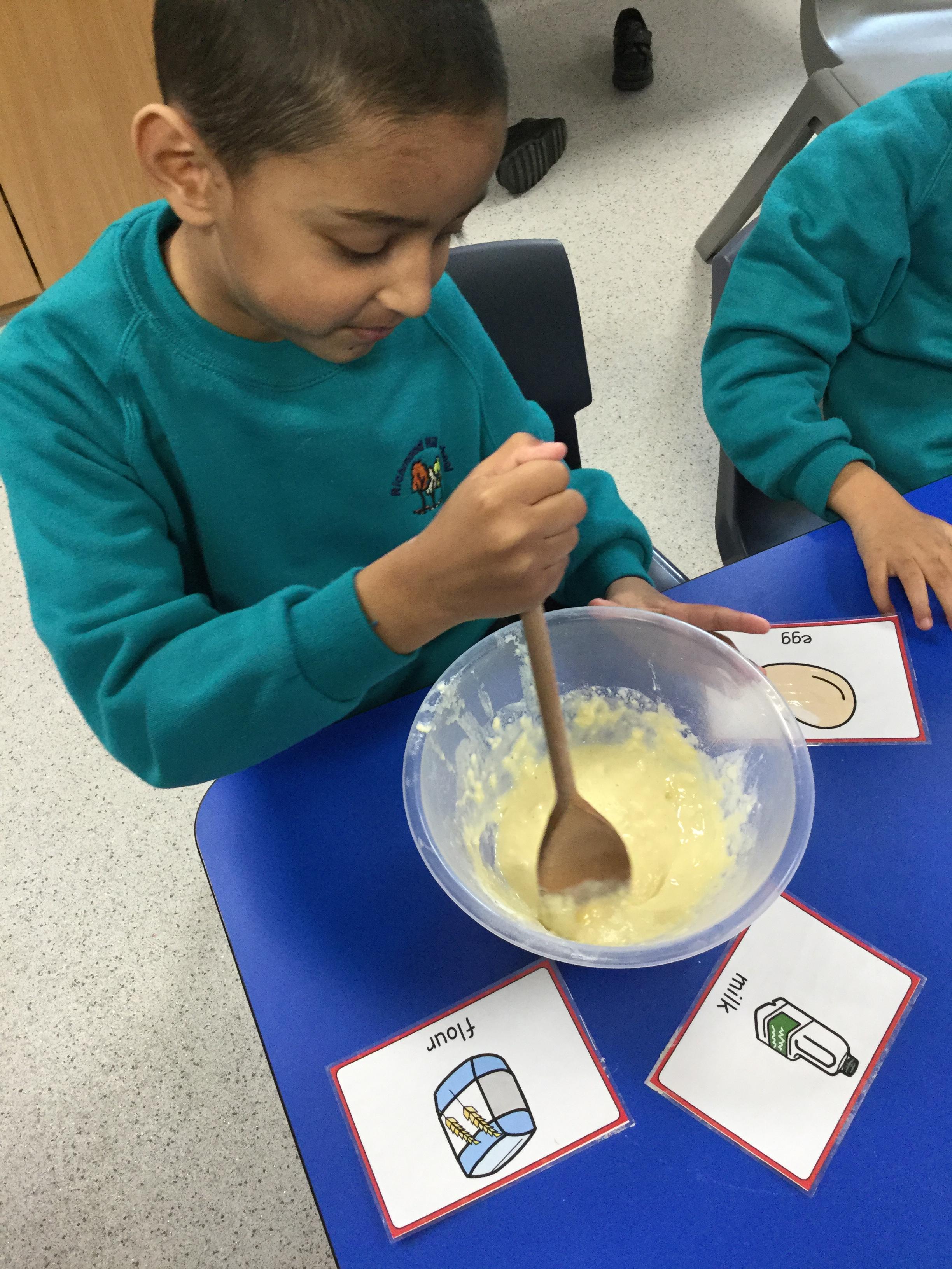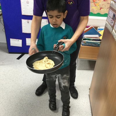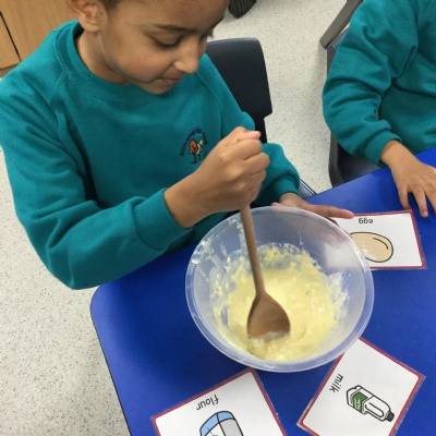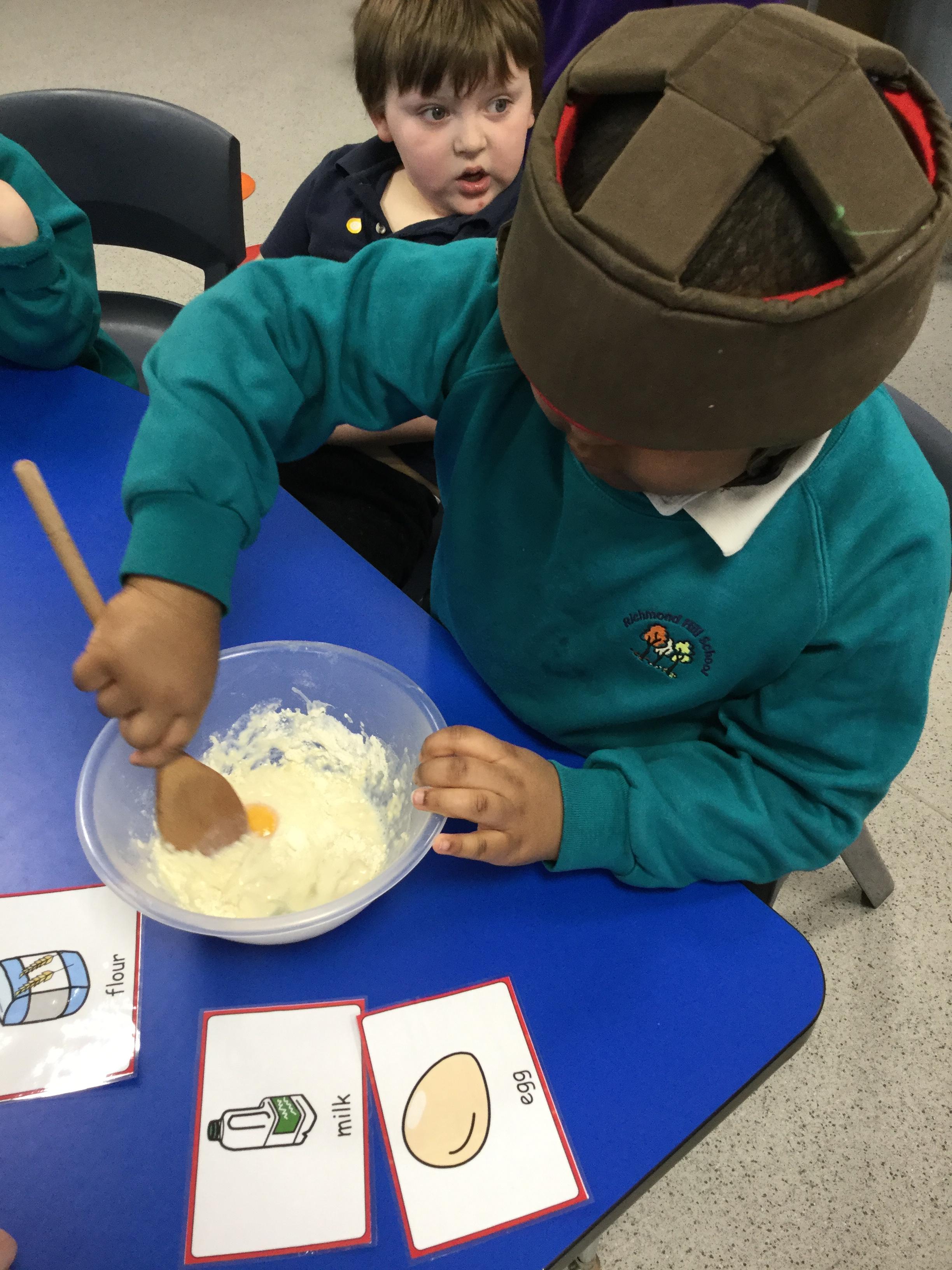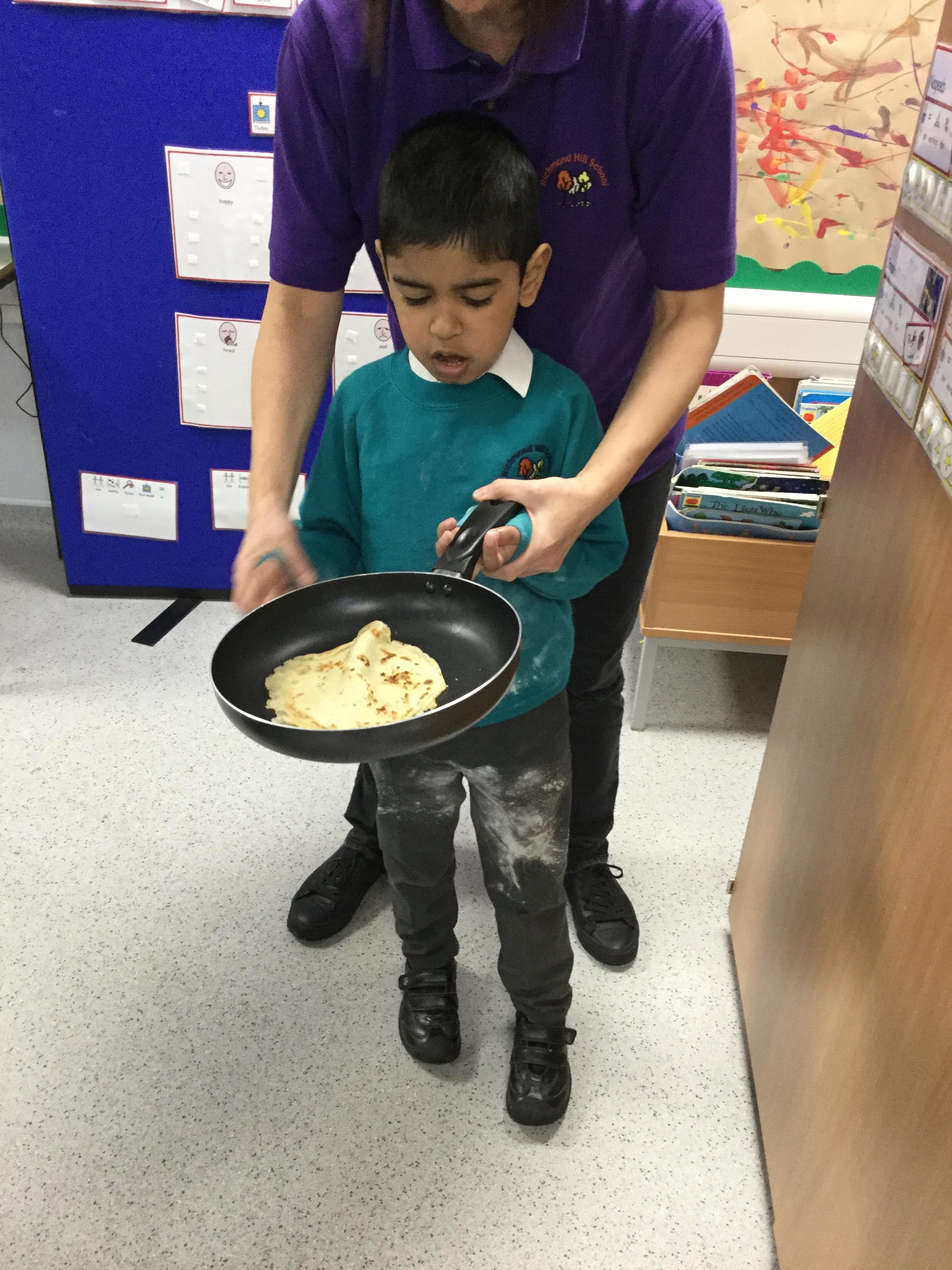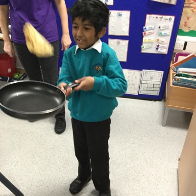 We made pancakes using milk, egg and flour and all had a turn at flipping them. We tasted pancakes with 4 different flavours including sugar and lemon, maple syrup, chocolate spread and jam.