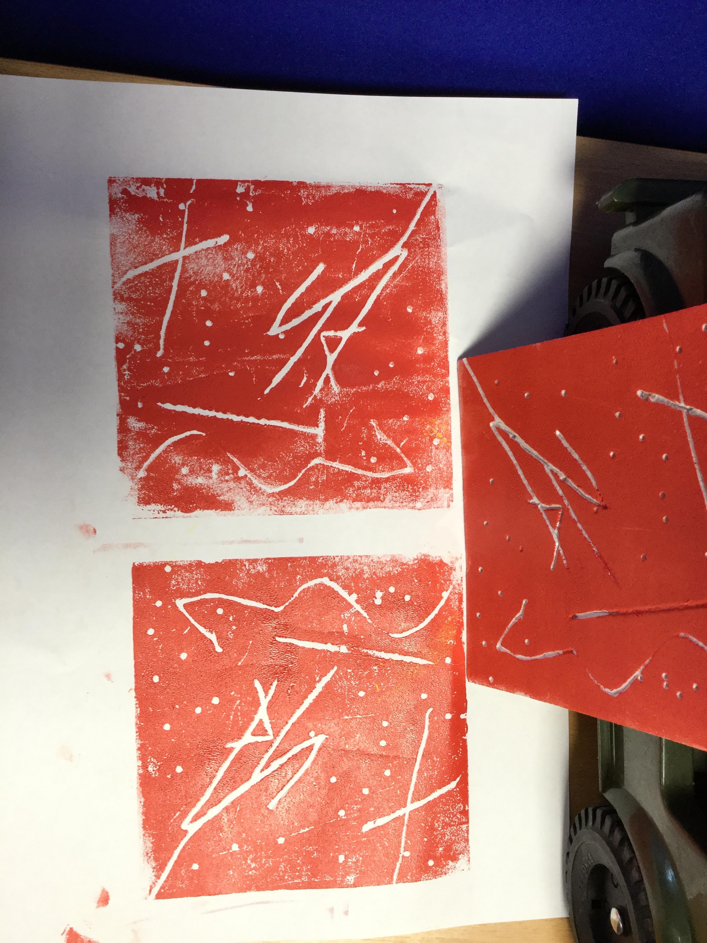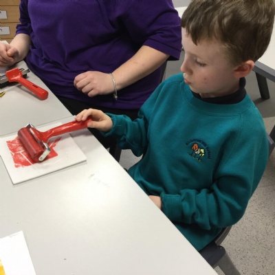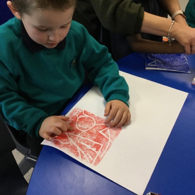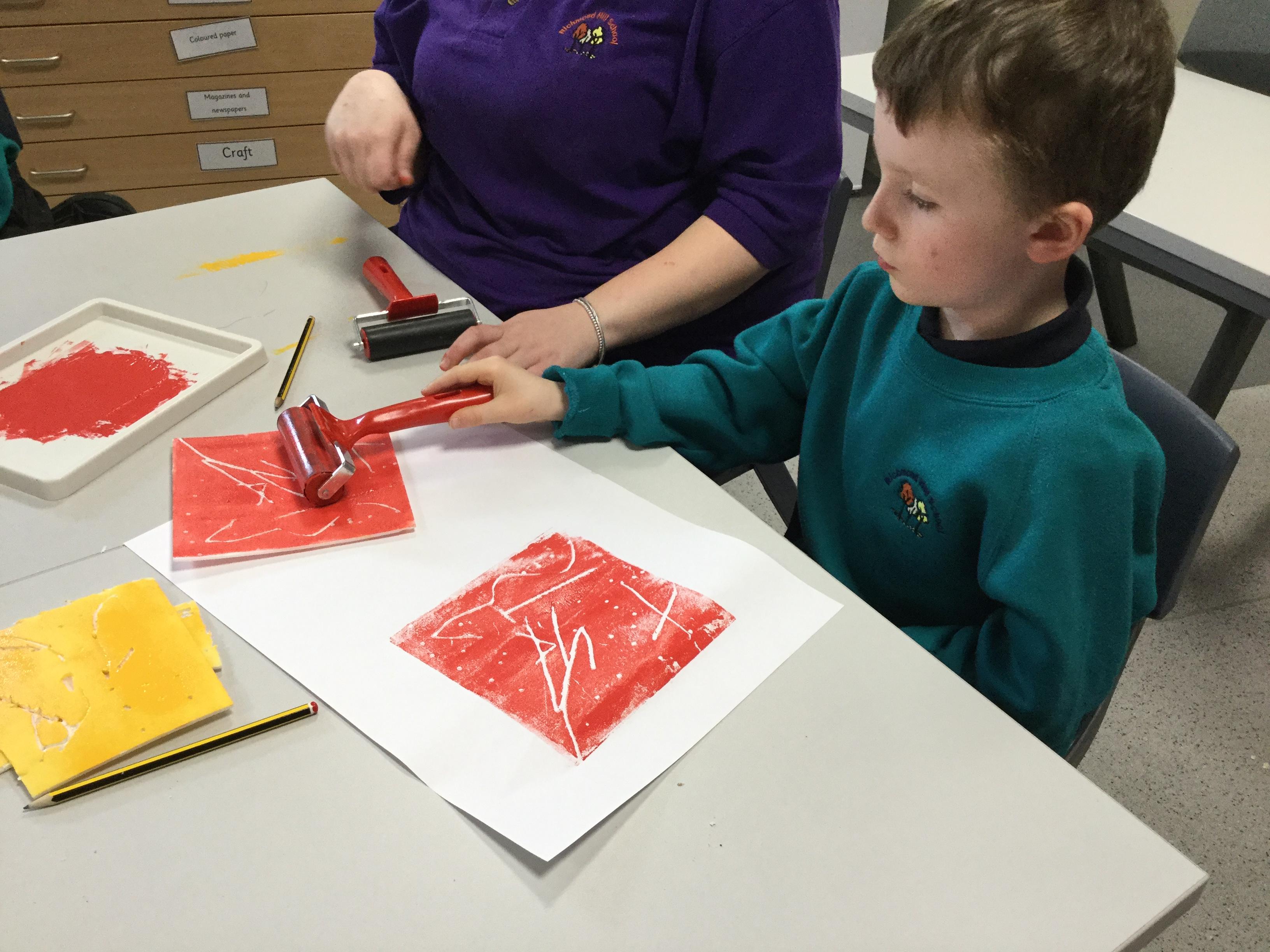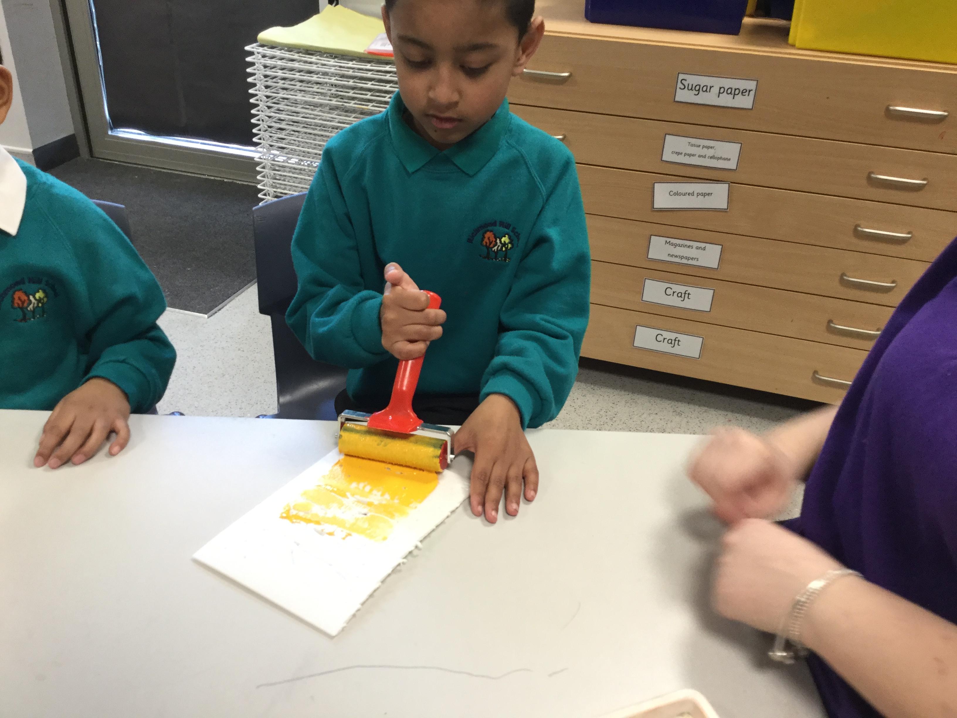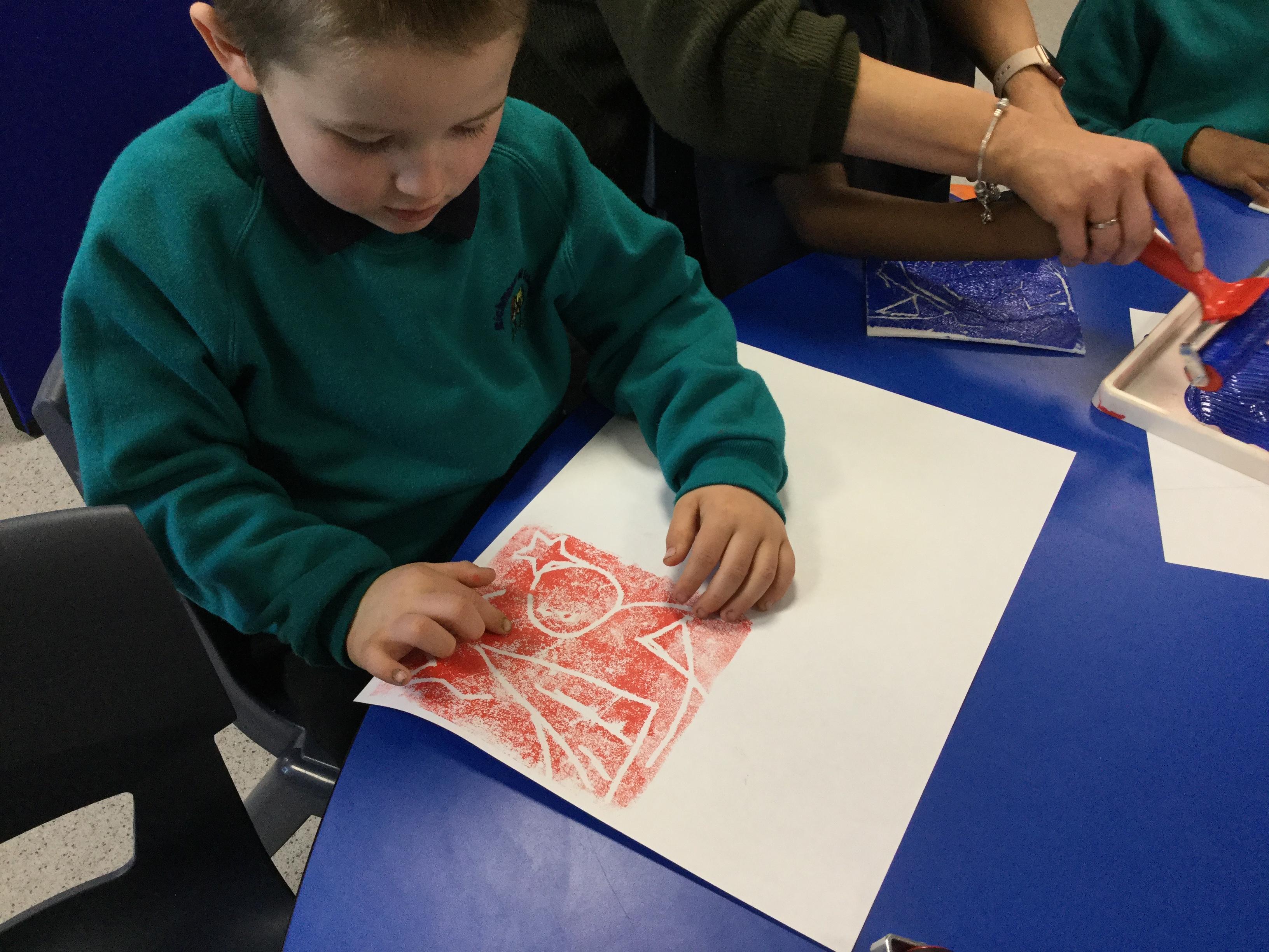 We used a pencil to make marks in our polystyrene tiles. We then chose a colour and painted the time using a roller, we placed our tiles onto a piece of paper and pressed down on it. We lifted the tile to reveal the print.