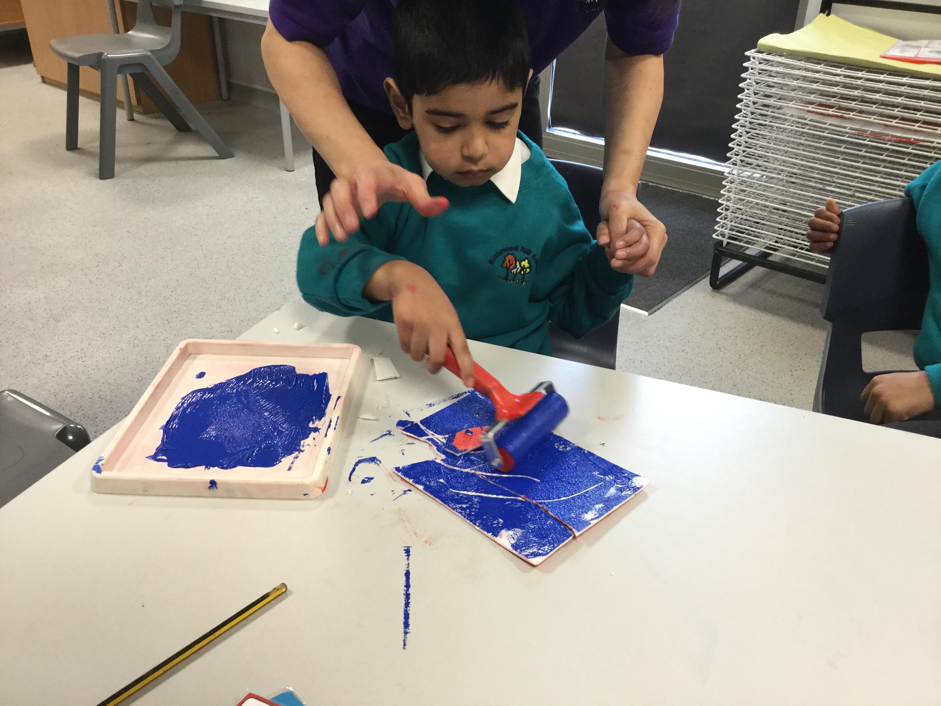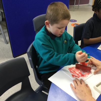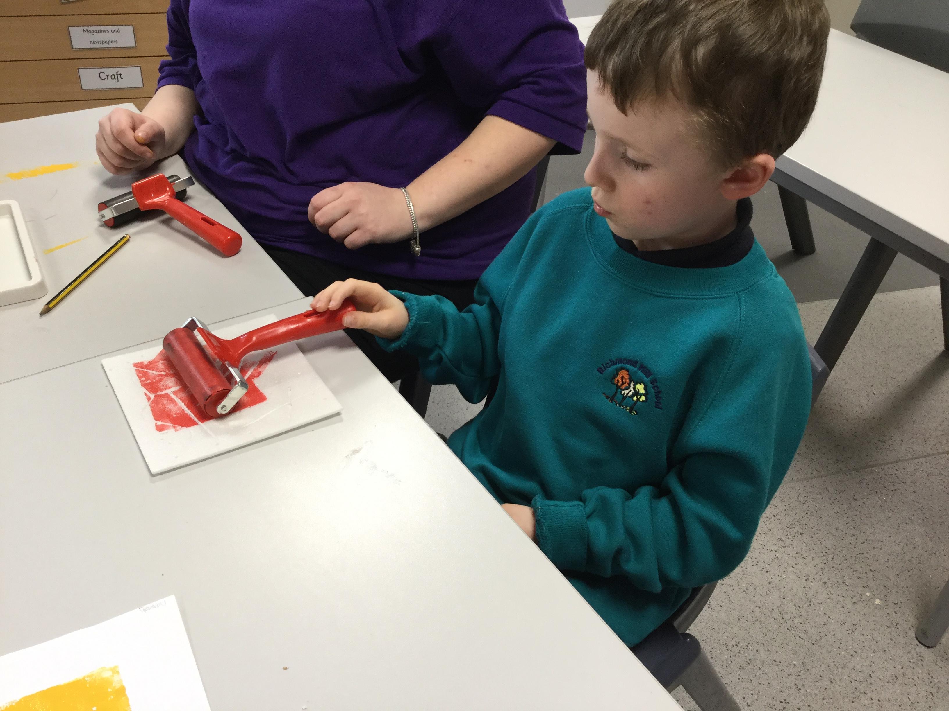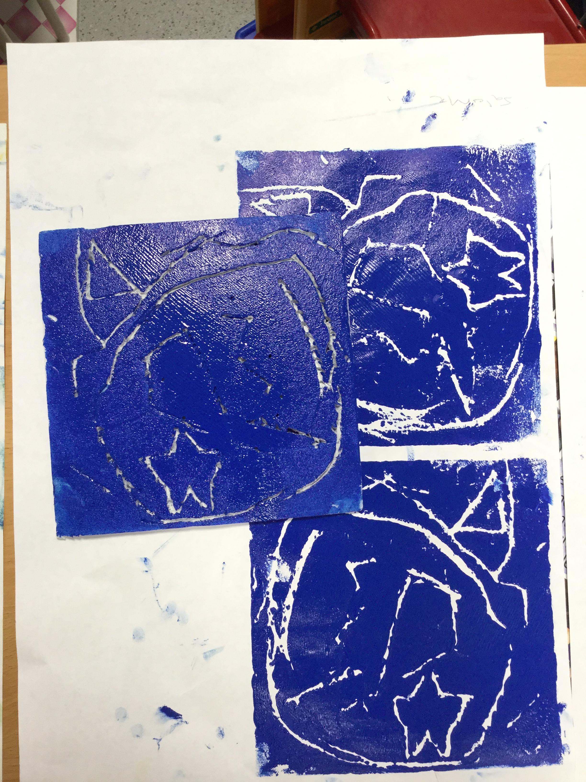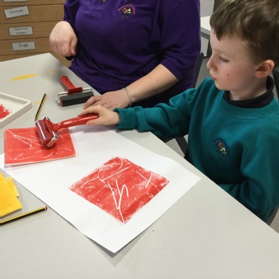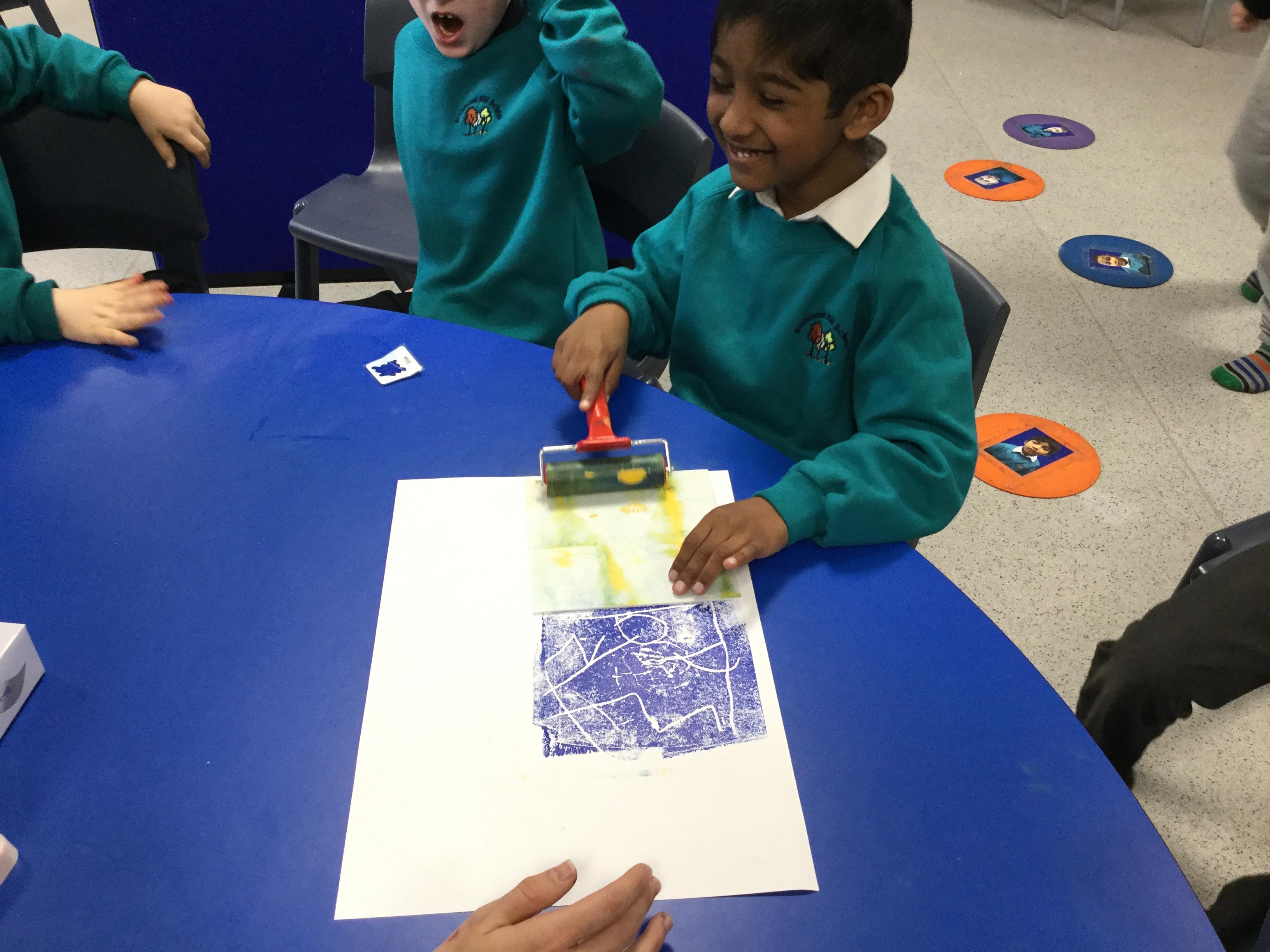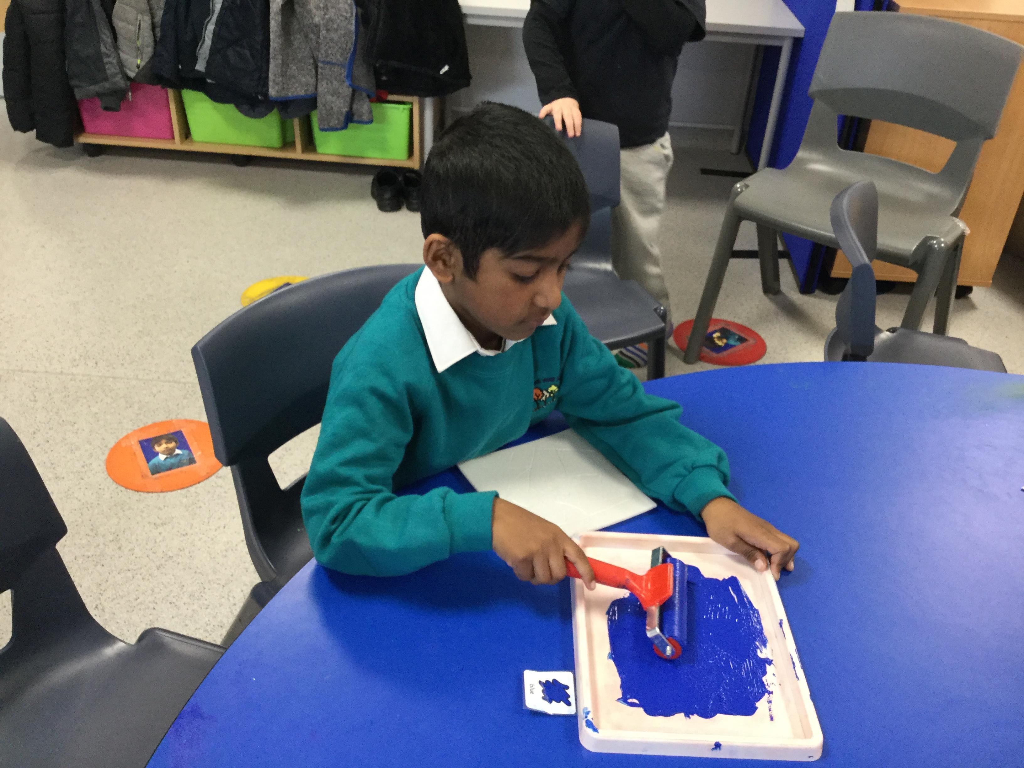 We used a pencil to make marks in our polystyrene tiles. We then chose a colour and painted the time using a roller, we placed our tiles onto a piece of paper and pressed down on it. We lifted the tile to reveal the print.