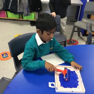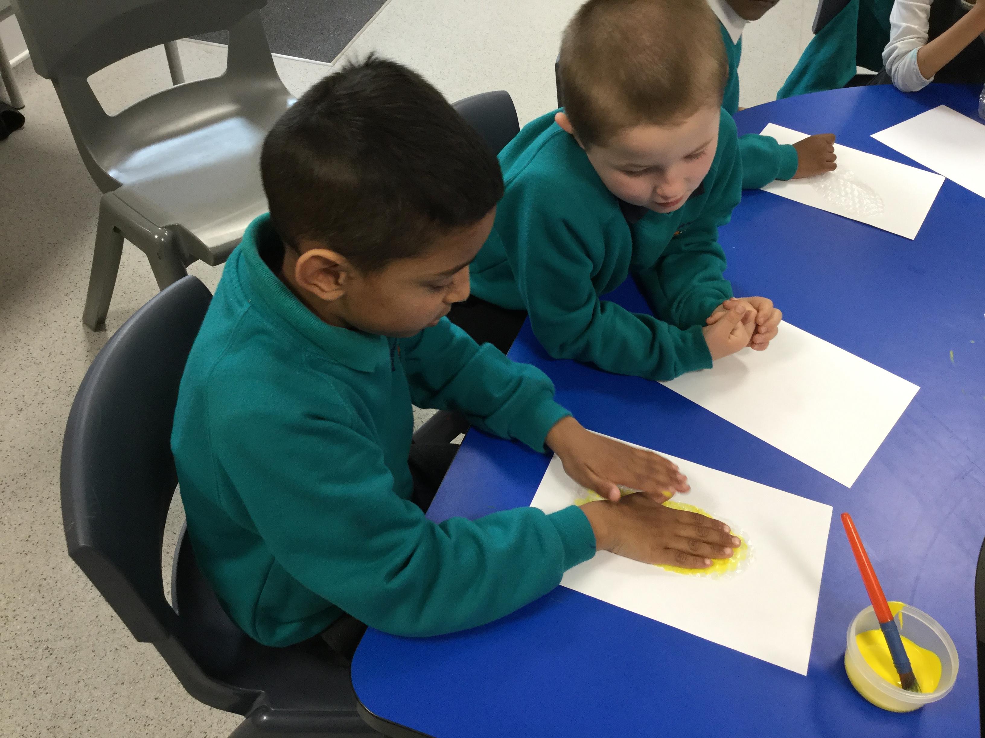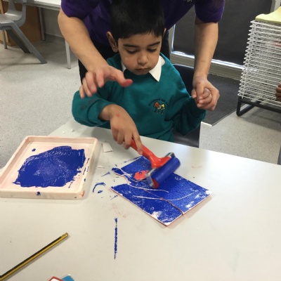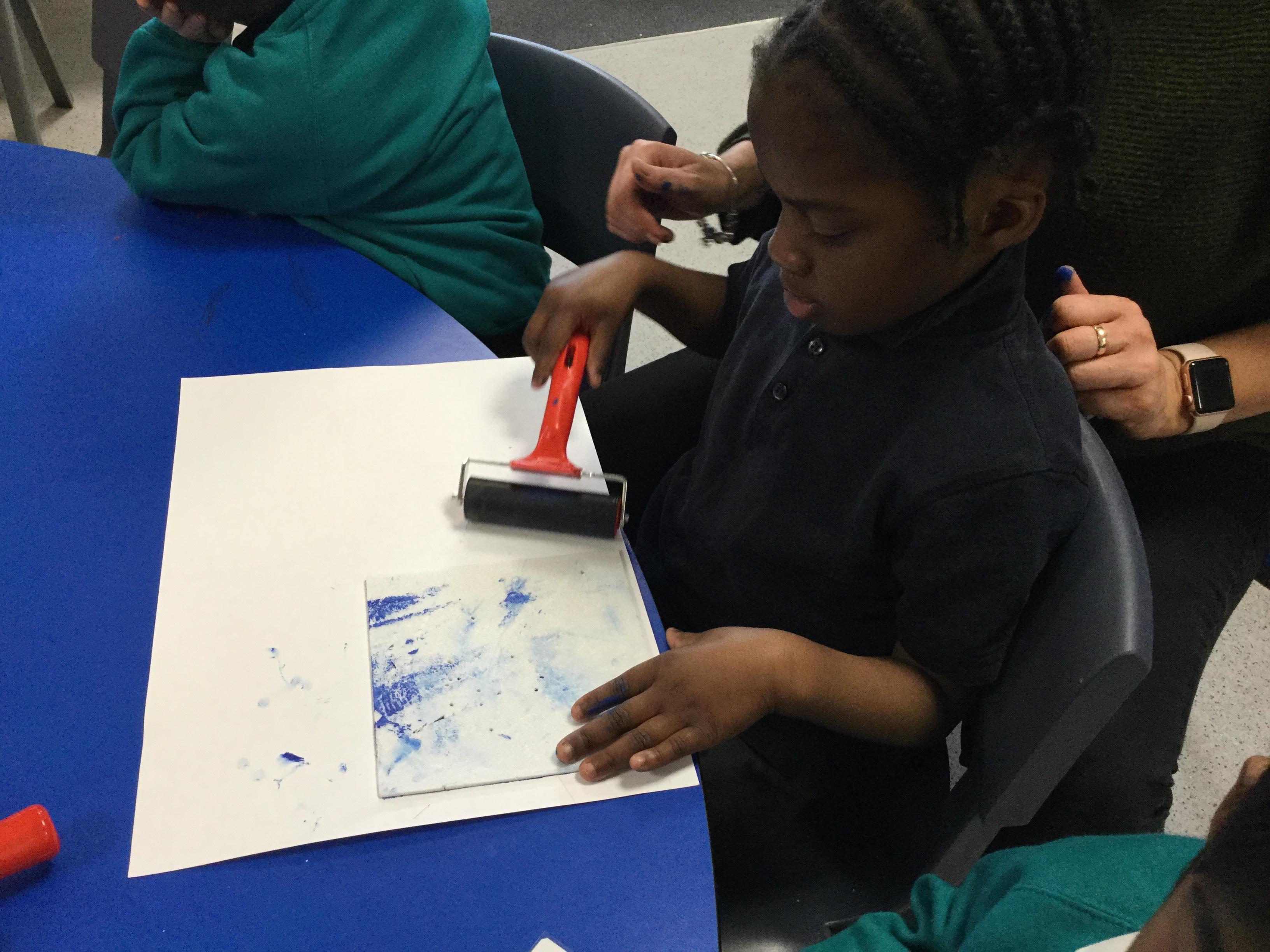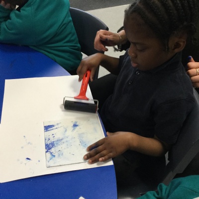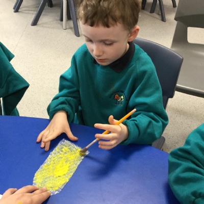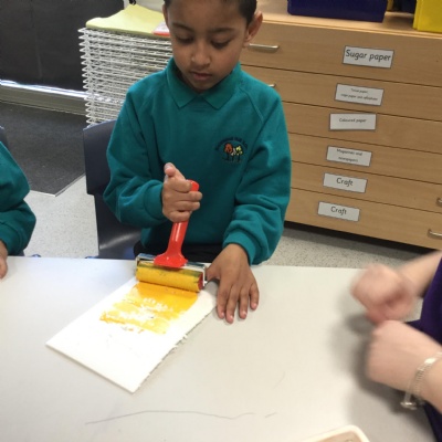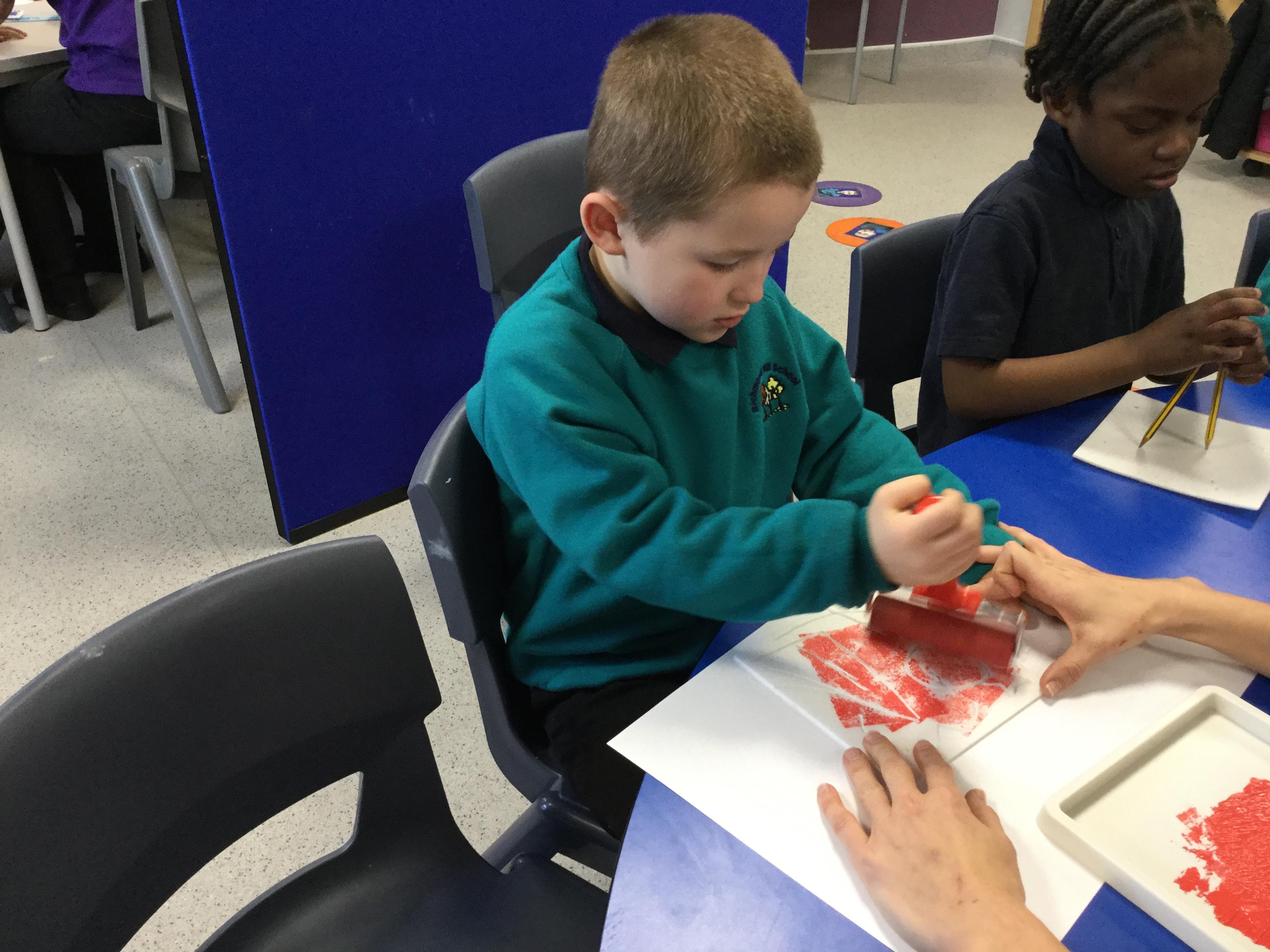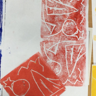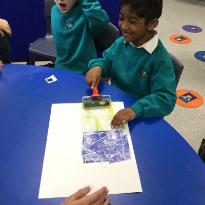 We used a pencil to make marks in our polystyrene tiles. We then chose a colour and painted the time using a roller, we placed our tiles onto a piece of paper and pressed down on it. We lifted the tile to reveal the print.