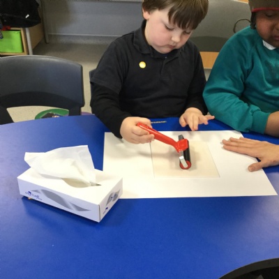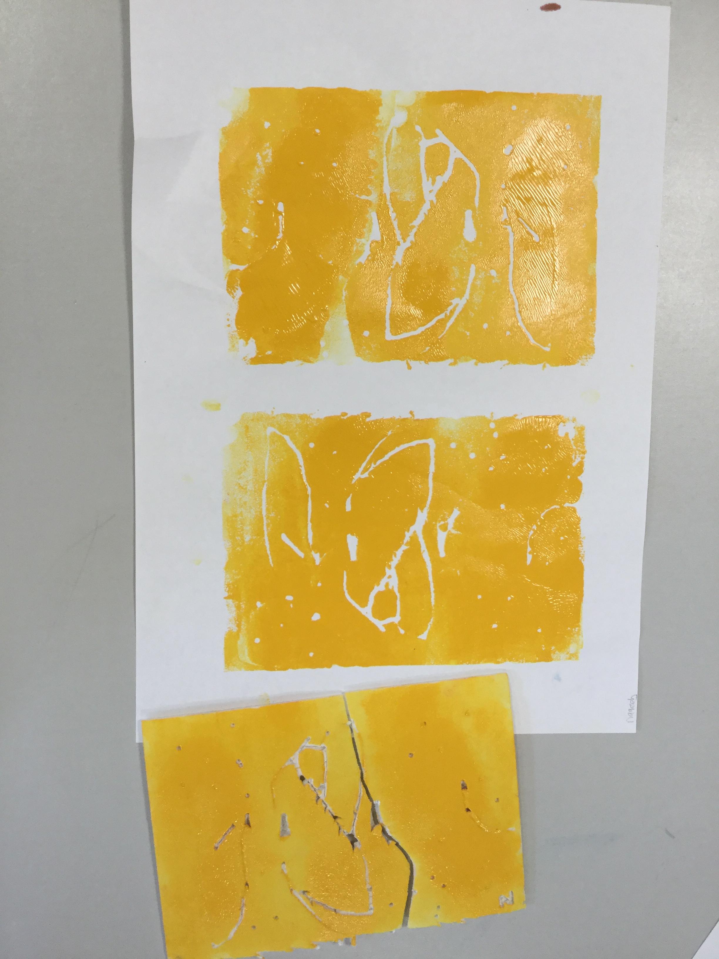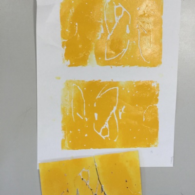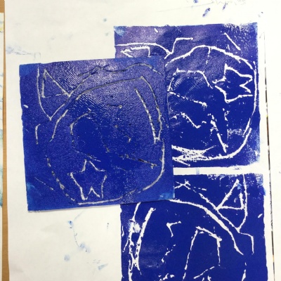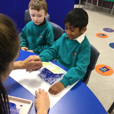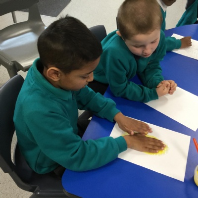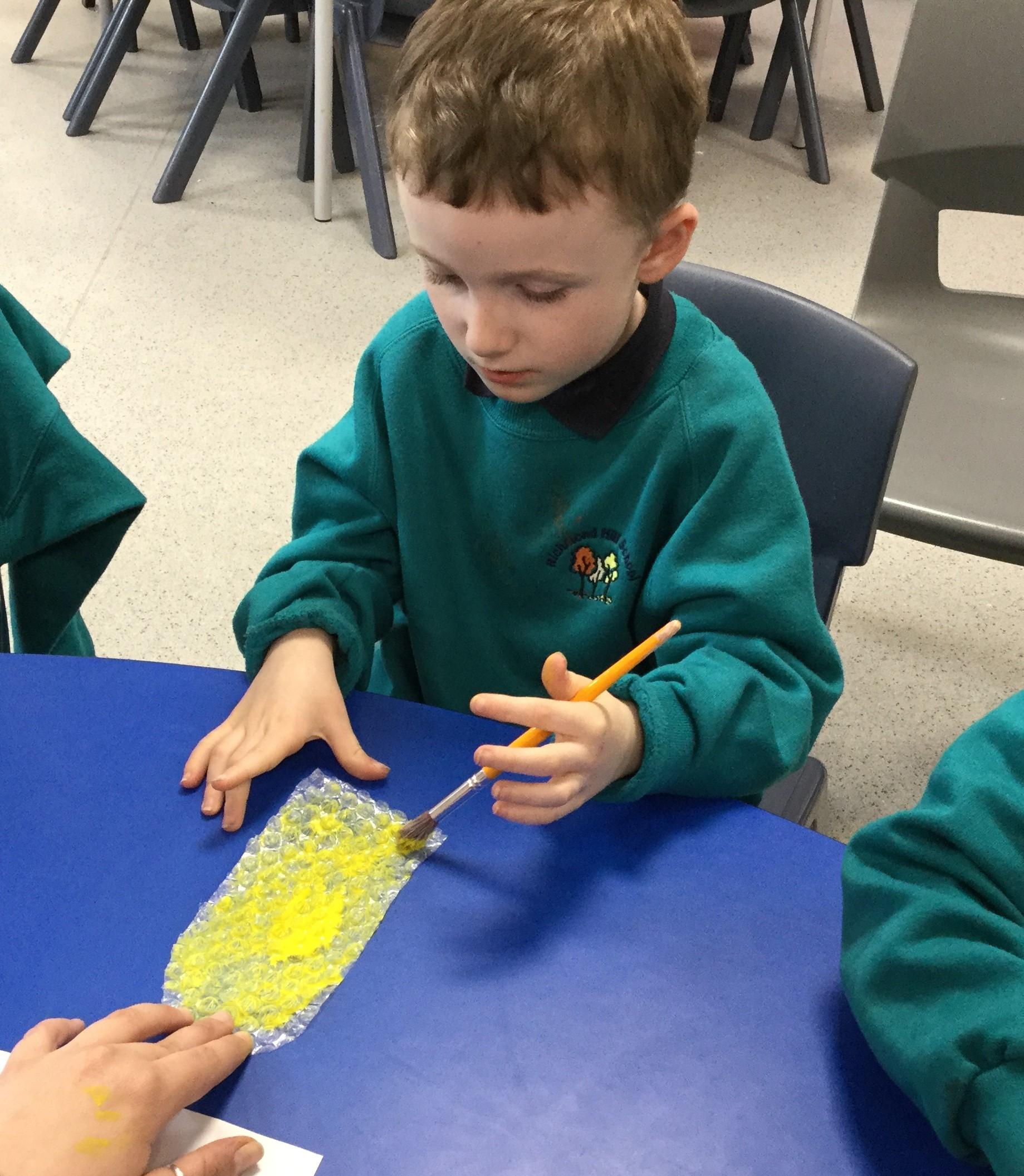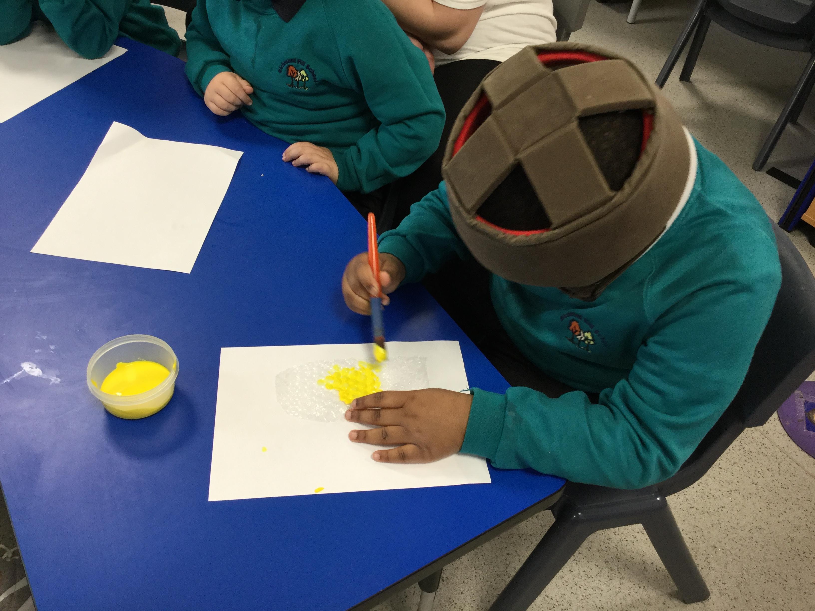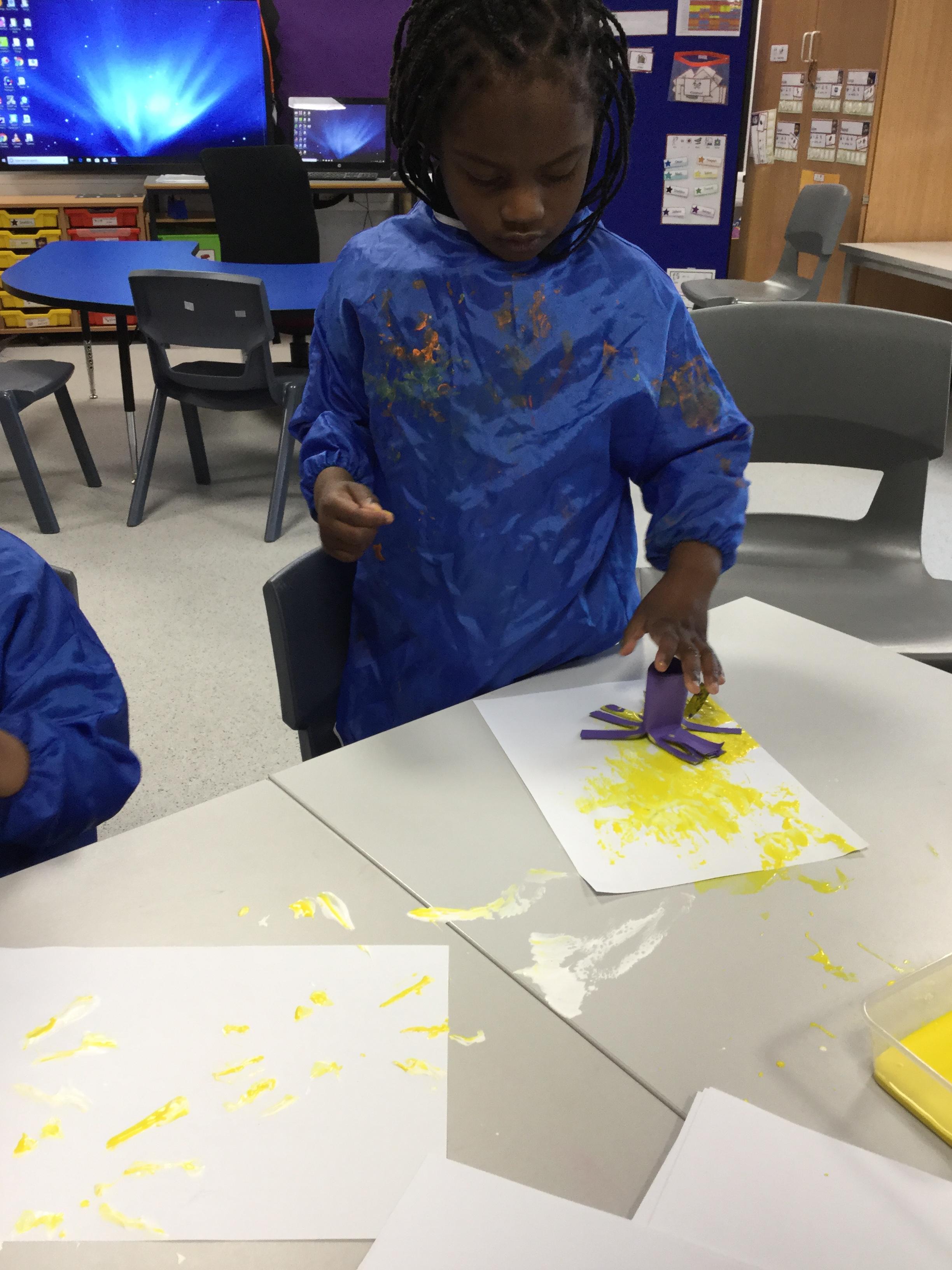 We used a pencil to make marks in our polystyrene tiles. We then chose a colour and painted the time using a roller, we placed our tiles onto a piece of paper and pressed down on it. We lifted the tile to reveal the print.