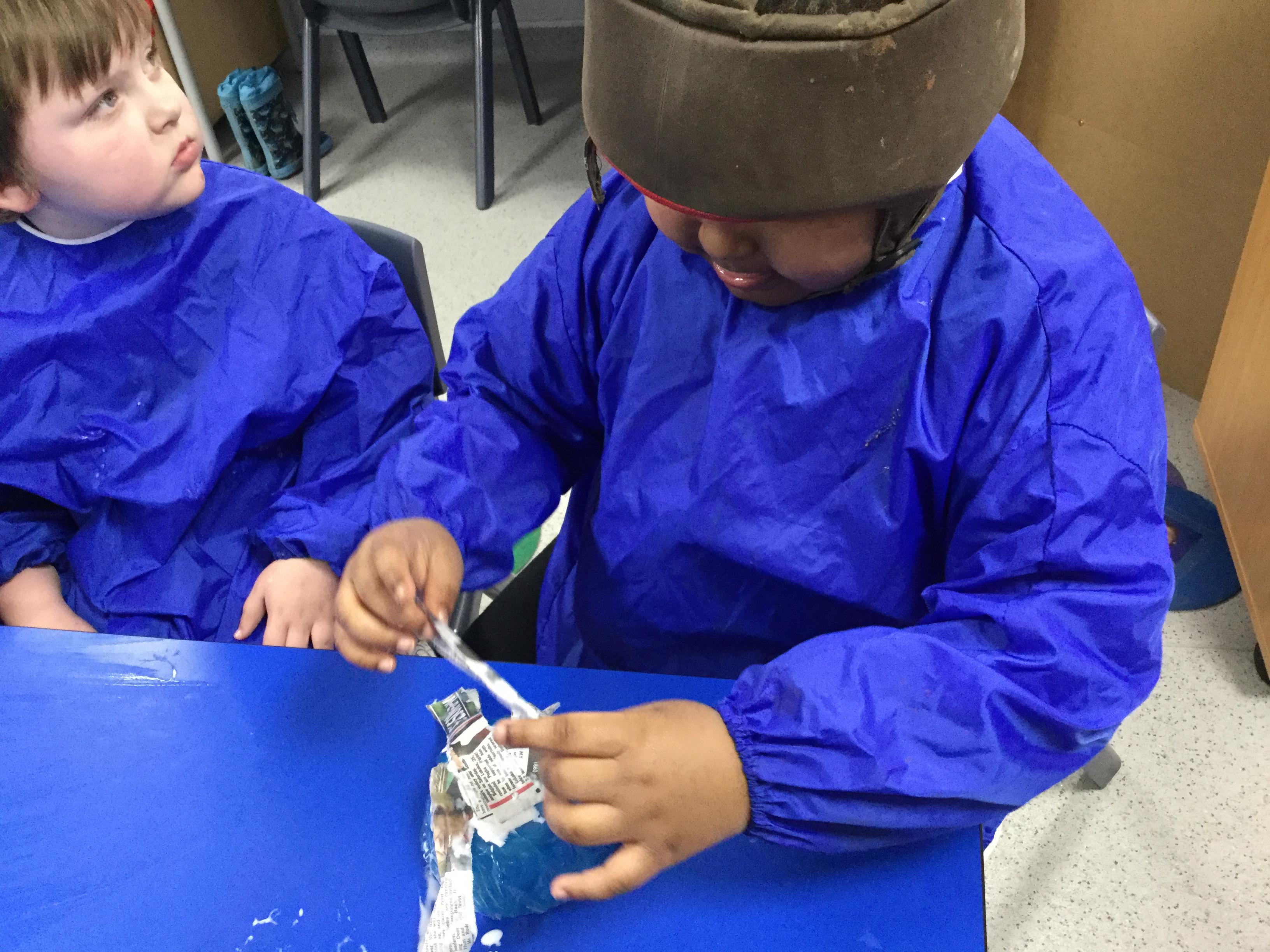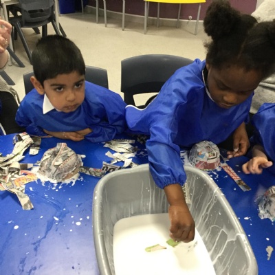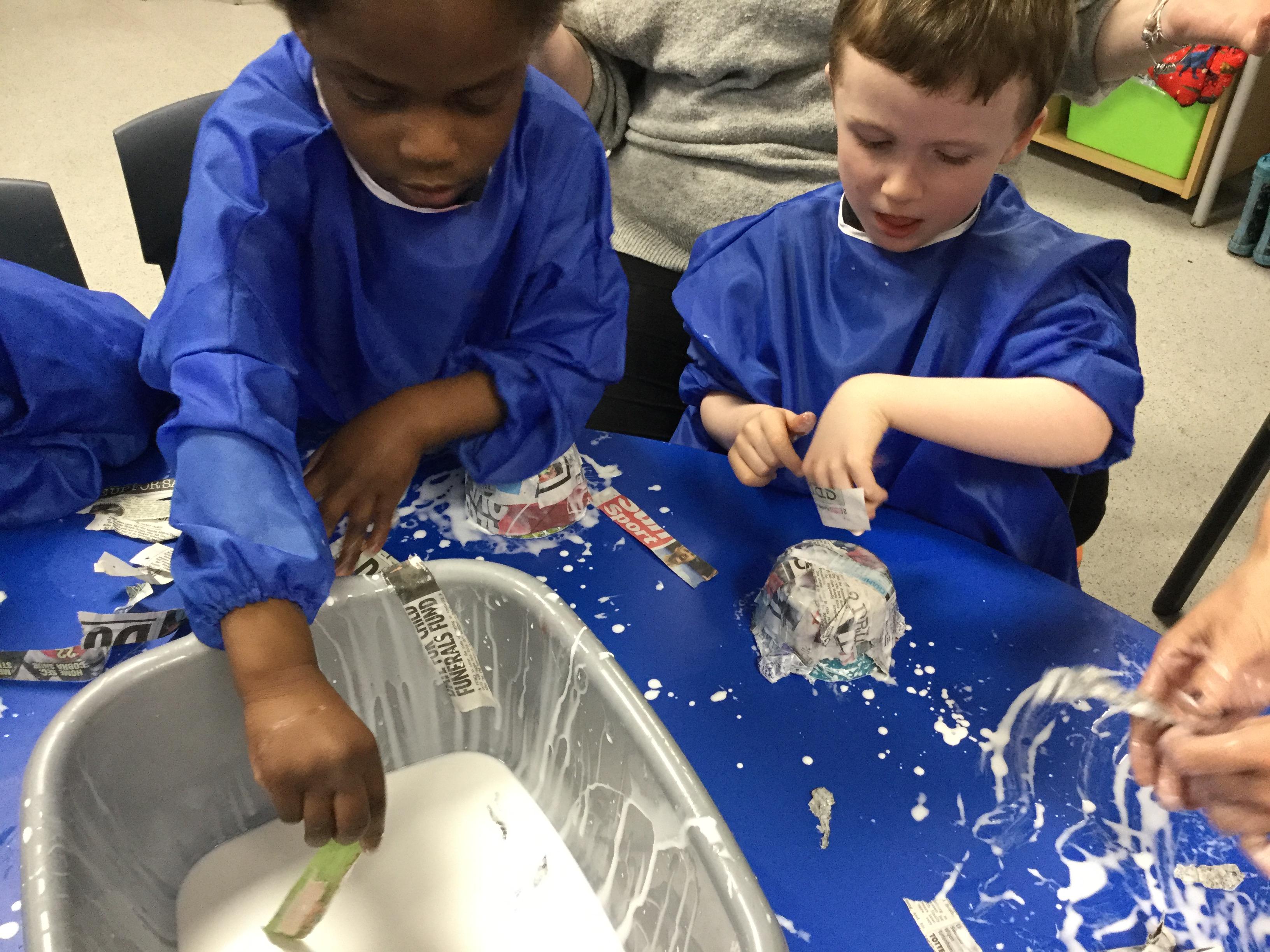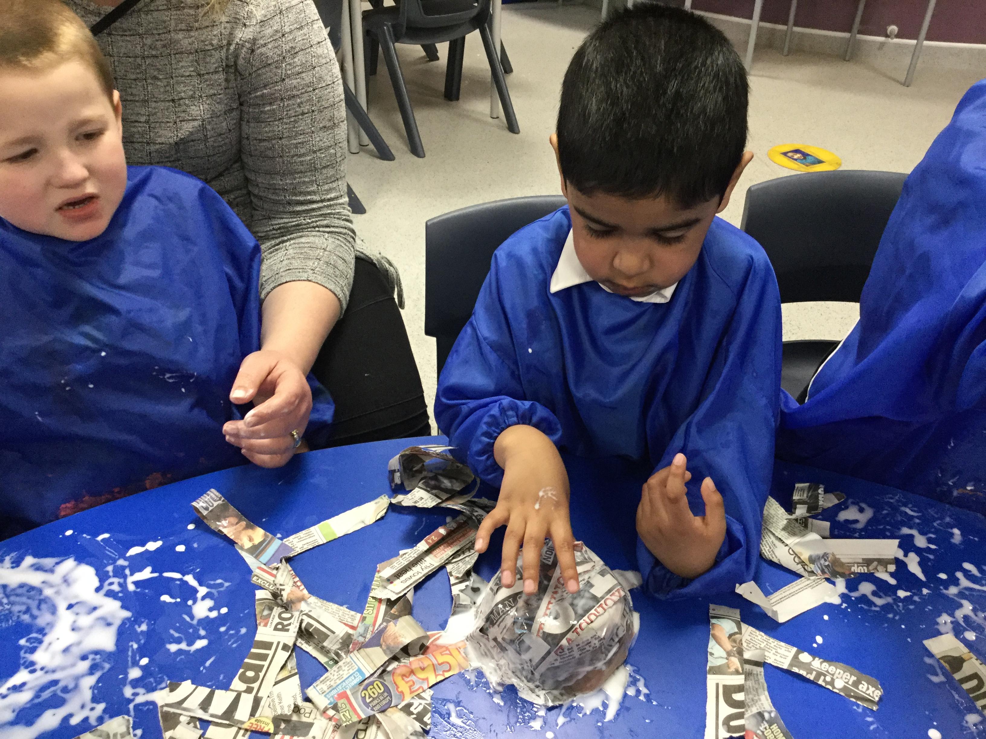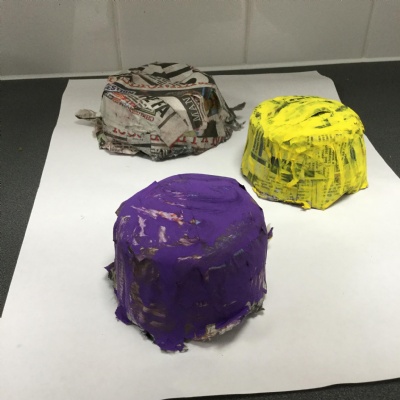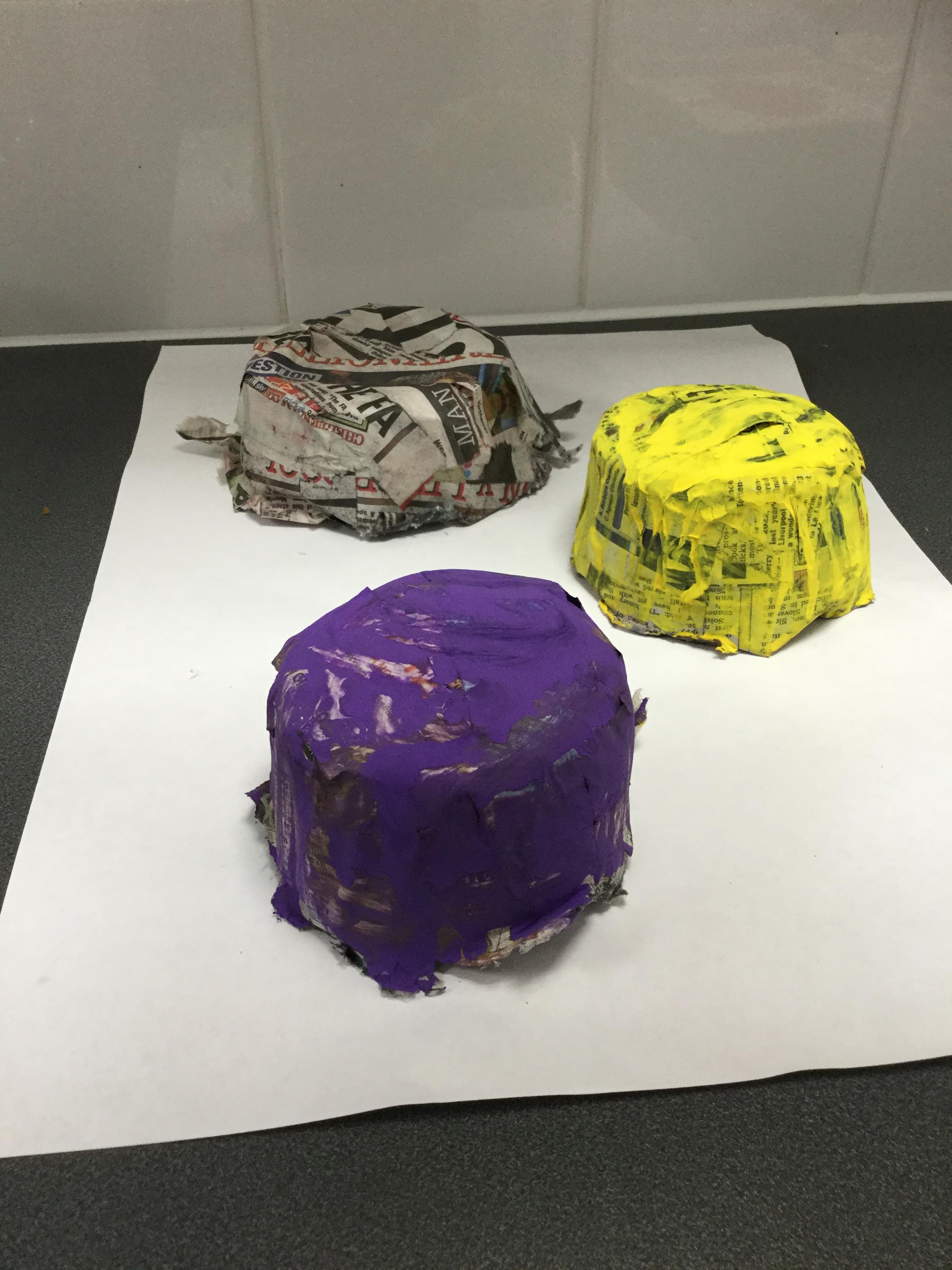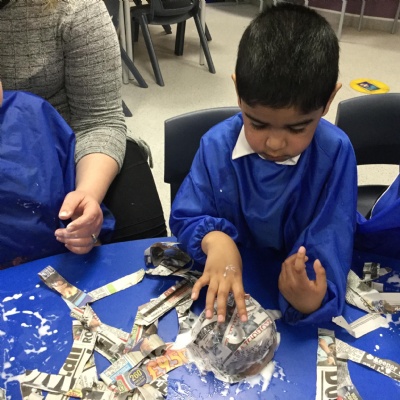 We made a bowl using paper mache. We had lots of fun tearing the newspaper and got our hands very sticky!!