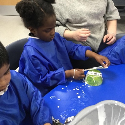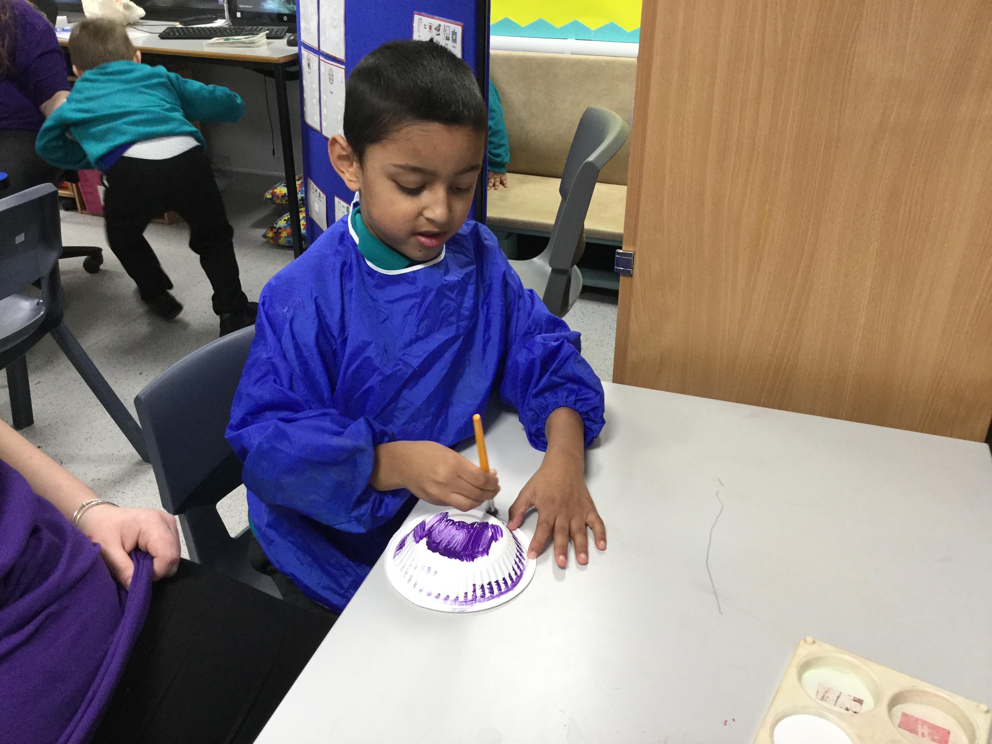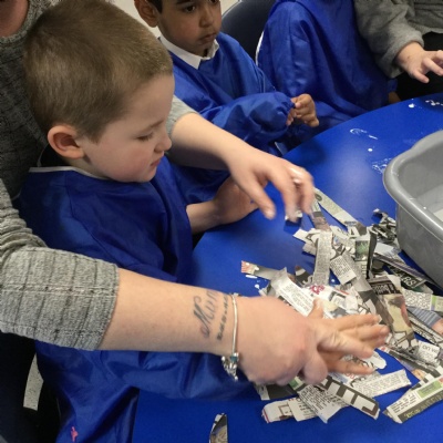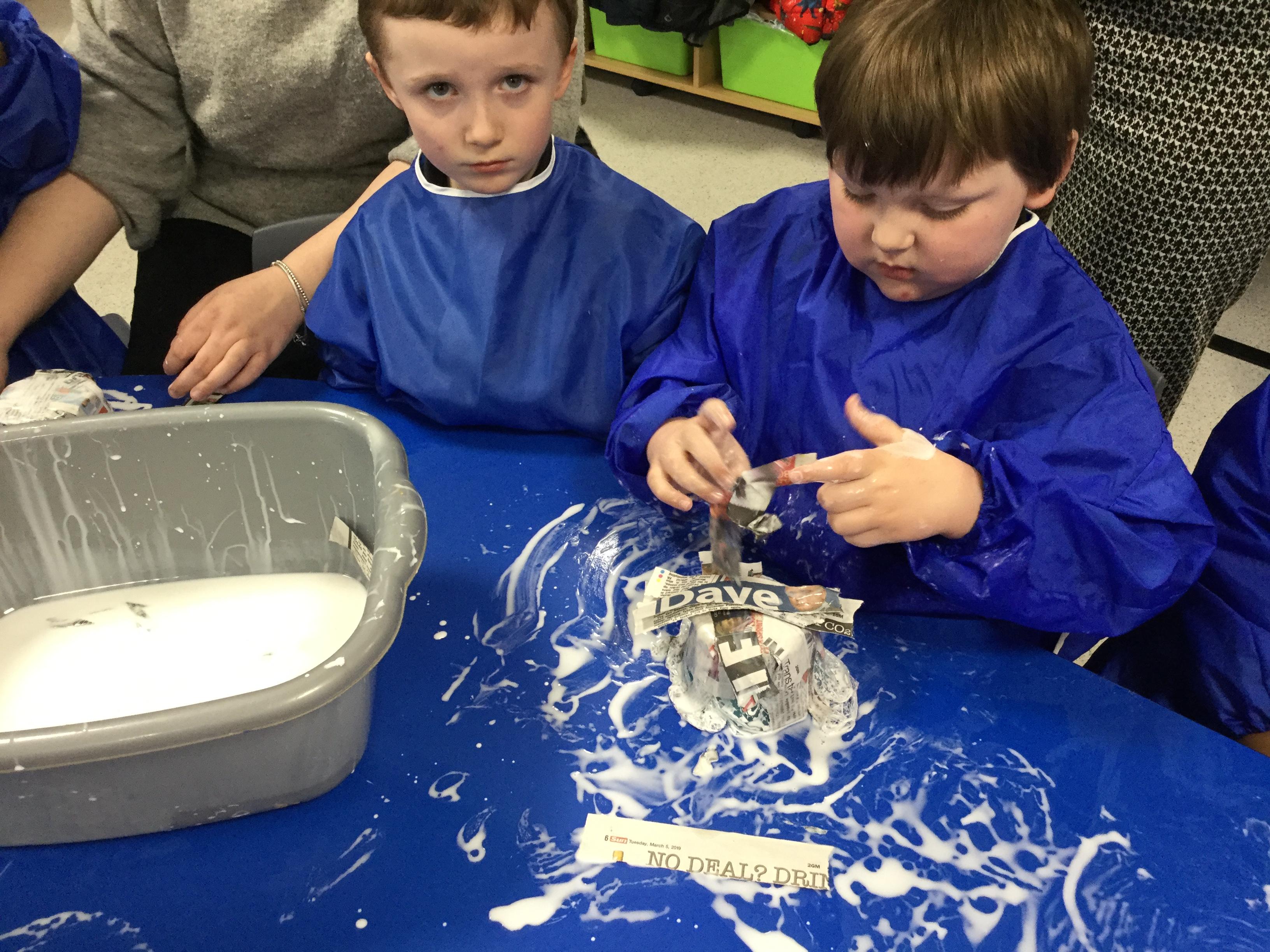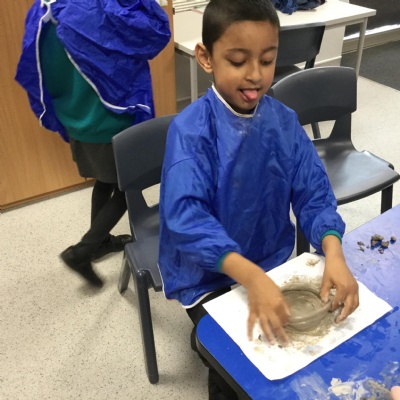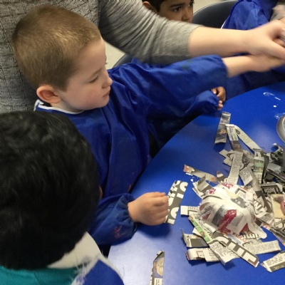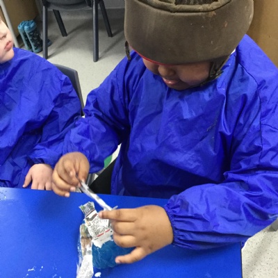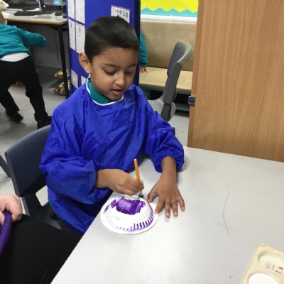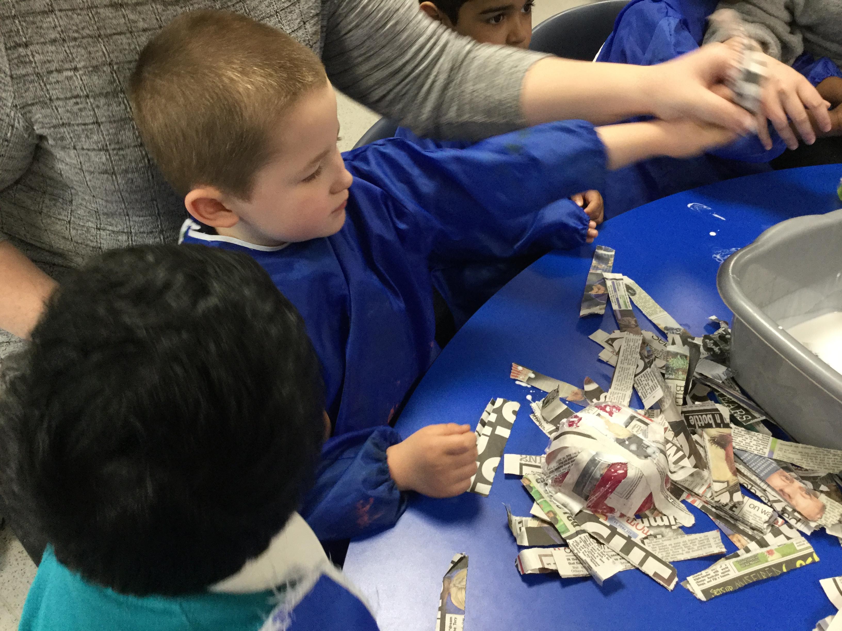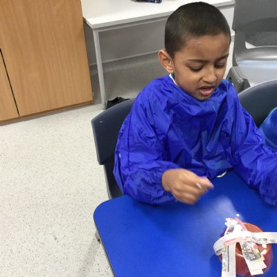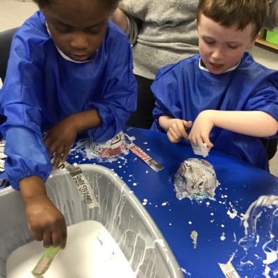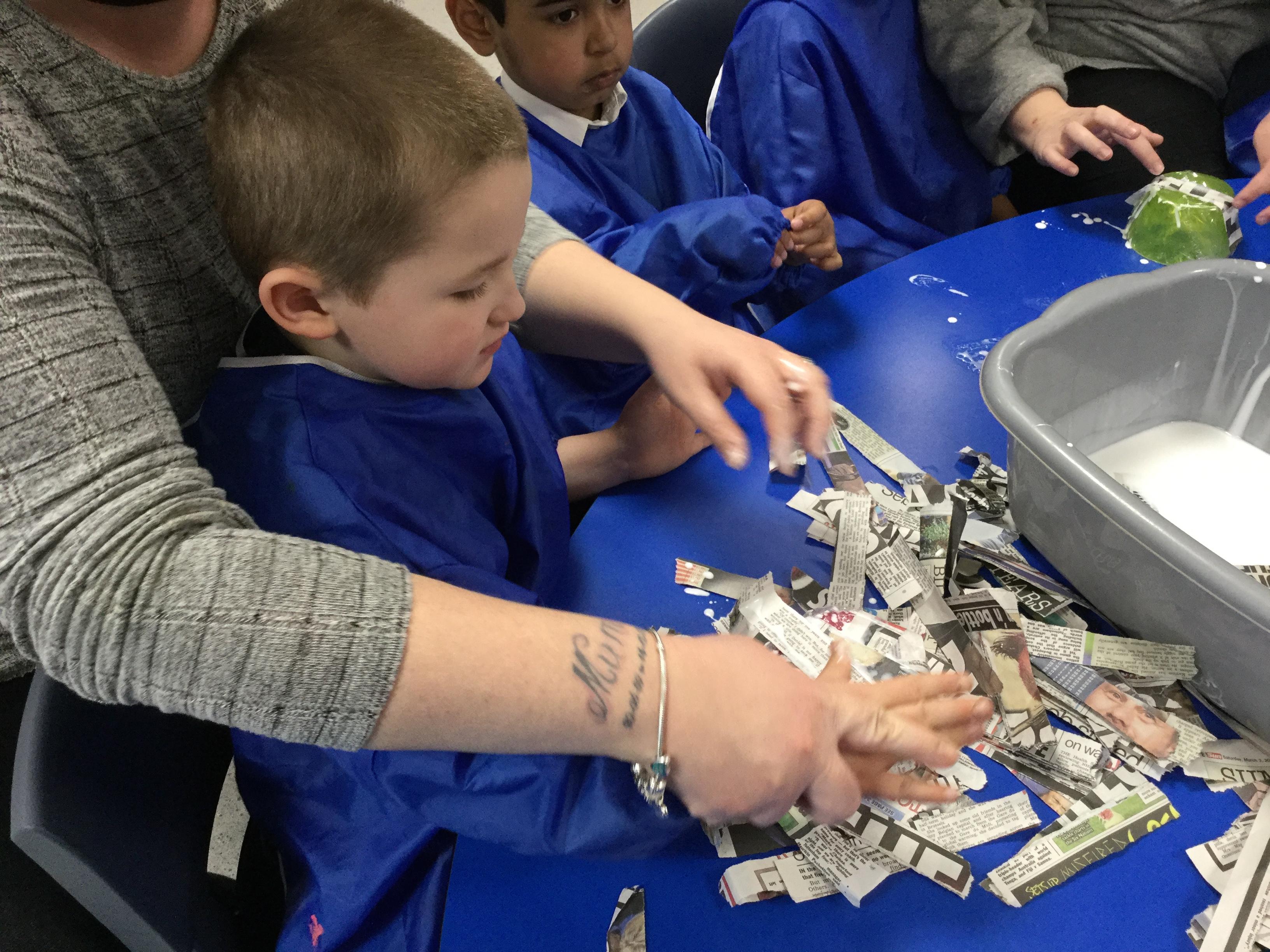 We made a bowl using paper mache. We had lots of fun tearing the newspaper and got our hands very sticky!!