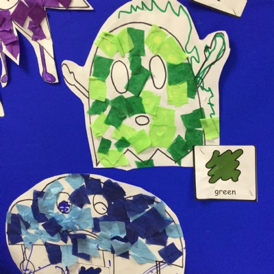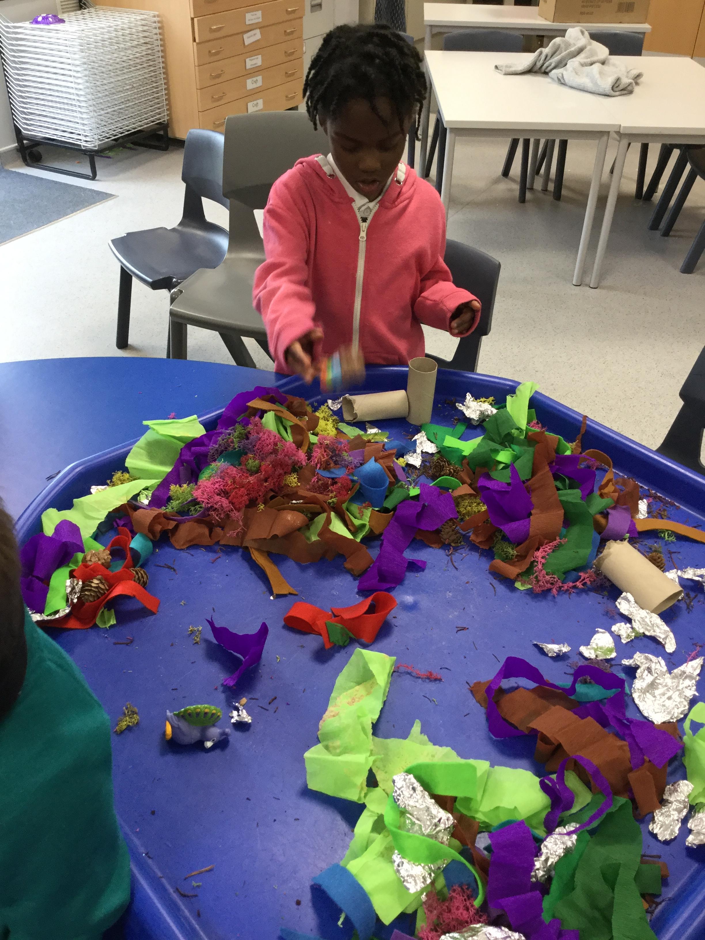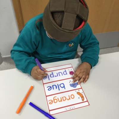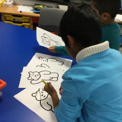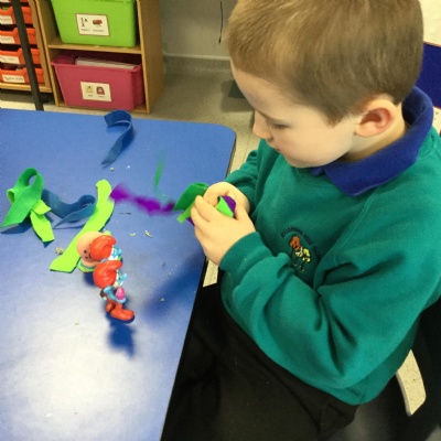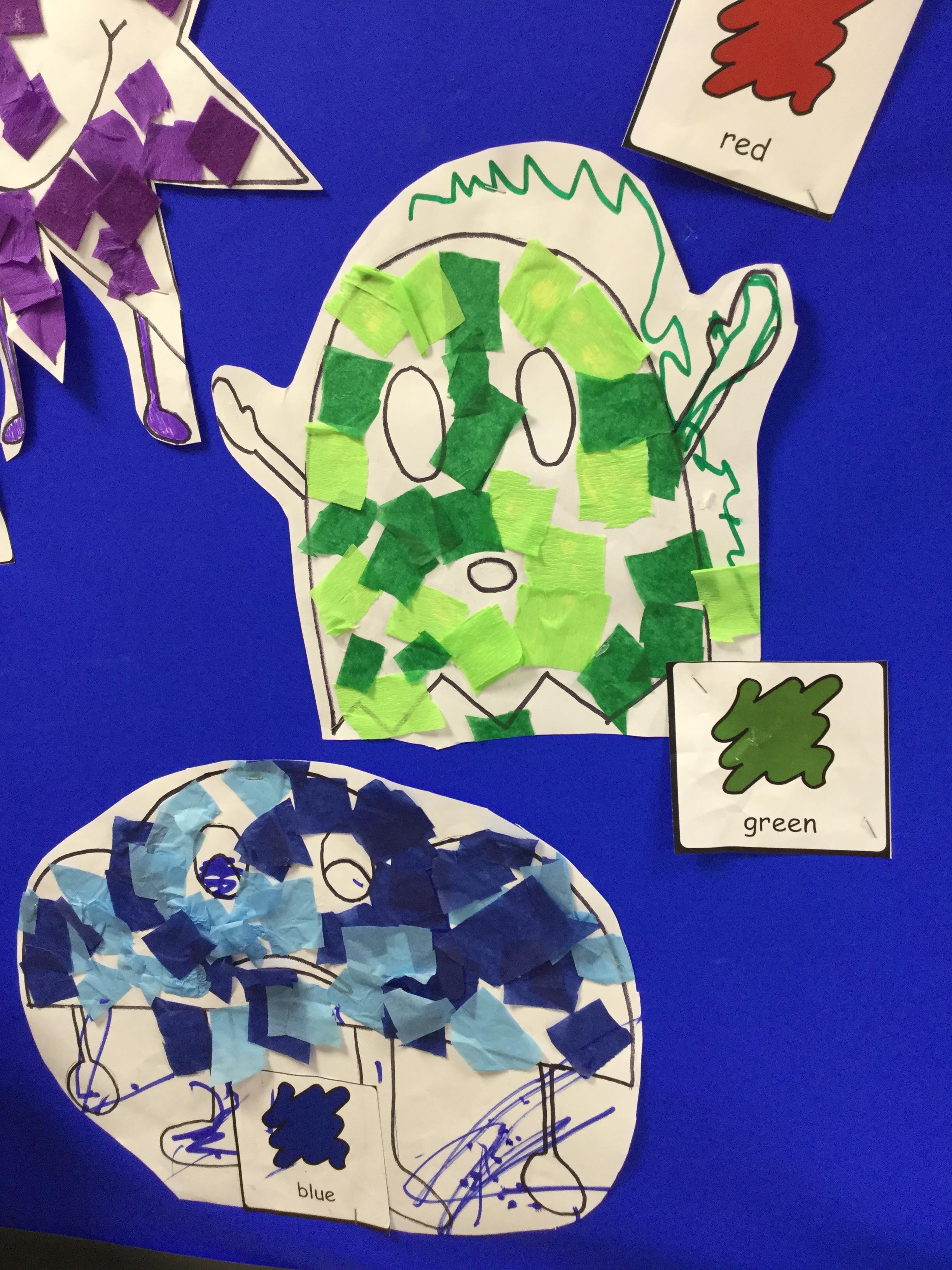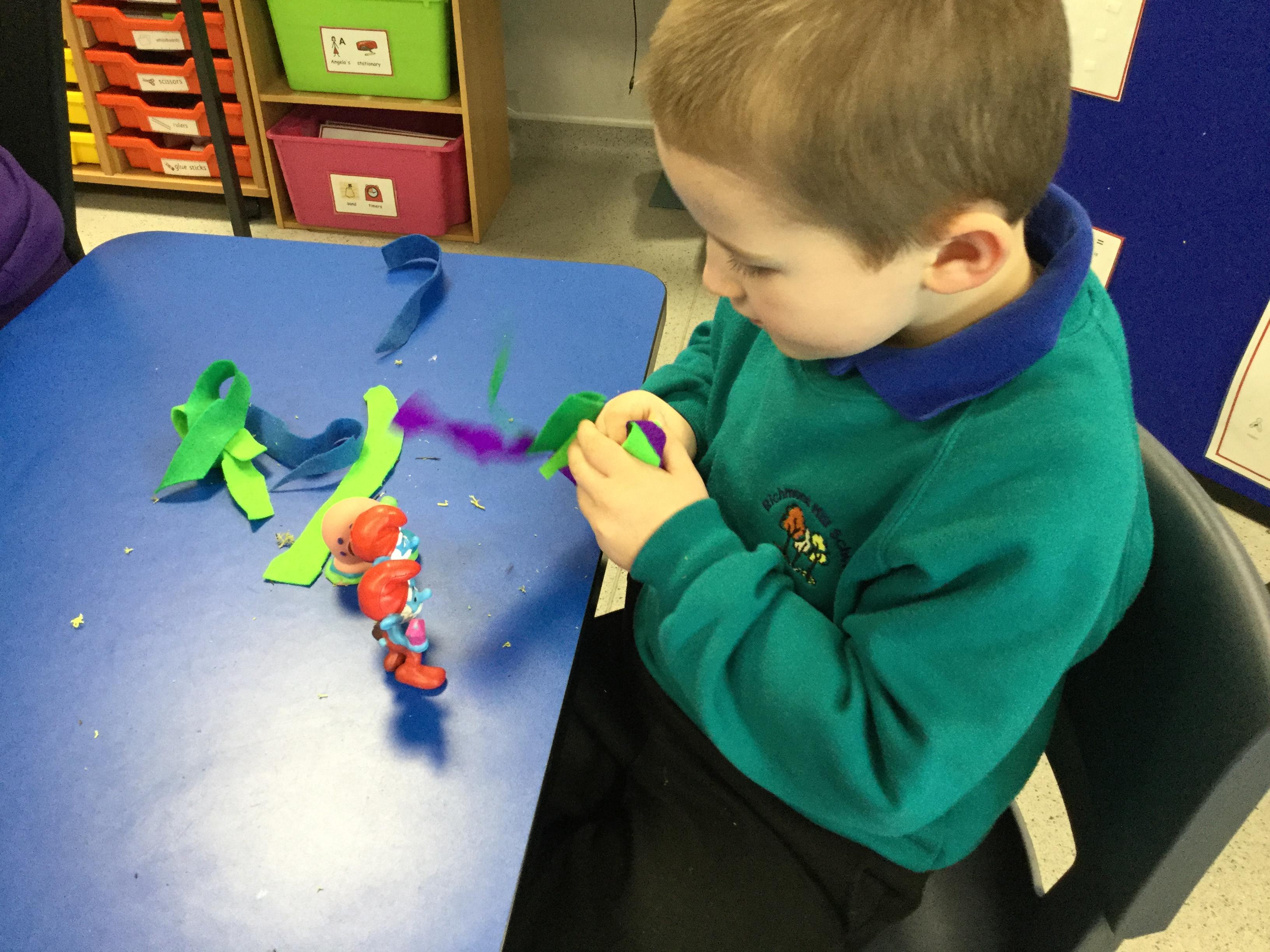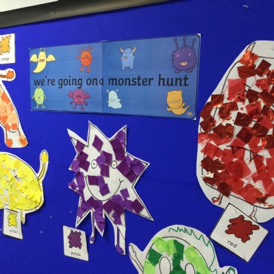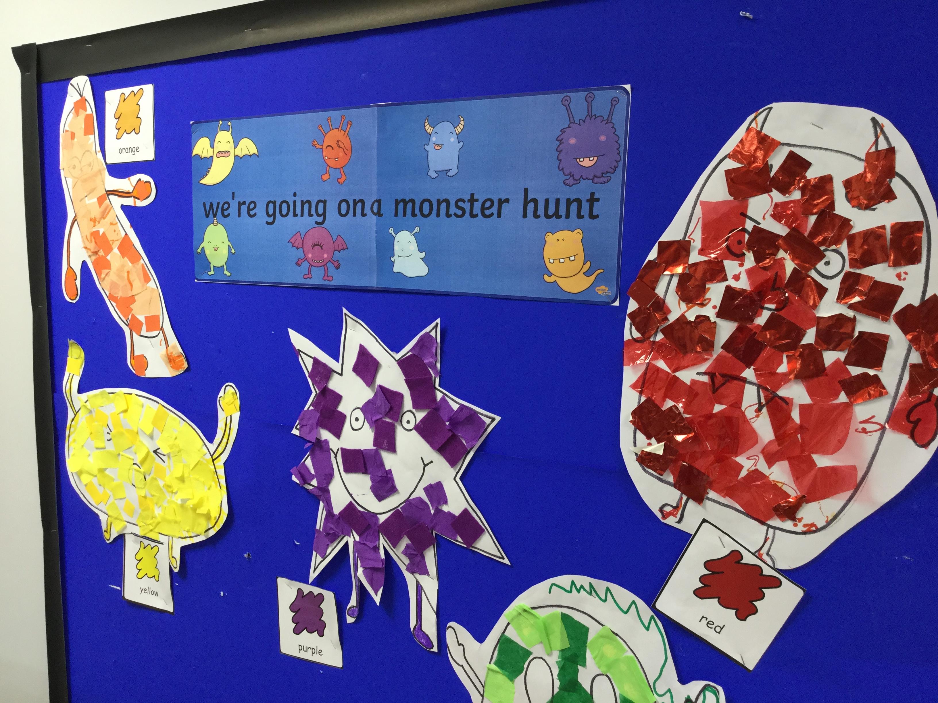 We have been having lots of fun with our story so far this term. We have been for a walk looking for the red monster, creating the monsters for our class display board, over writing or under writing the different colours with the matching felt tip and making marks using the different coloured resources.