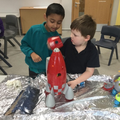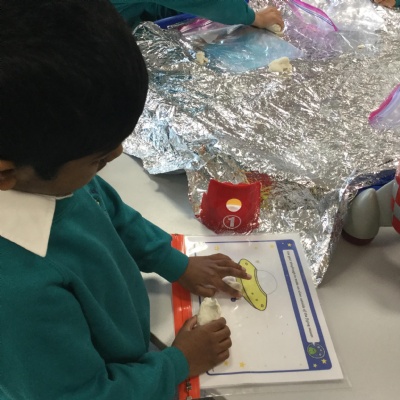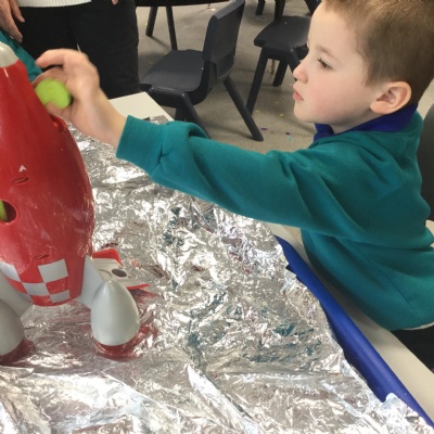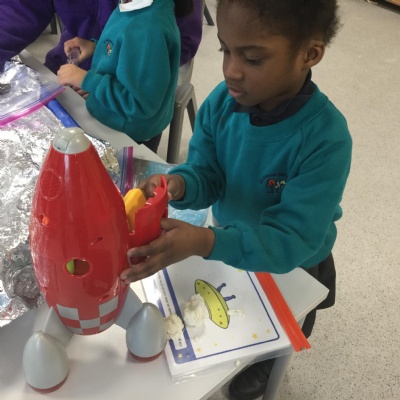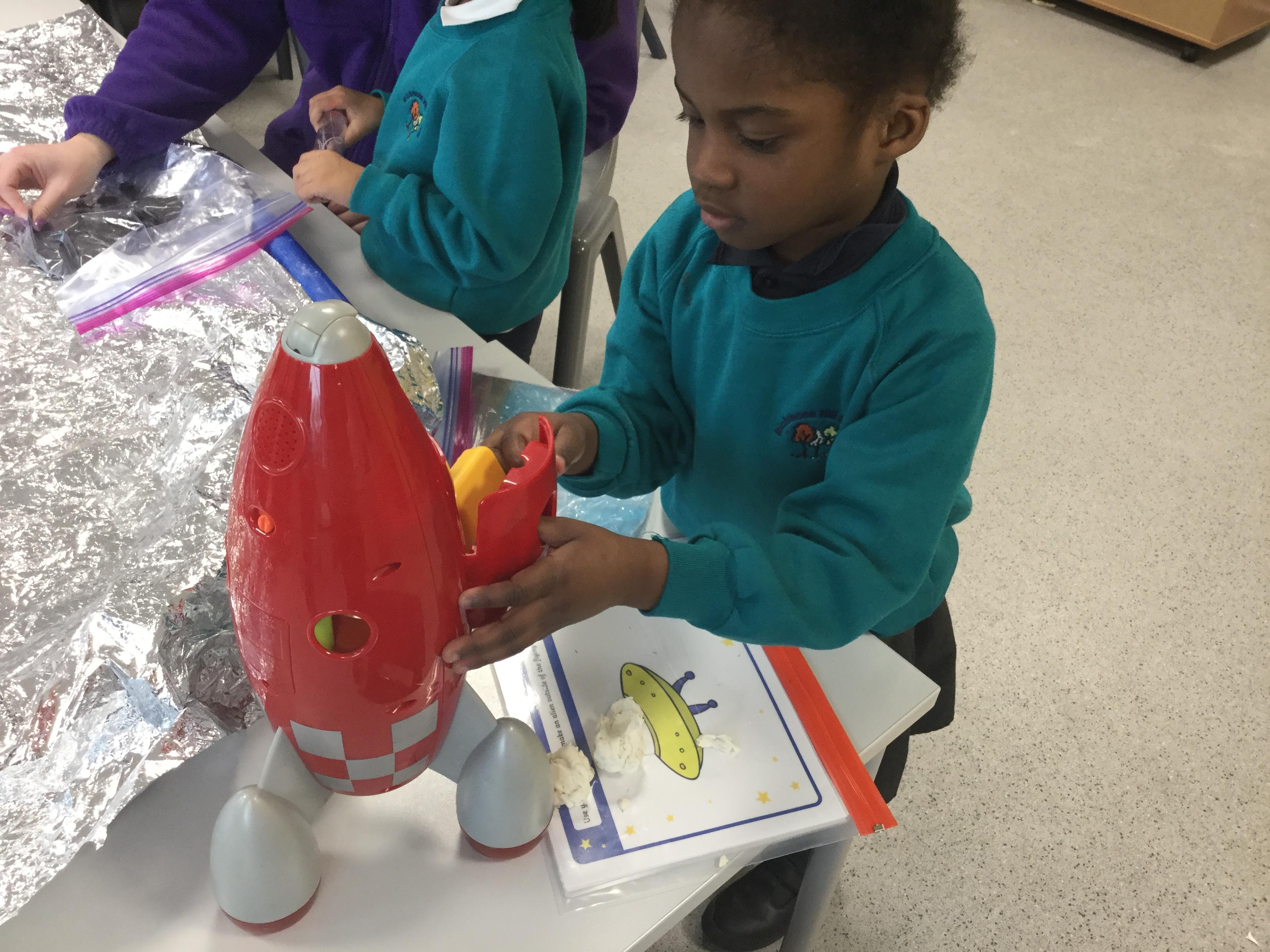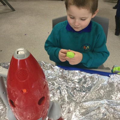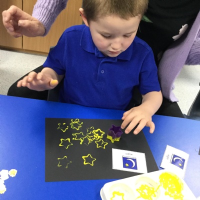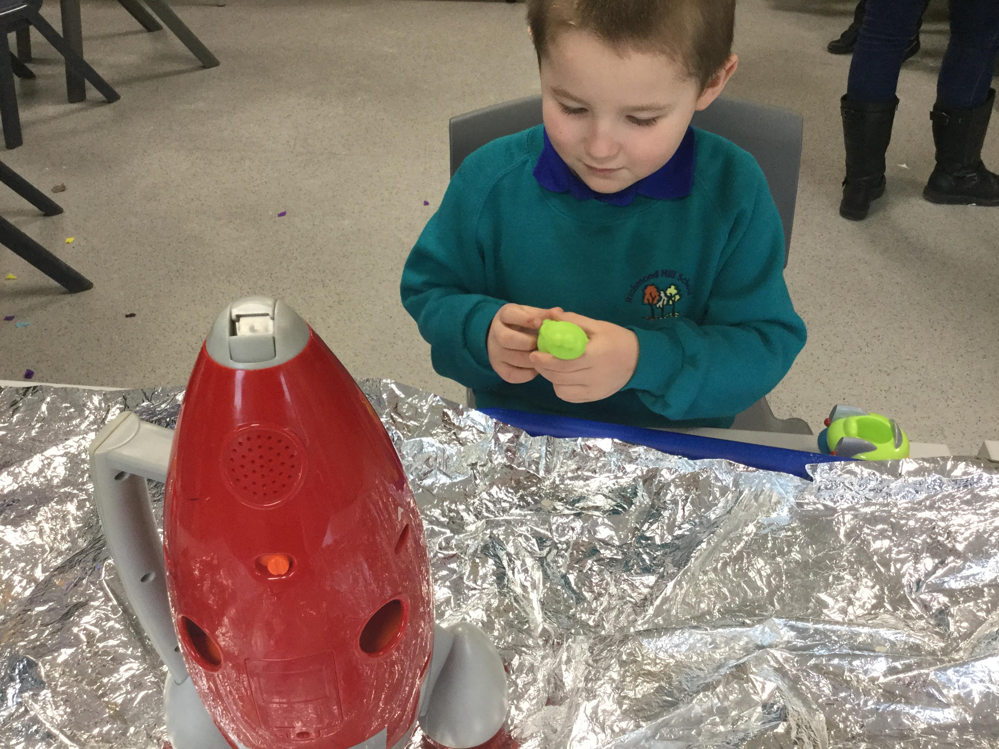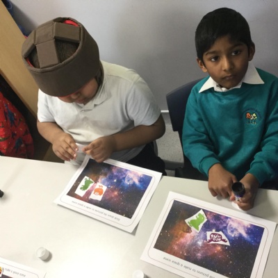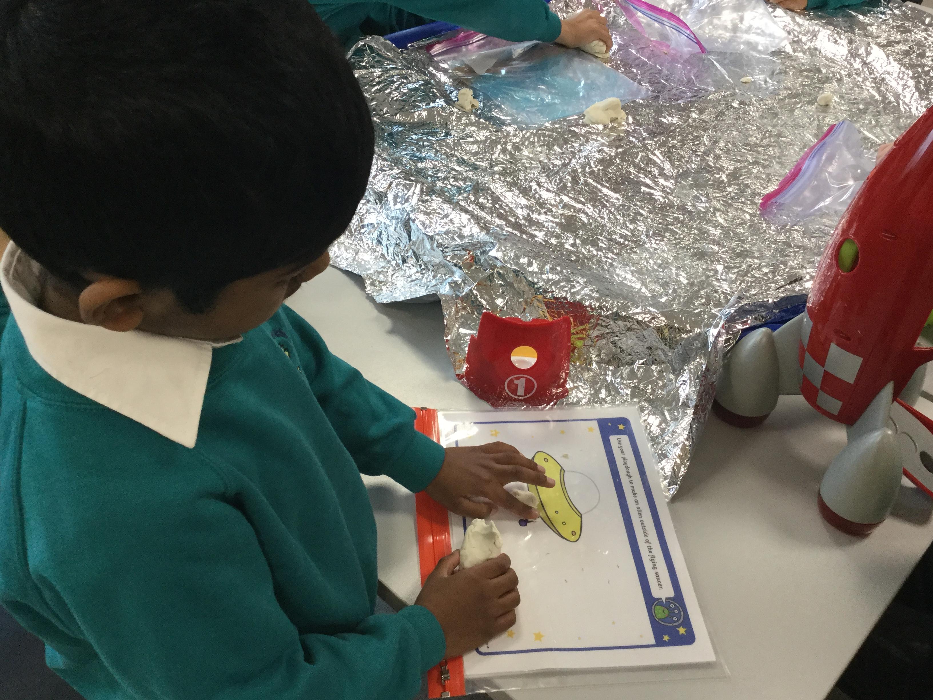 We went to space this week. We explored the space themed tuff spot tray, made planet crafts using marbling and chose aliens and rockets to stick onto our space pictures.