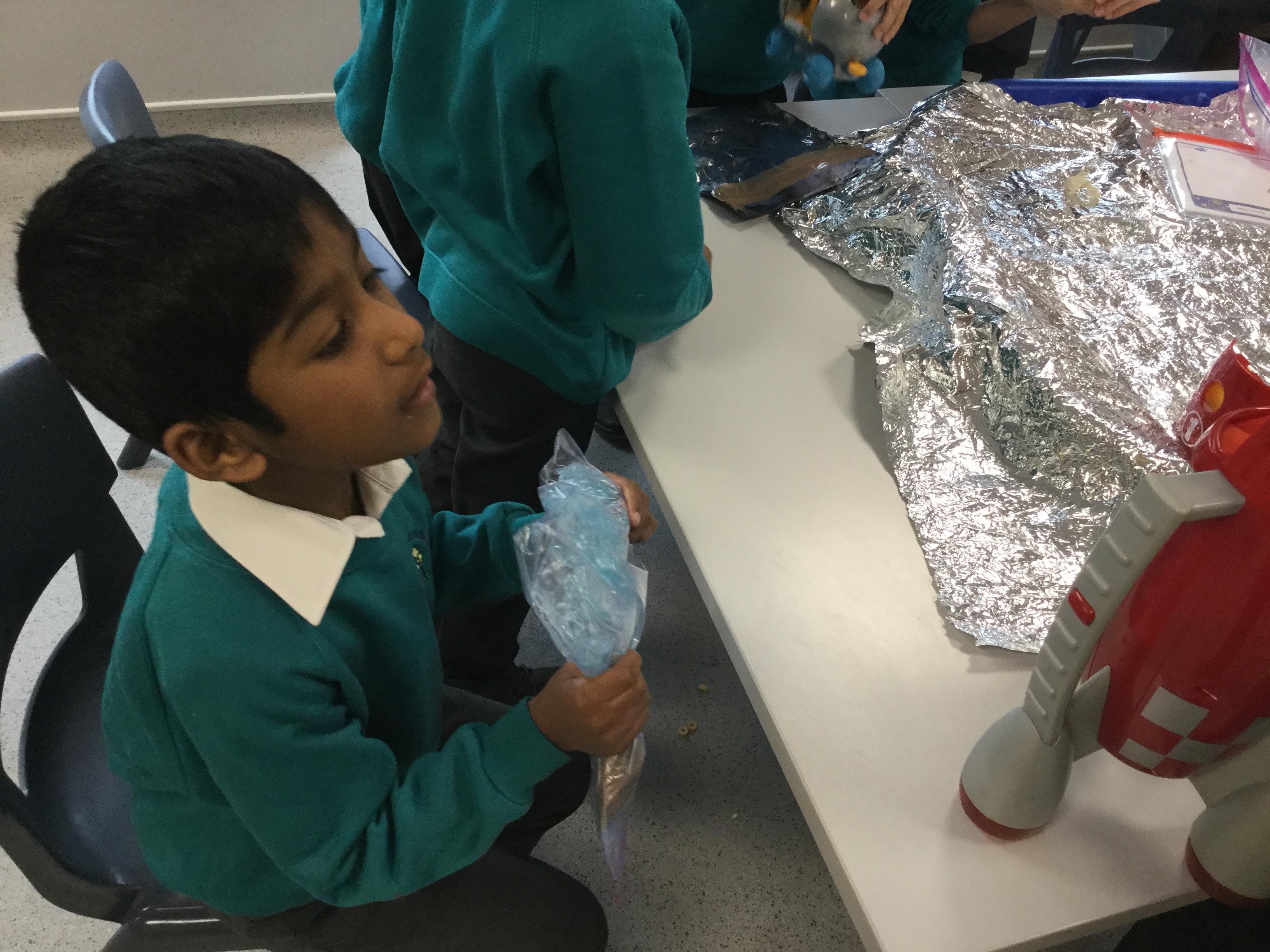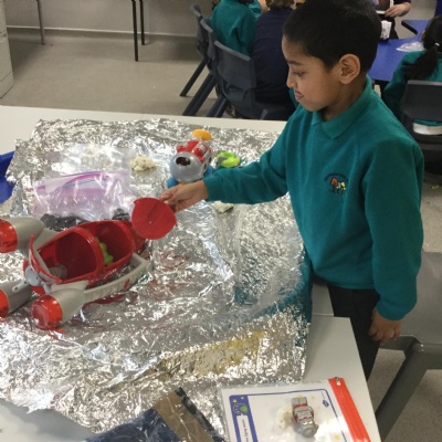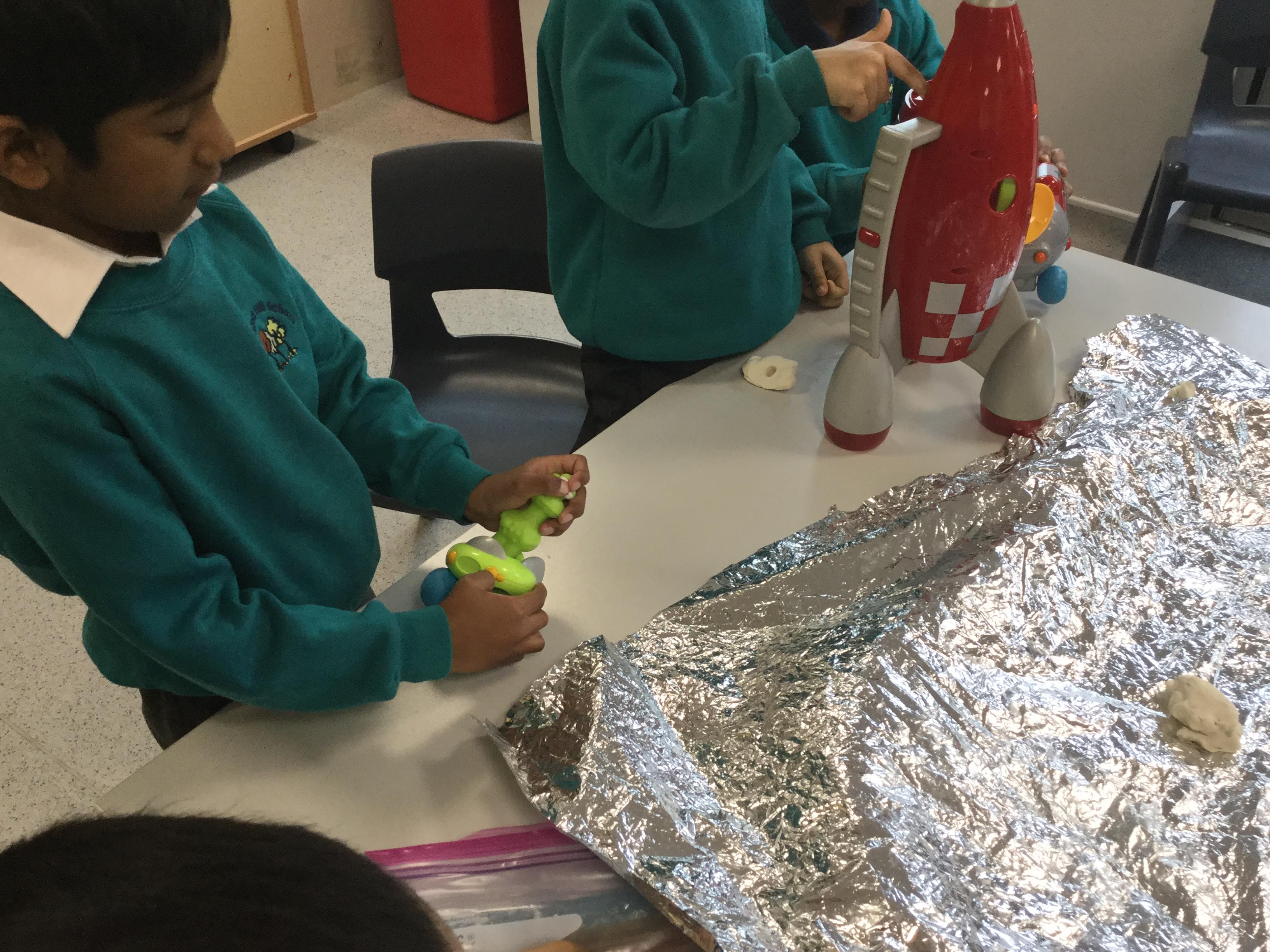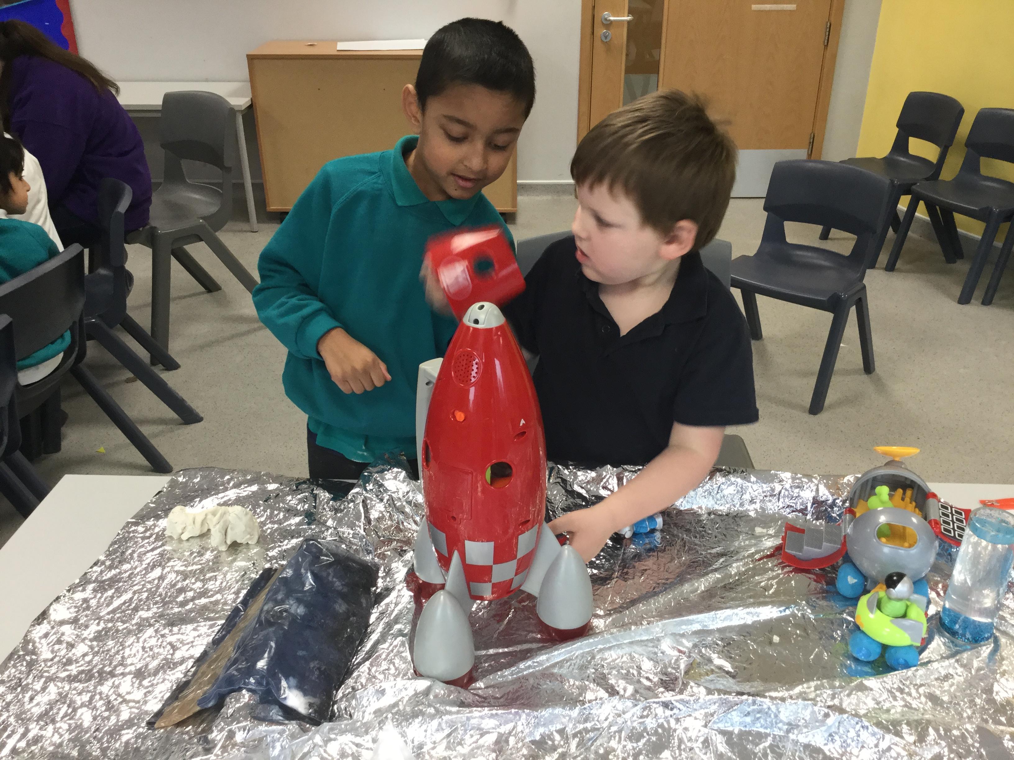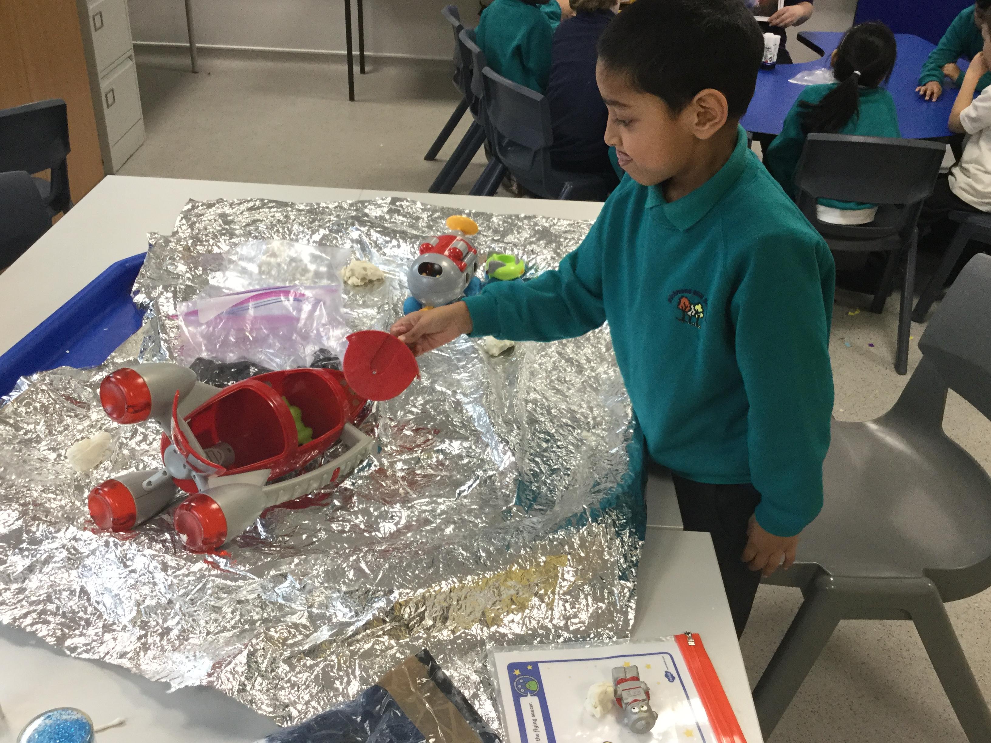 We went to space this week. We explored the space themed tuff spot tray, made planet crafts using marbling and chose aliens and rockets to stick onto our space pictures.