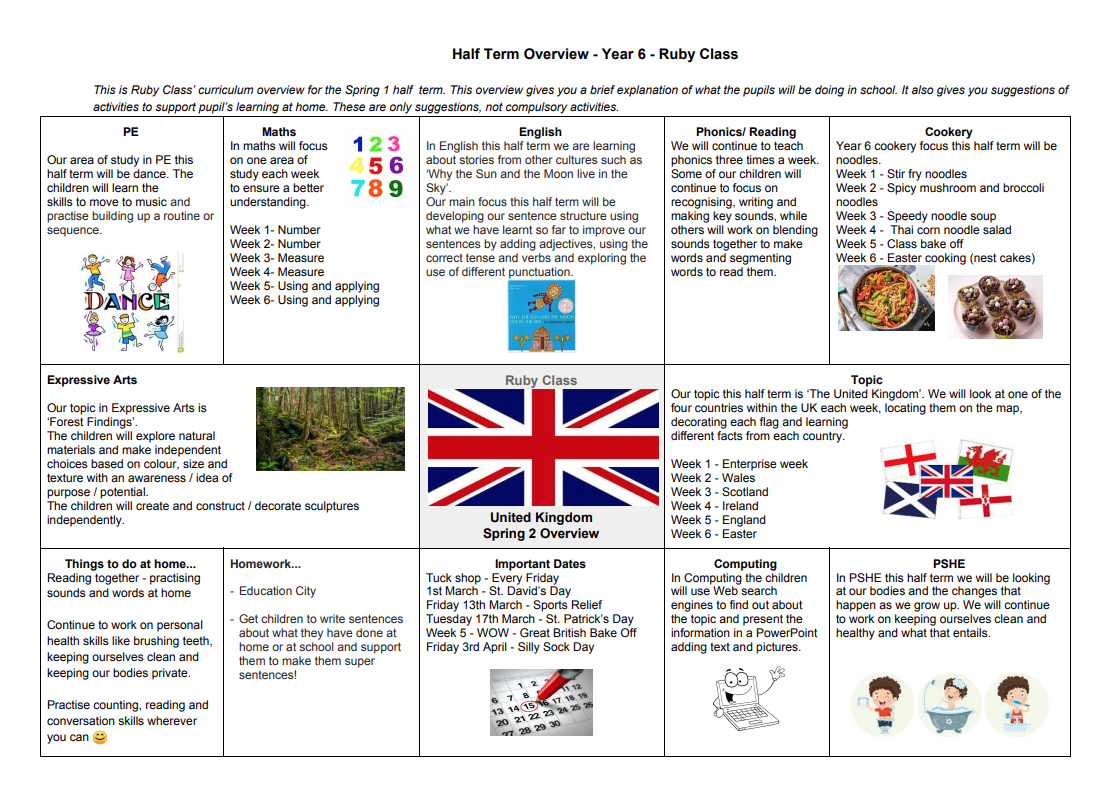 Our topic this half term is ‘The United Kingdom’. We will be learning about the countries within the UK, locating the areas and capital cities on the map. We will learn different facts about each country. We will decorate flags and complete different crafts, e.g. the national flower of each country.