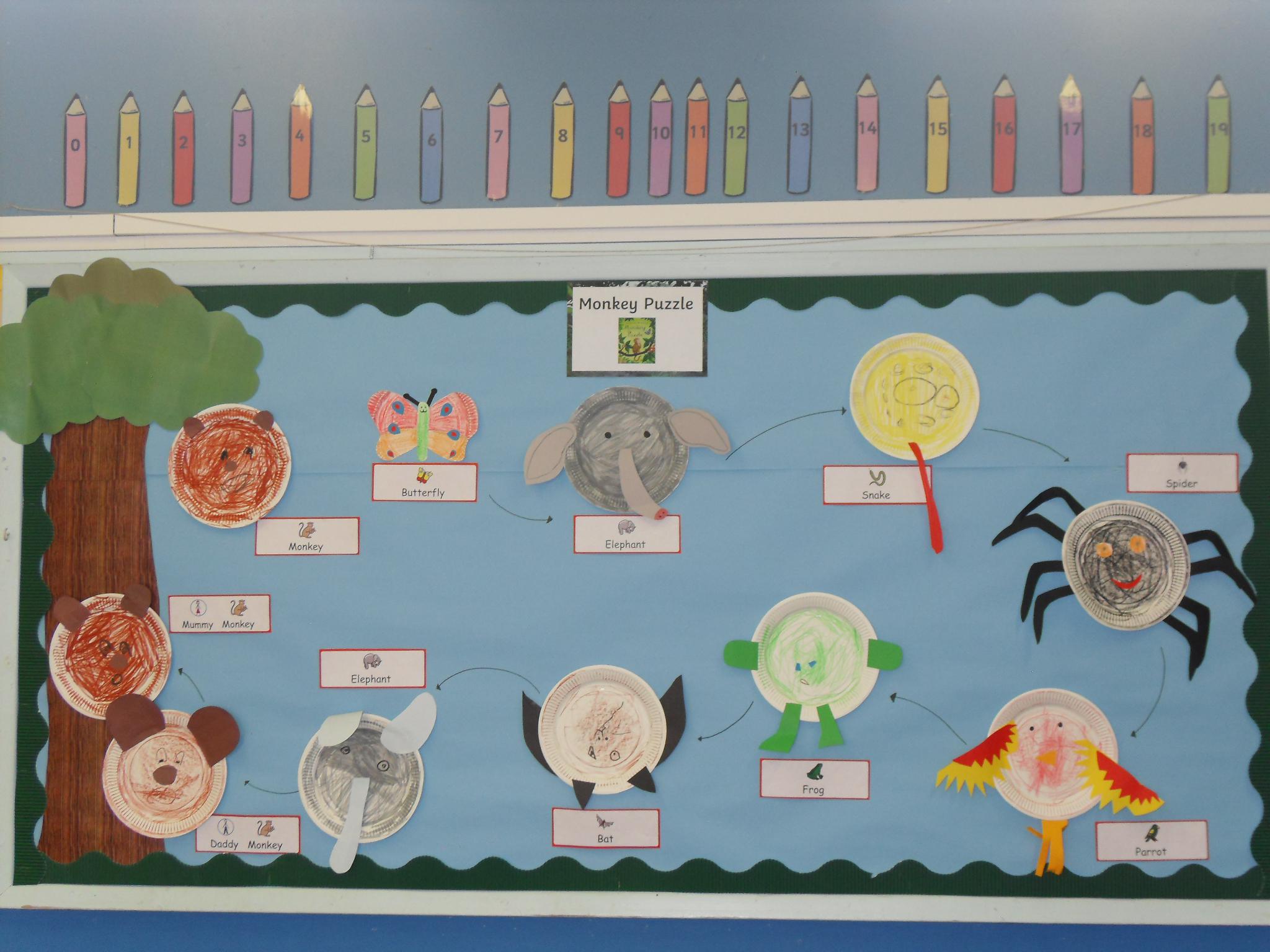 All the children made an animal from our book and we hung them to show the order baby monkey and butterfly meet them in the story.