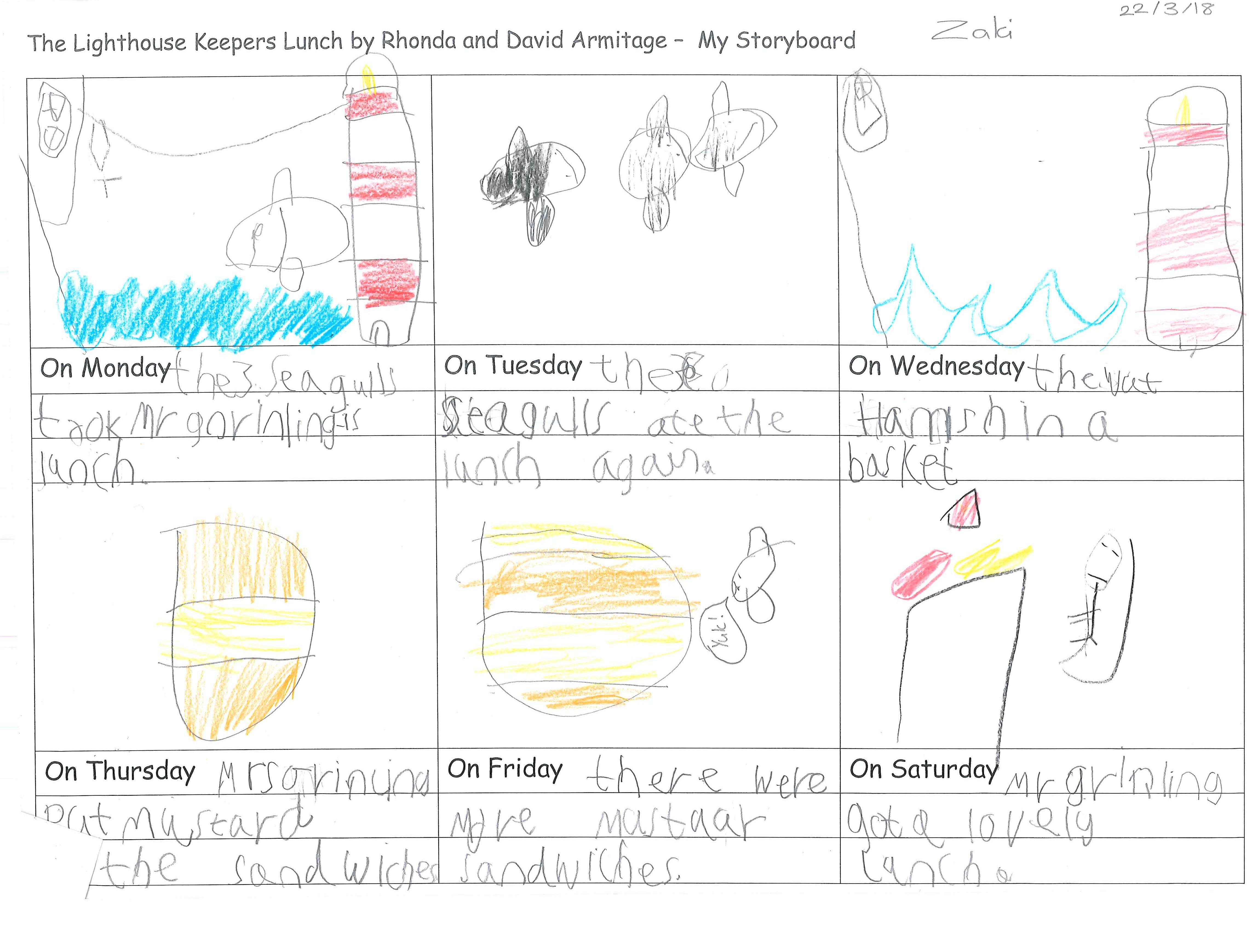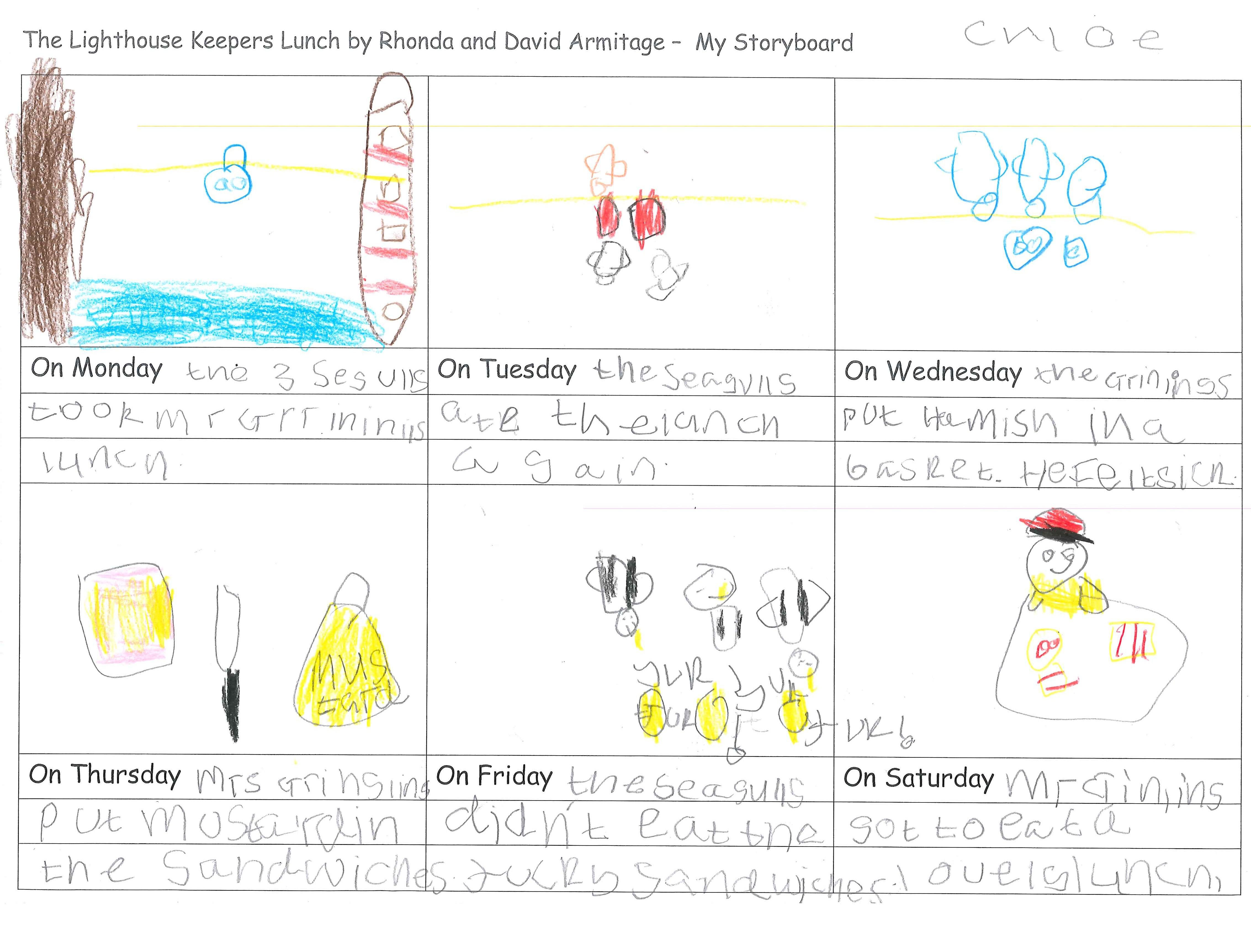 Zaki and Chloe have created a storyboard of events through Mr Grinling, the lighthouse keeper's week.