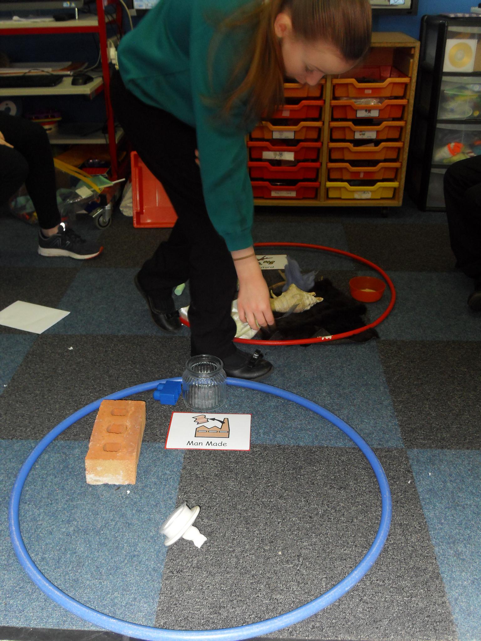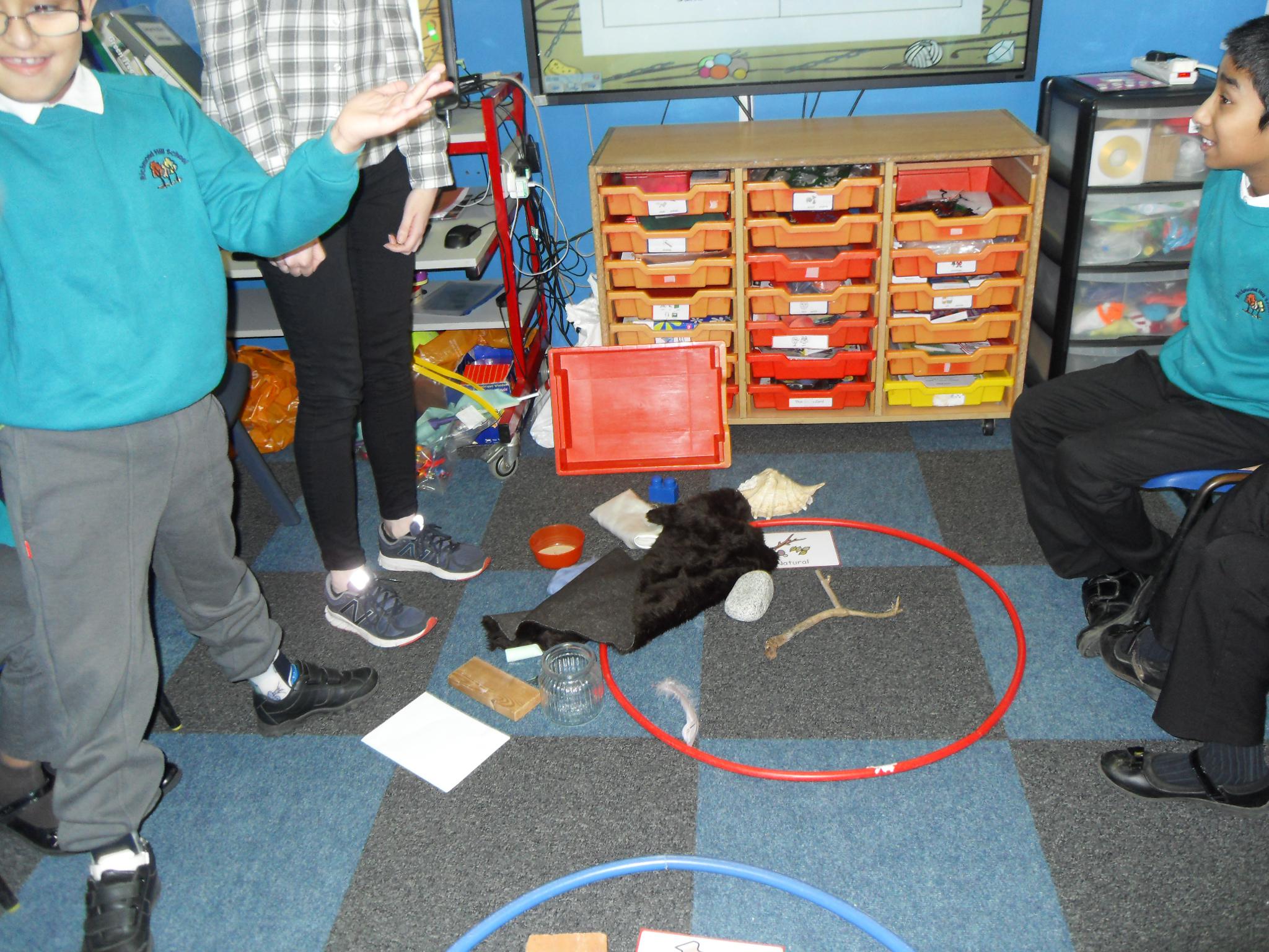 In science we have handled and sorted natural and man-made objects and tested a range of materials to find out which ones are waterproof.  They made feely hands by adding a different material to each finger and describing its texture.  The children enjoyed using their hands to colour mix and experimenting by mixing with paint and shaving foam in zippy bags.