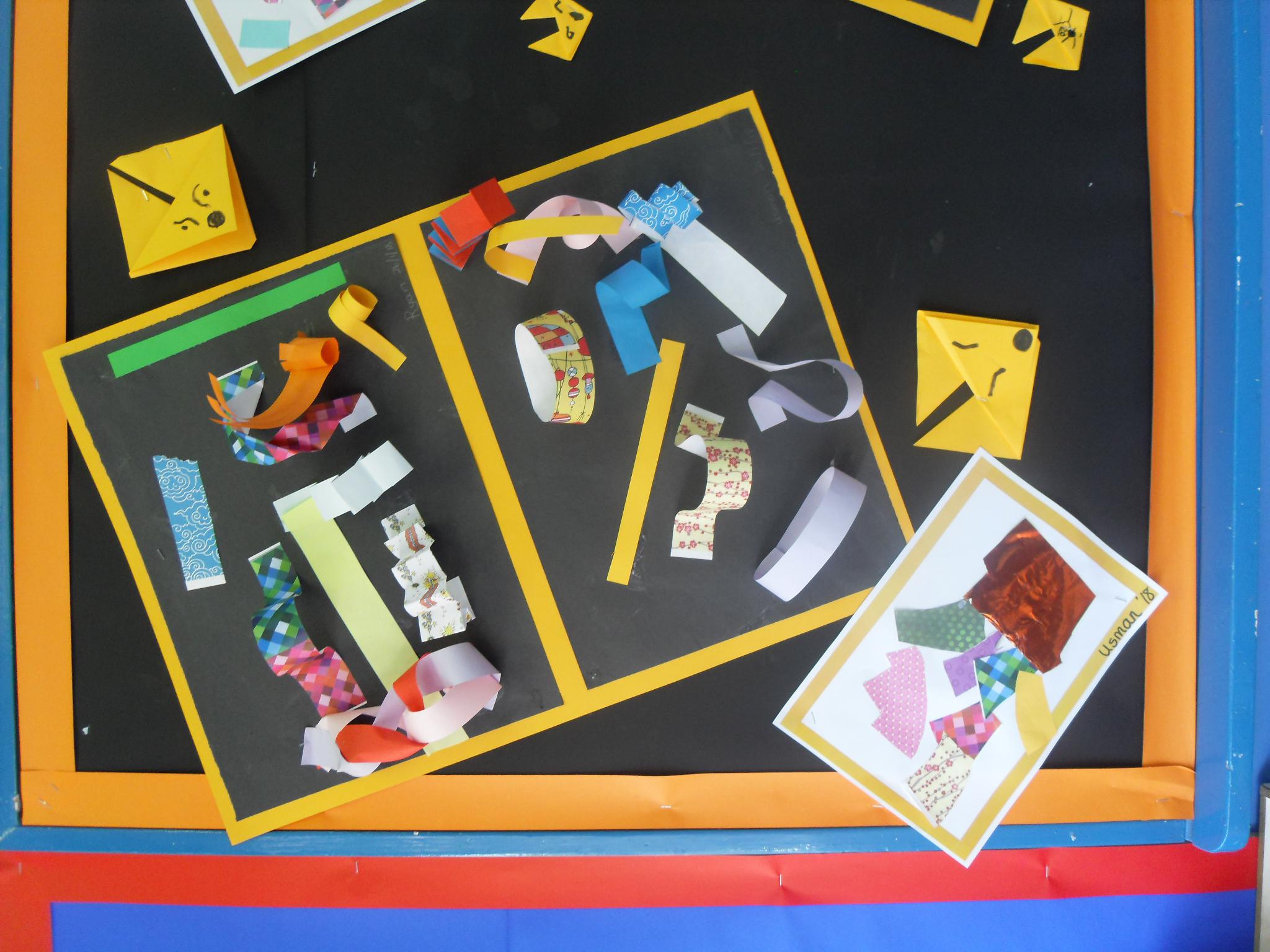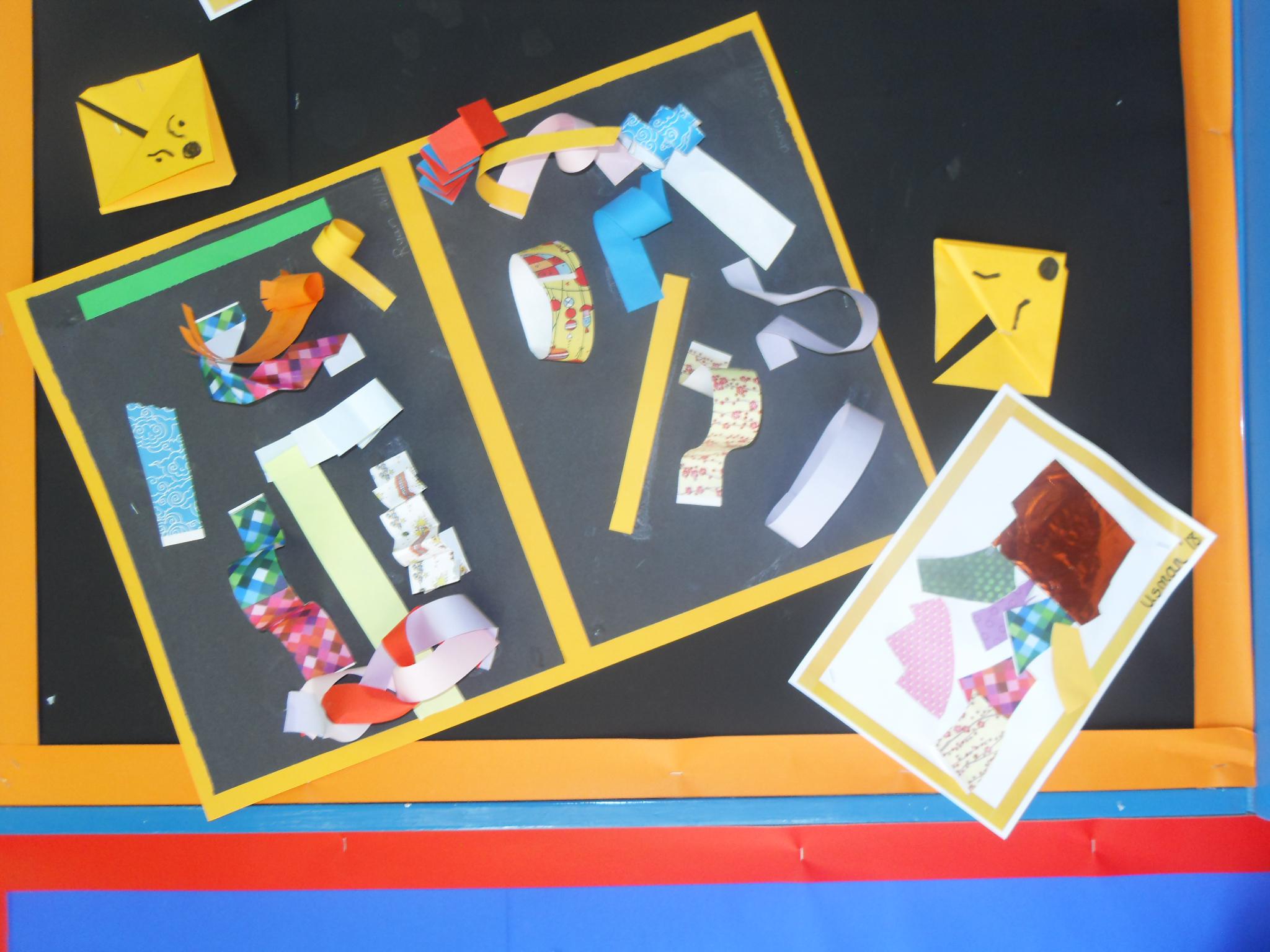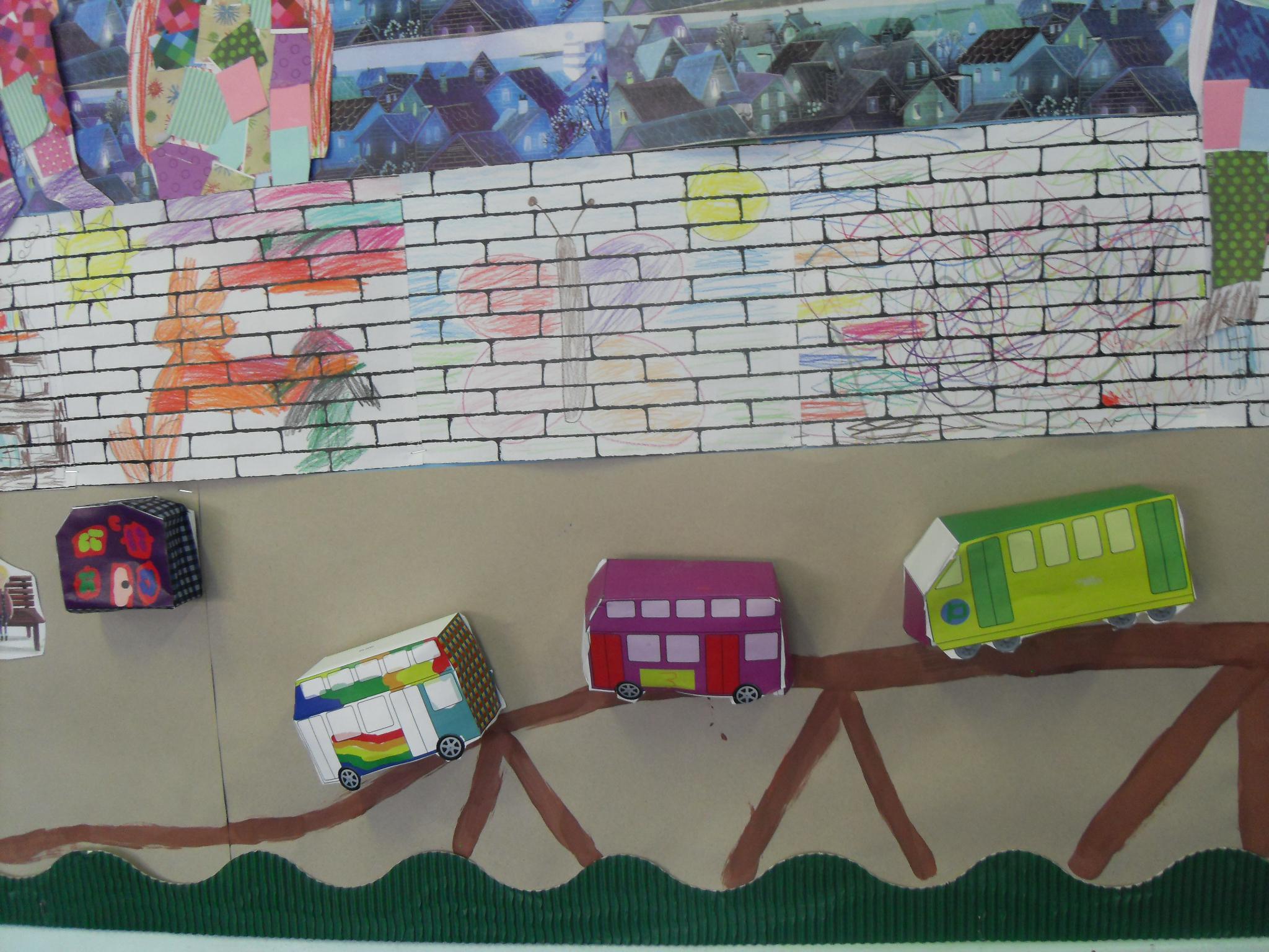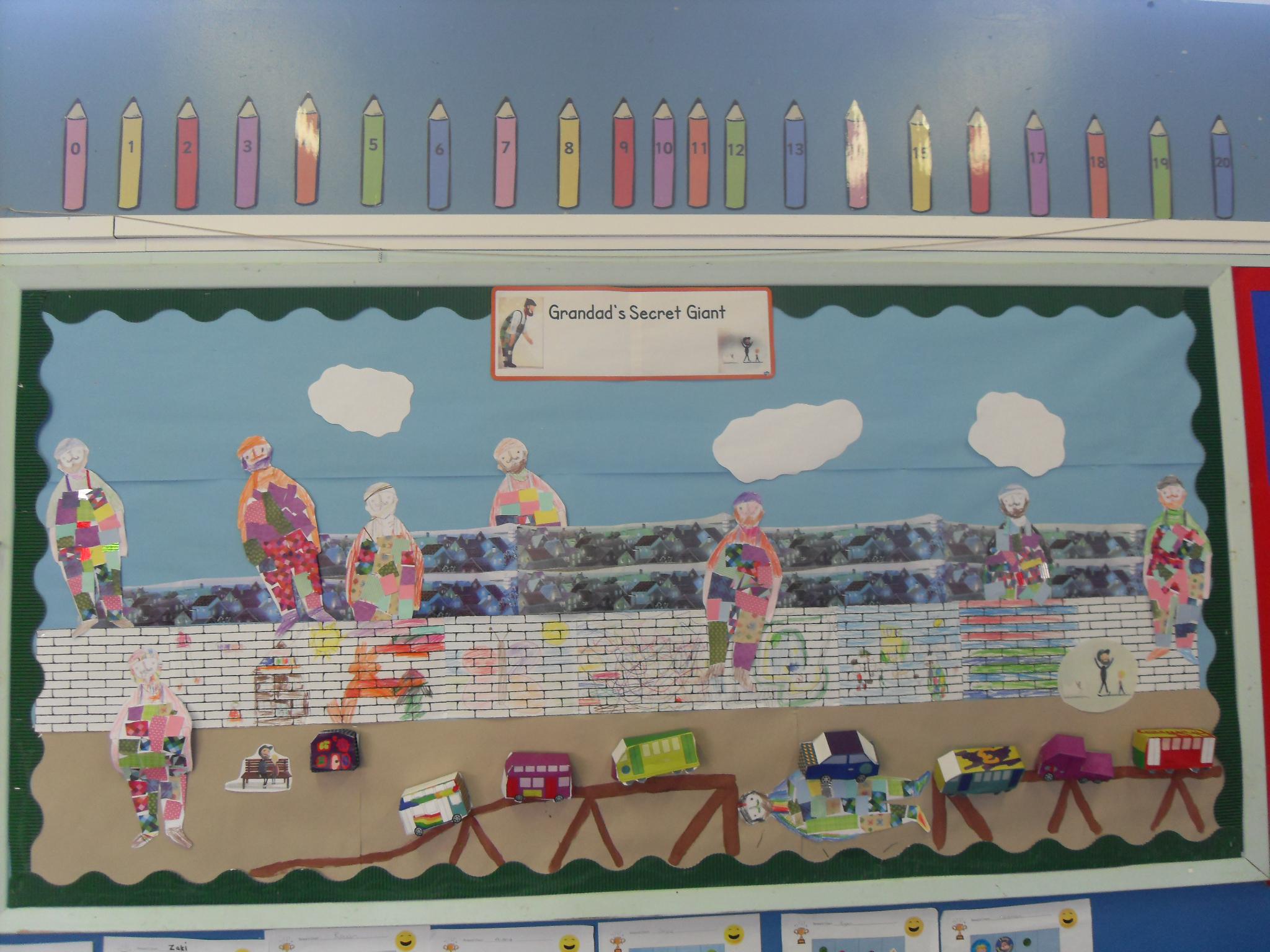 The children created a display based on our story Grandad’s Secret Giant.  They made their own giants with patchwork dungarees using different types of paper and drew mural walls.  In ICT as part of our design work, the children built different vehicles on the screen, printed out the nets and folded them to make 3d cars and trucks.