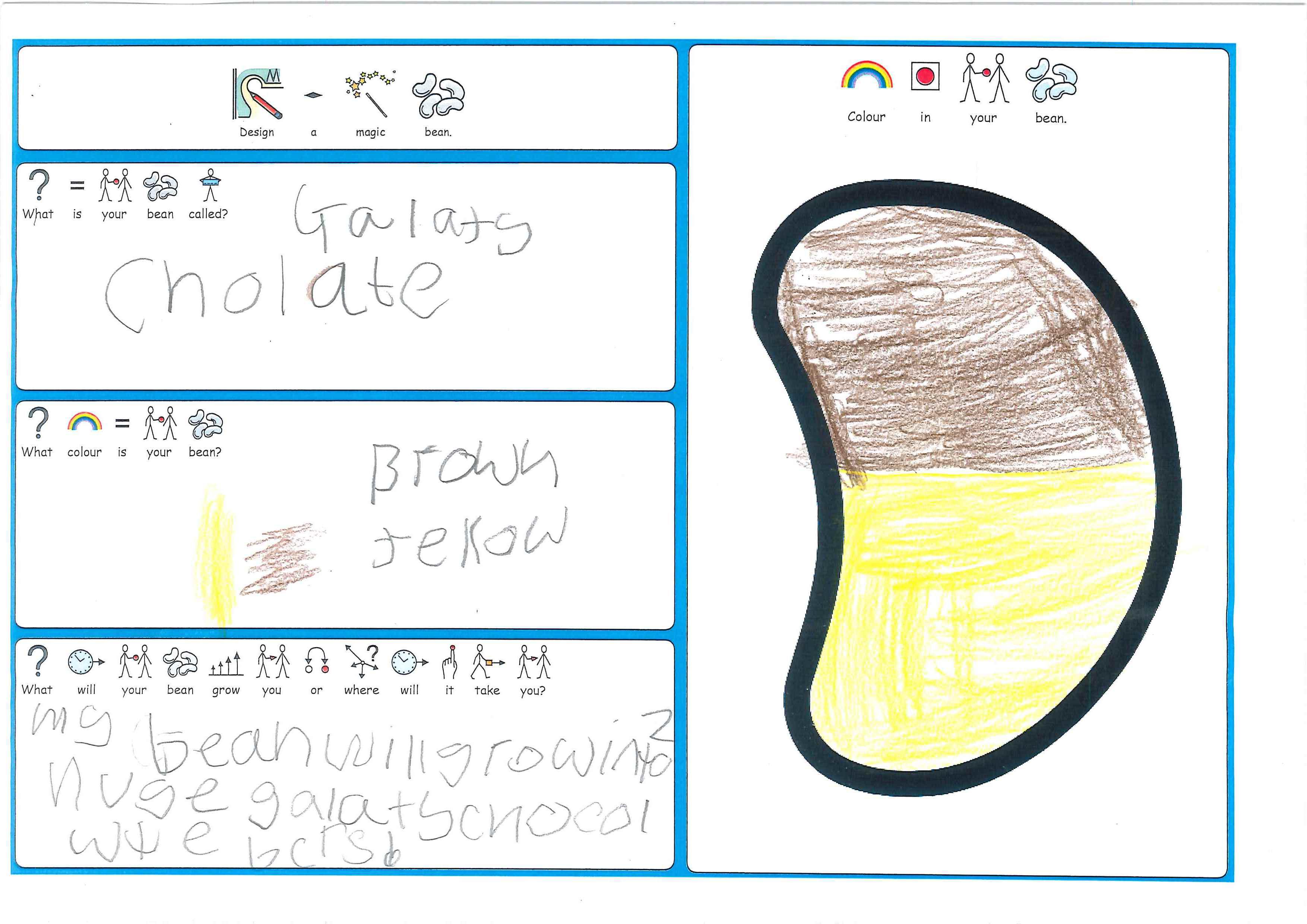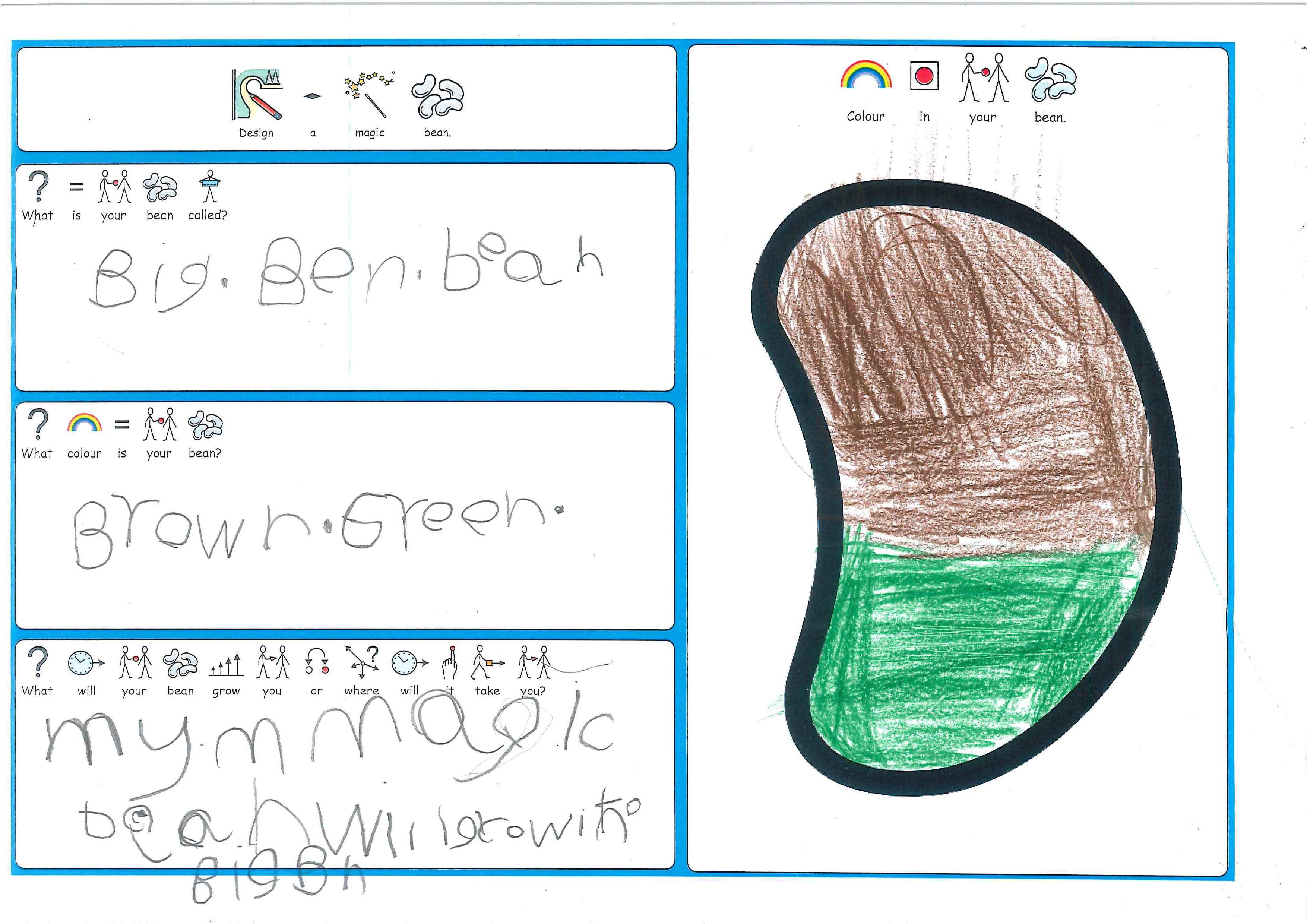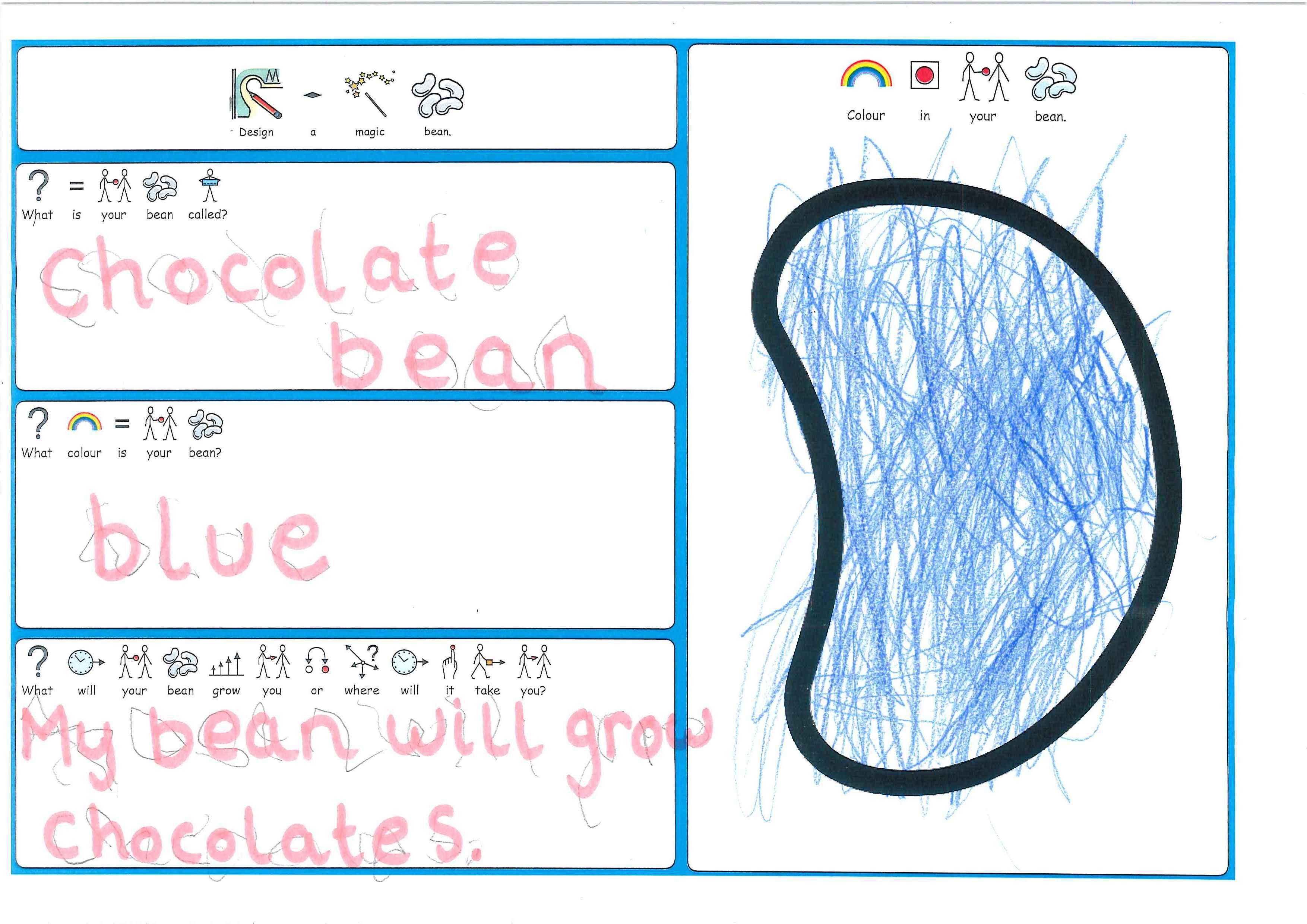 As part of Sapphire's Jack & the Beanstalk literacy work, all the children have designed their own magic bean.  The children had to decide on what it would grow or where it would take them, as well as it's name and colour.