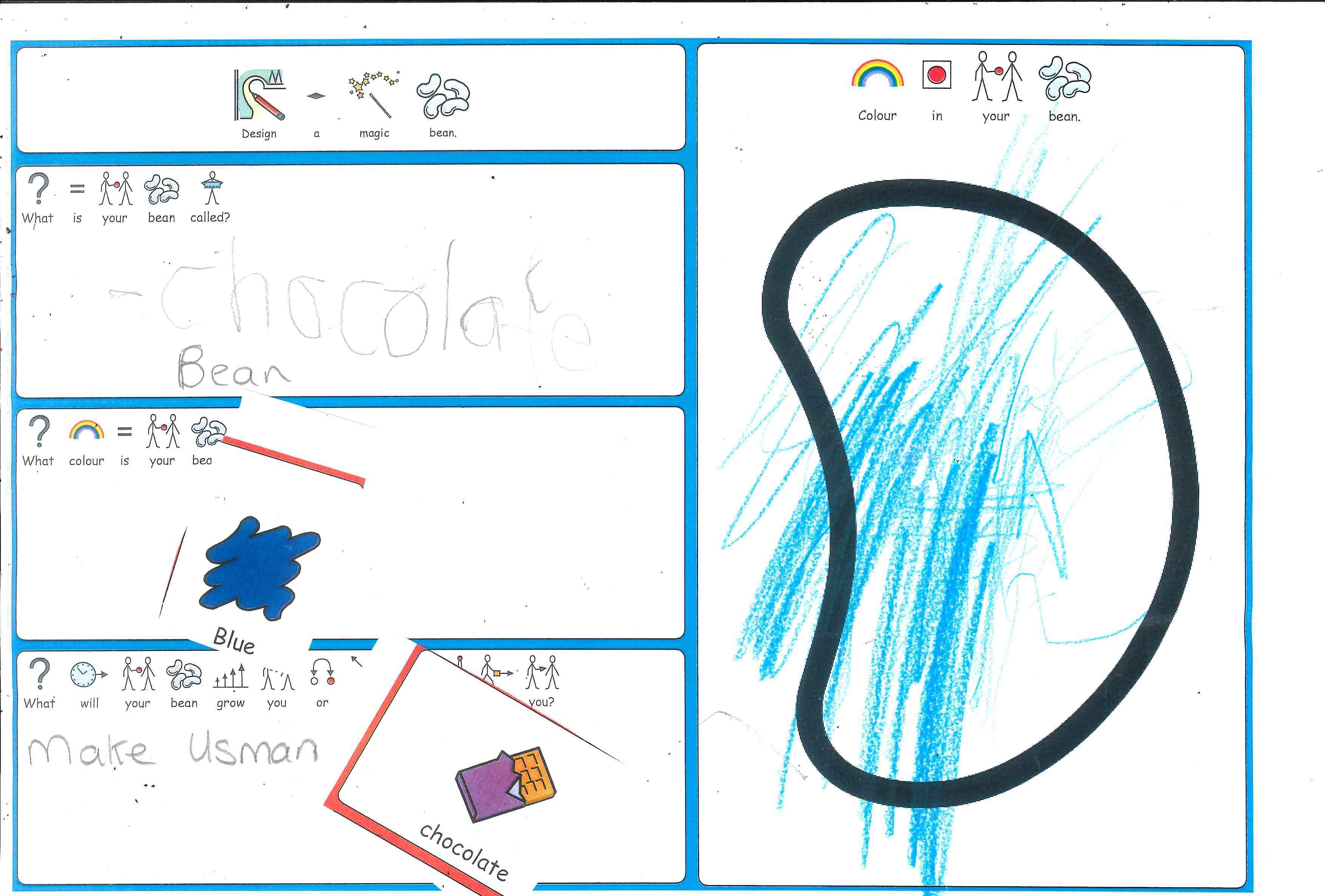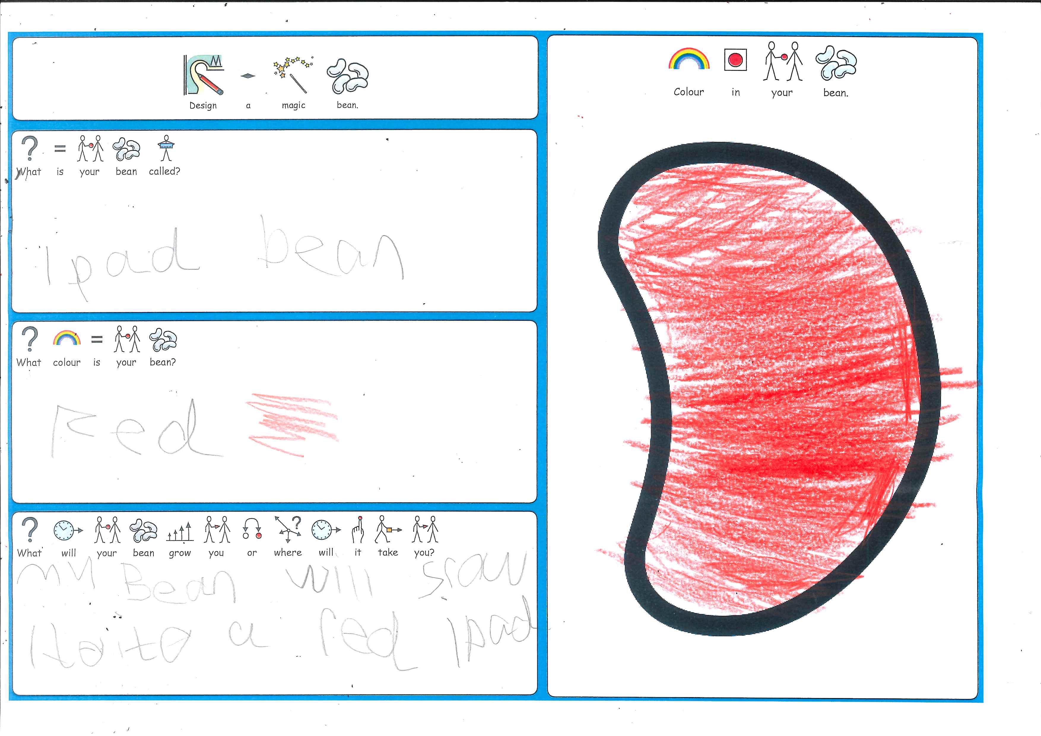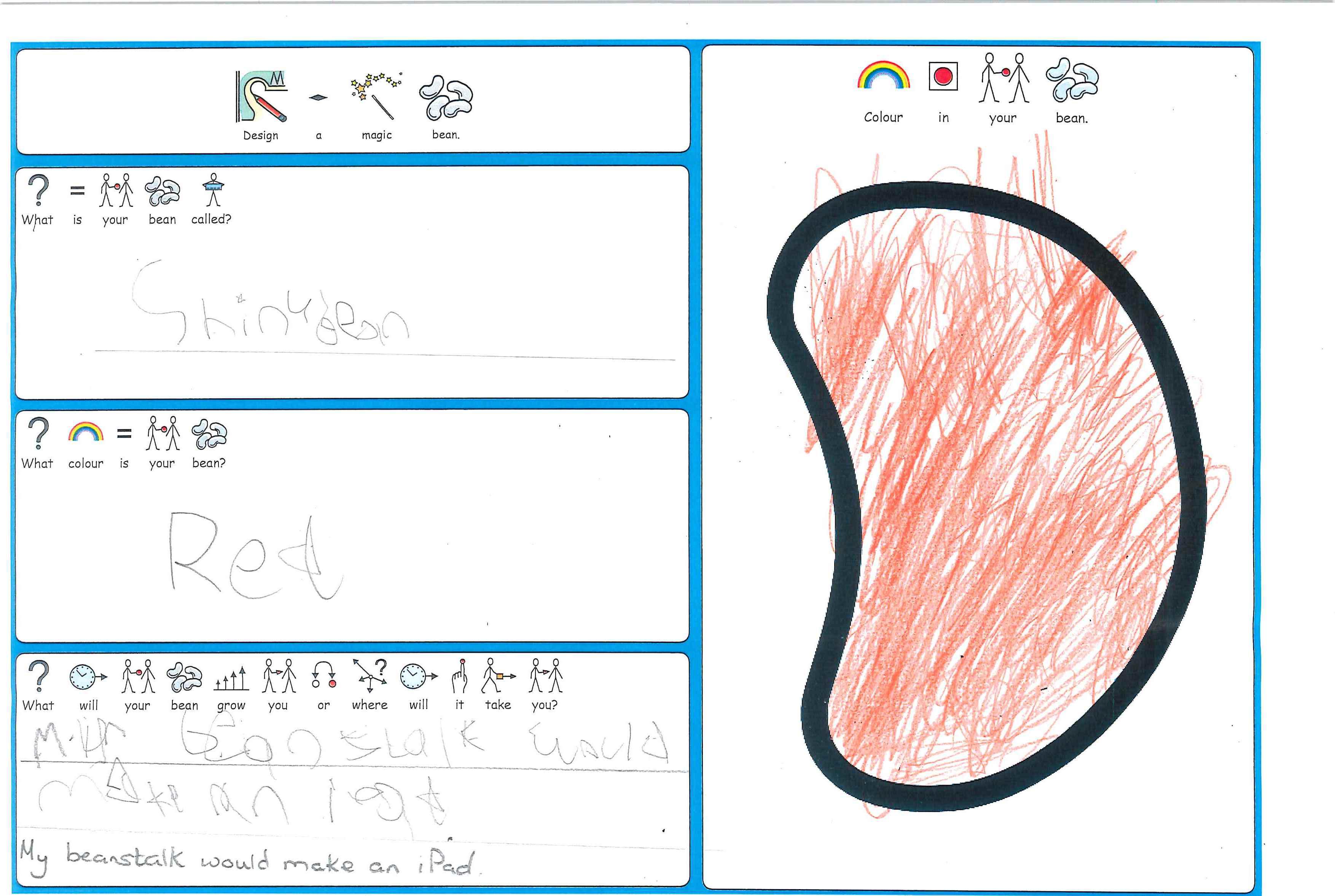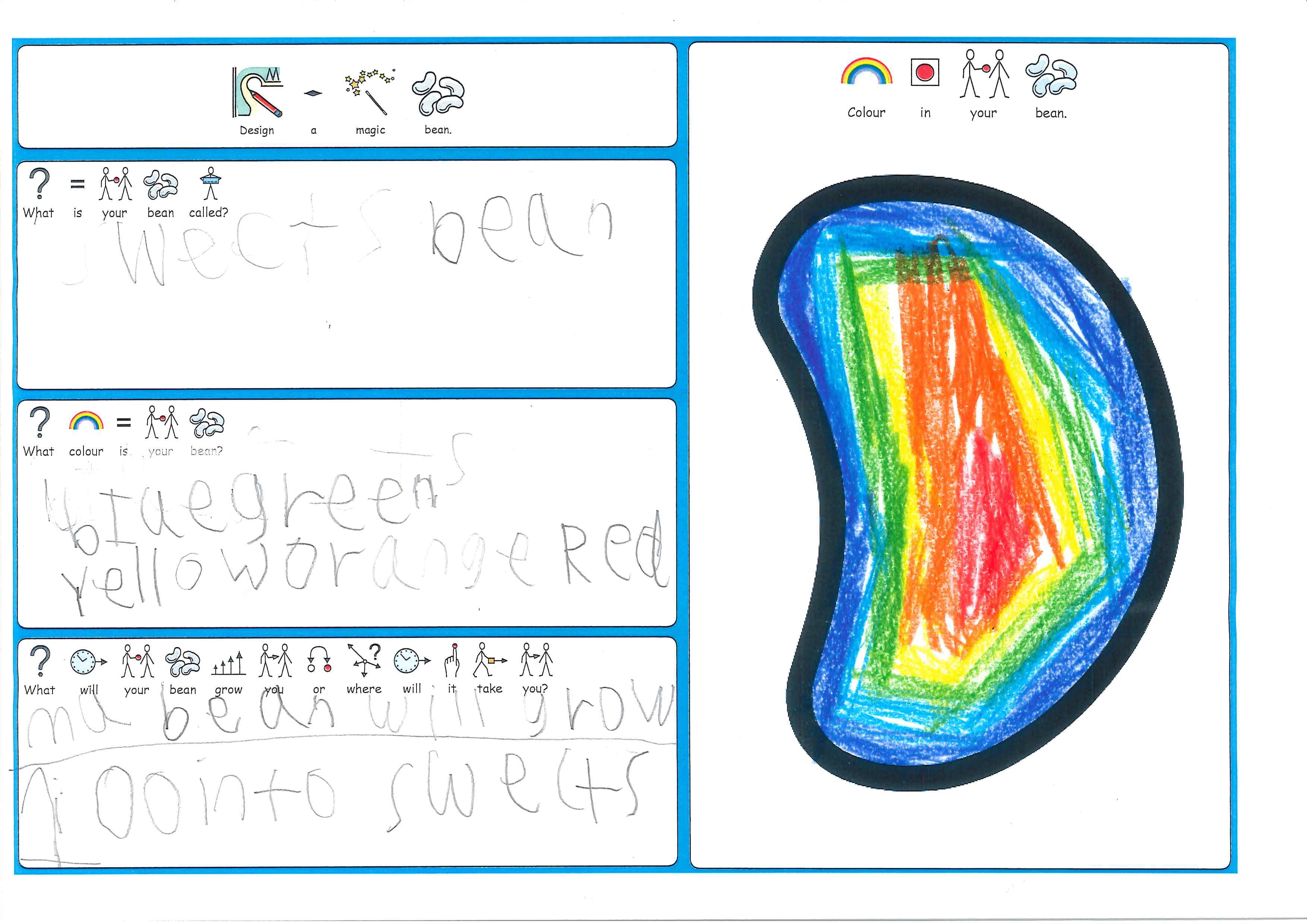 As part of Sapphire's Jack & the Beanstalk literacy work, all the children have designed their own magic bean.  The children had to decide on what it would grow or where it would take them, as well as it's name and colour.
