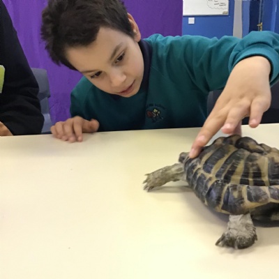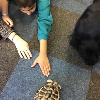 In science we thought about biology and learnt about humans and different animals. Emma was kind enough to bring her pets, a tortoise named Kevin and a dog named Jack, to school to meet us.