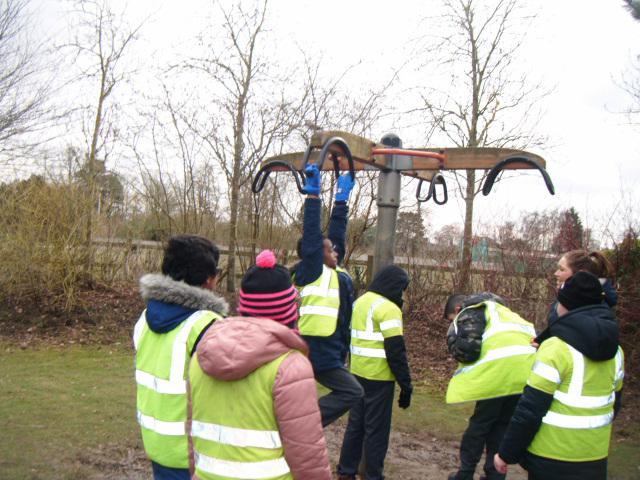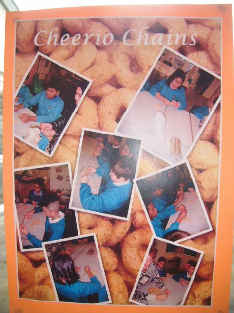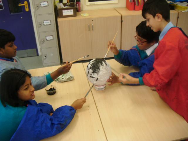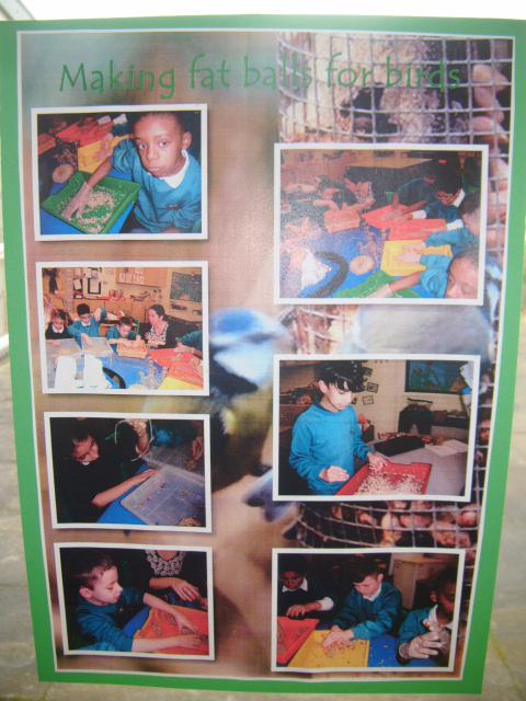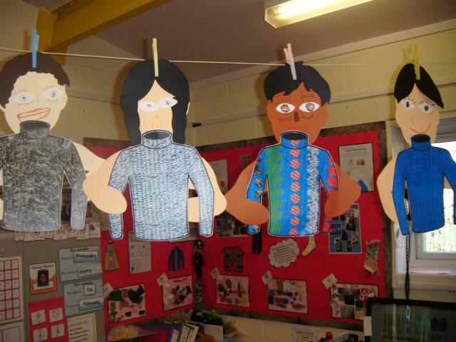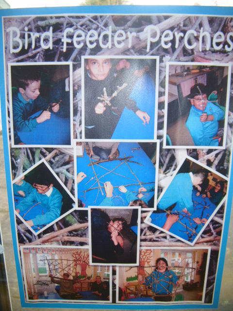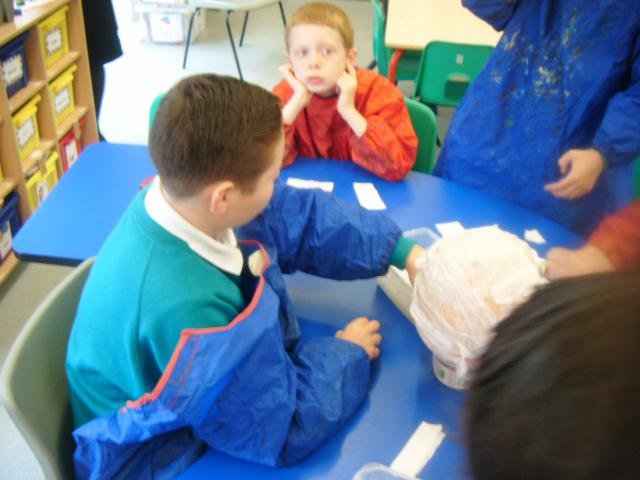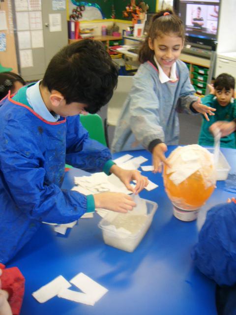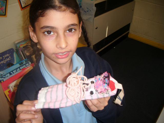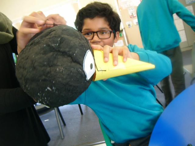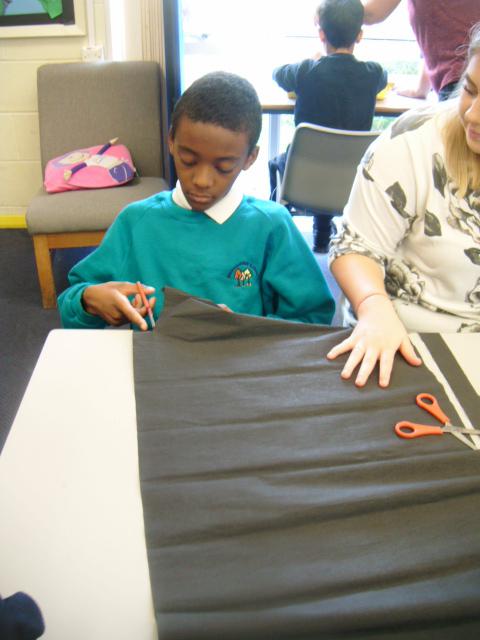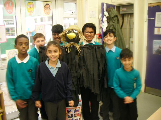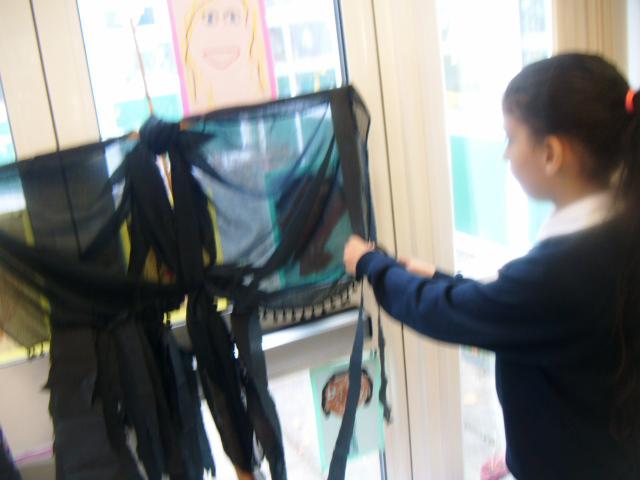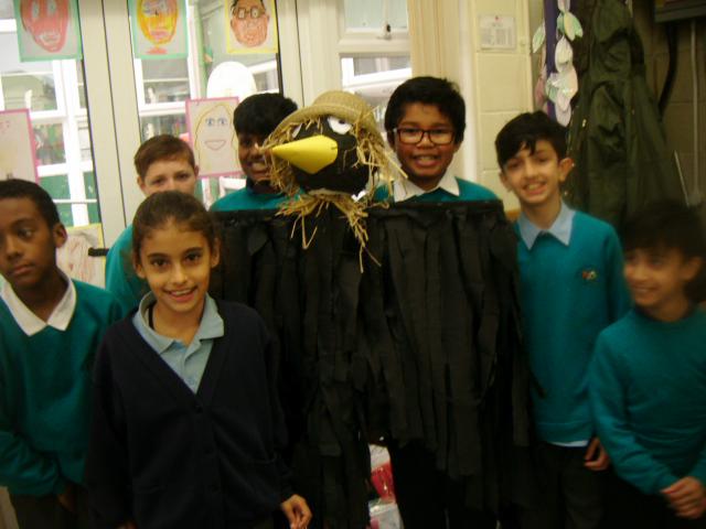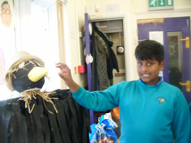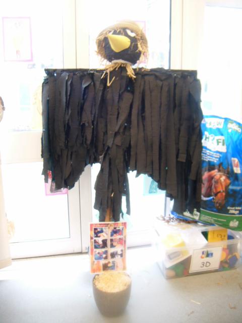 We had a lot of run creating this scarecrow for the competition, his head was made from a balloon covered in paper mache and we thought about 3D shapes when we made his nose from a cone. For his body we cut up lots of black crepe paper using our scissor skills and carefully attached them to a wooden frame.