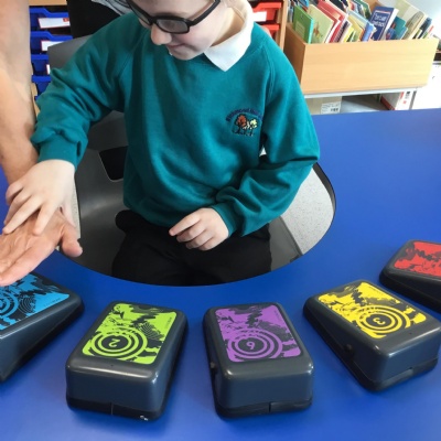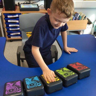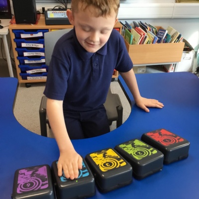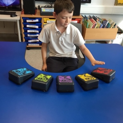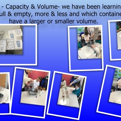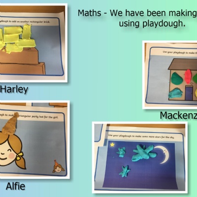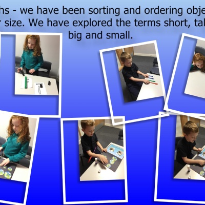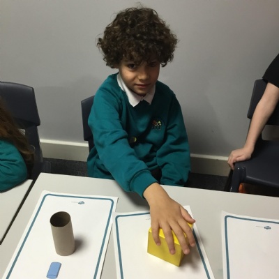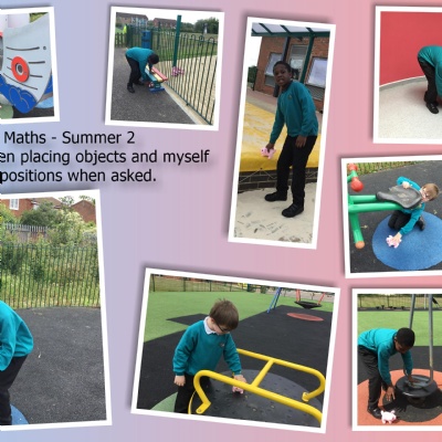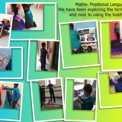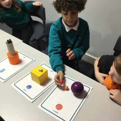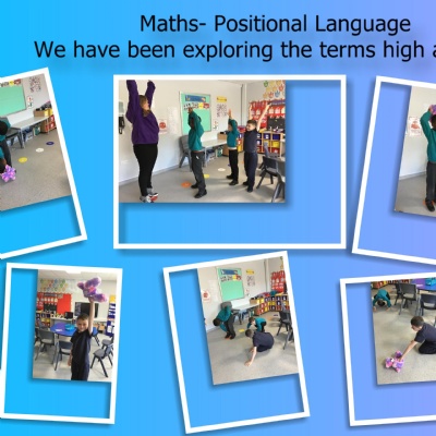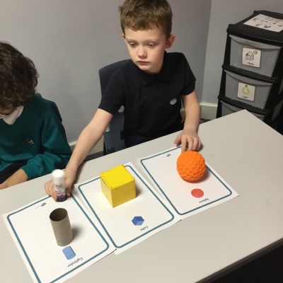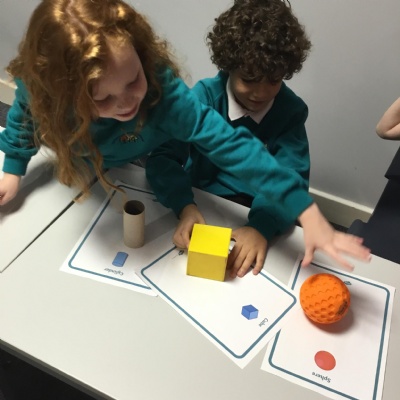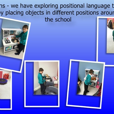 We have been exploring 3D shapes and 2D shapes. We have also been exploring placing objects in positions around the school/classroom.