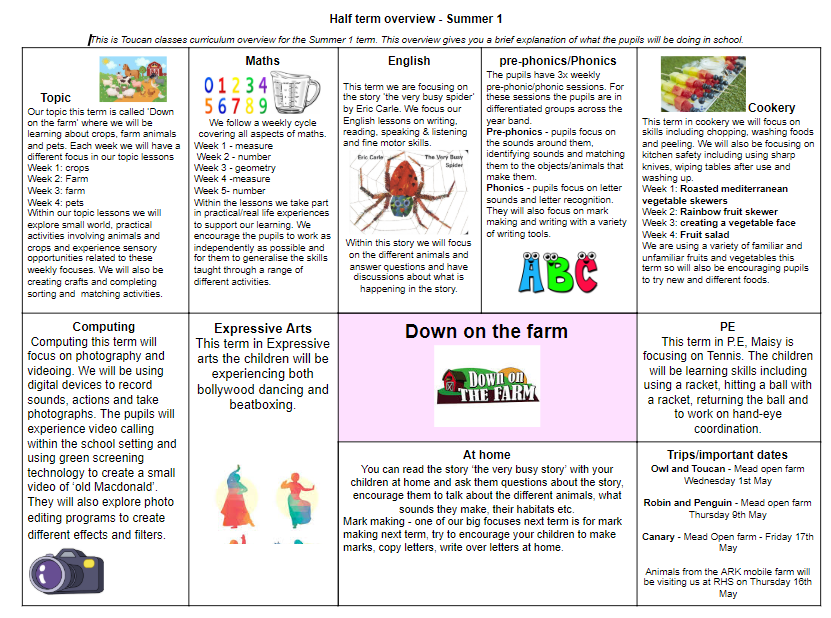 This half term our Topic is Down on the Farm and we will be reading The Very Bust Spider during our English Lesson.