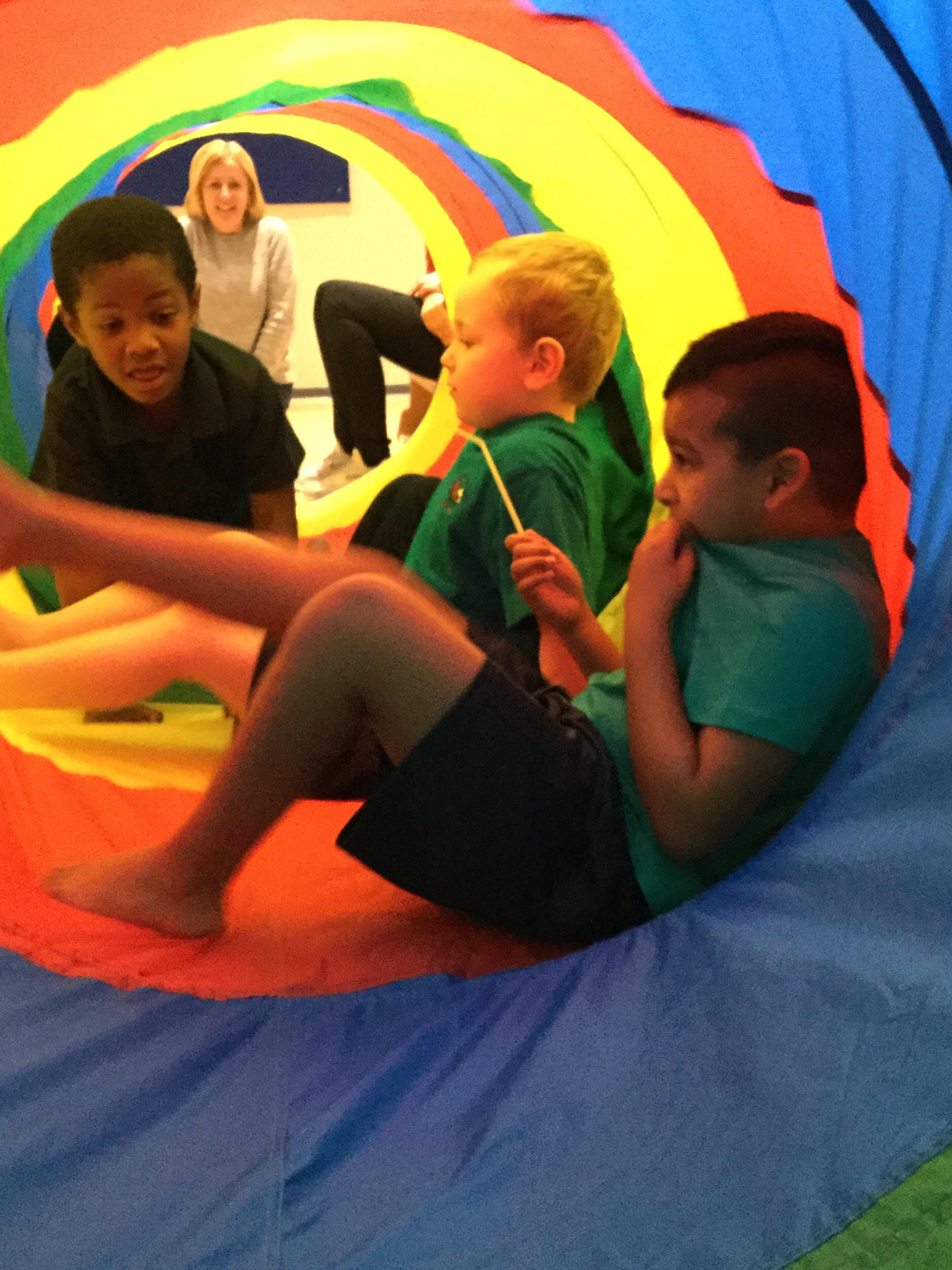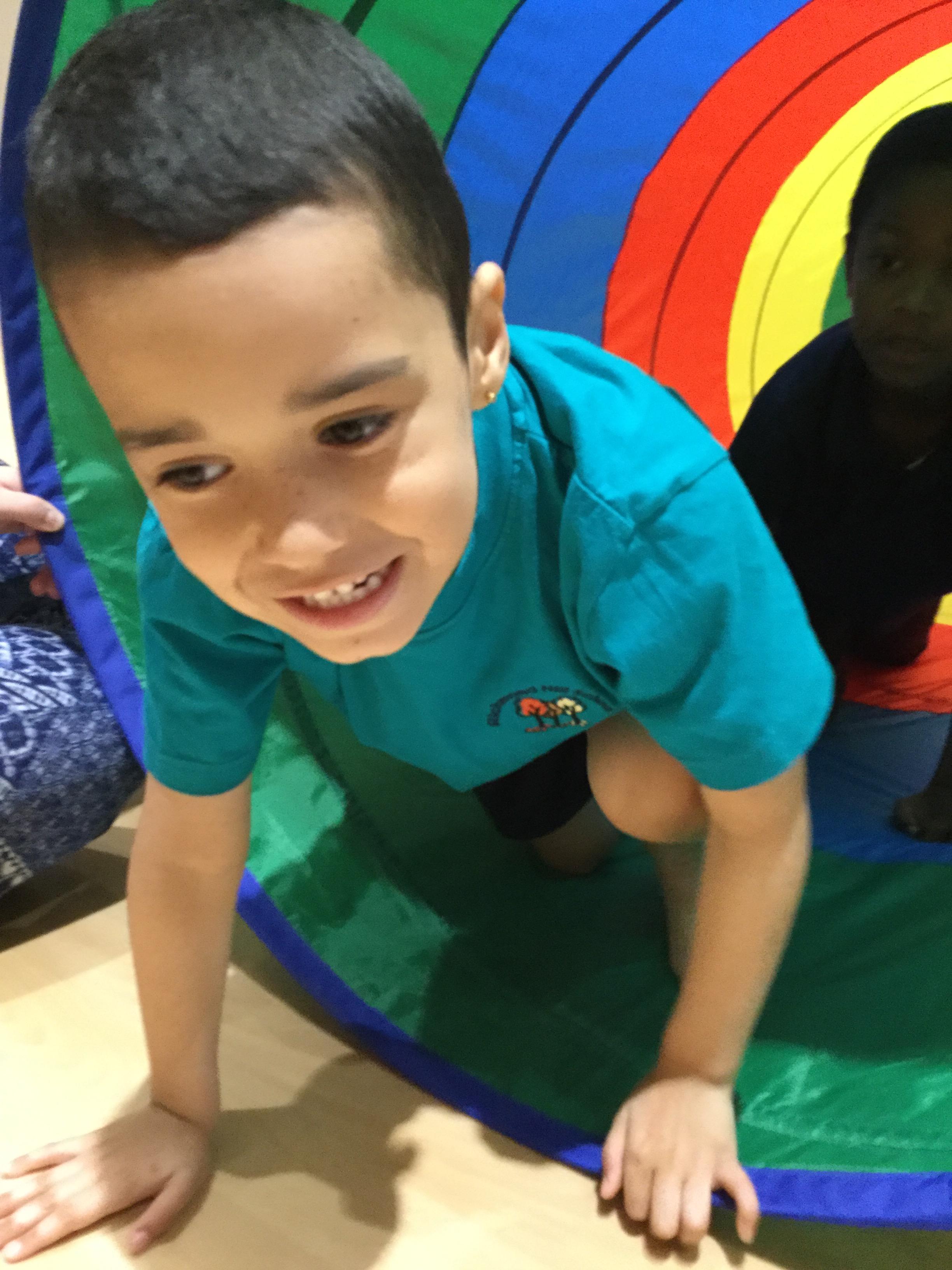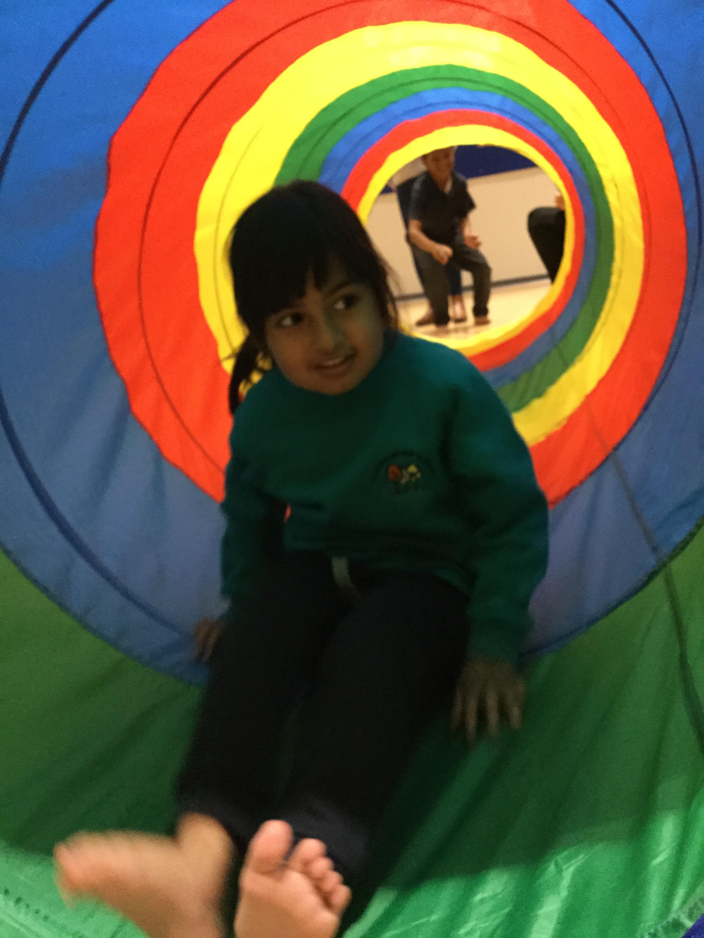 P.E is one of our favourite sessions. Maisy is teaching us all about gymnastics this half term focusing on balancing and rolling. We loved using Maisy's special big tunnel, we had lots of fun climbing though it and sitting in it with our friends.