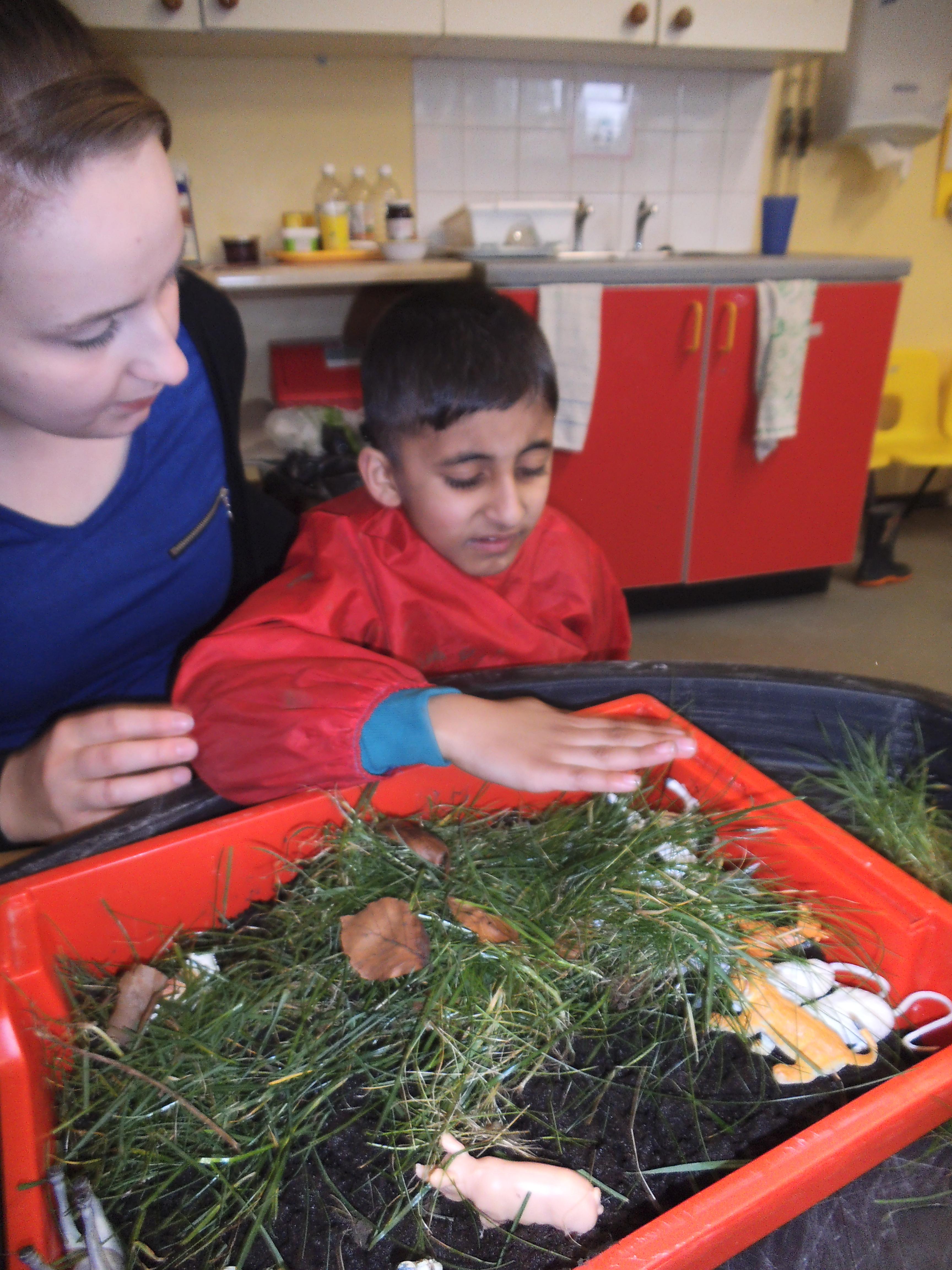 Our story this half term is an adapted version of the book Flat Stanley. We have retold this through massage and a sensory story. Pupil have posted Flat Stanley to India where we did some mark making with spiced paint. We flew over to the cold lakes of Canada, where we played in sensory snow and made marks with coloured ice.