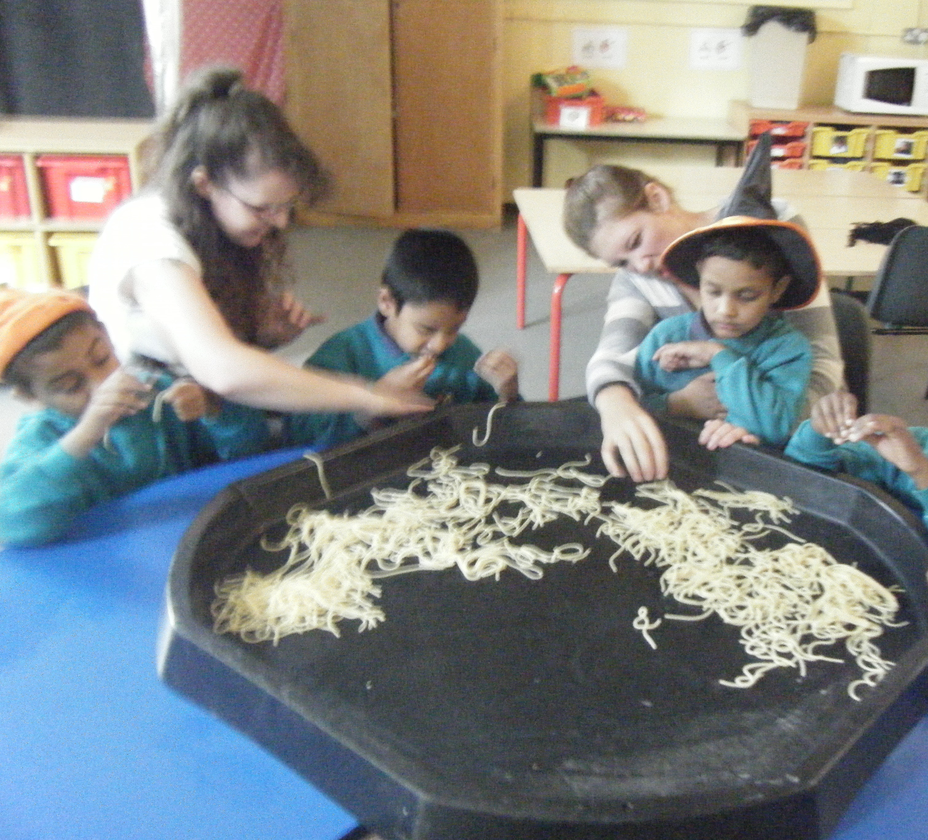 In literacy we have been reading and taking part in spooky stories, through the medium of massage. We read the poem about “Webster witch” where we enjoyed making our own spooky potions.