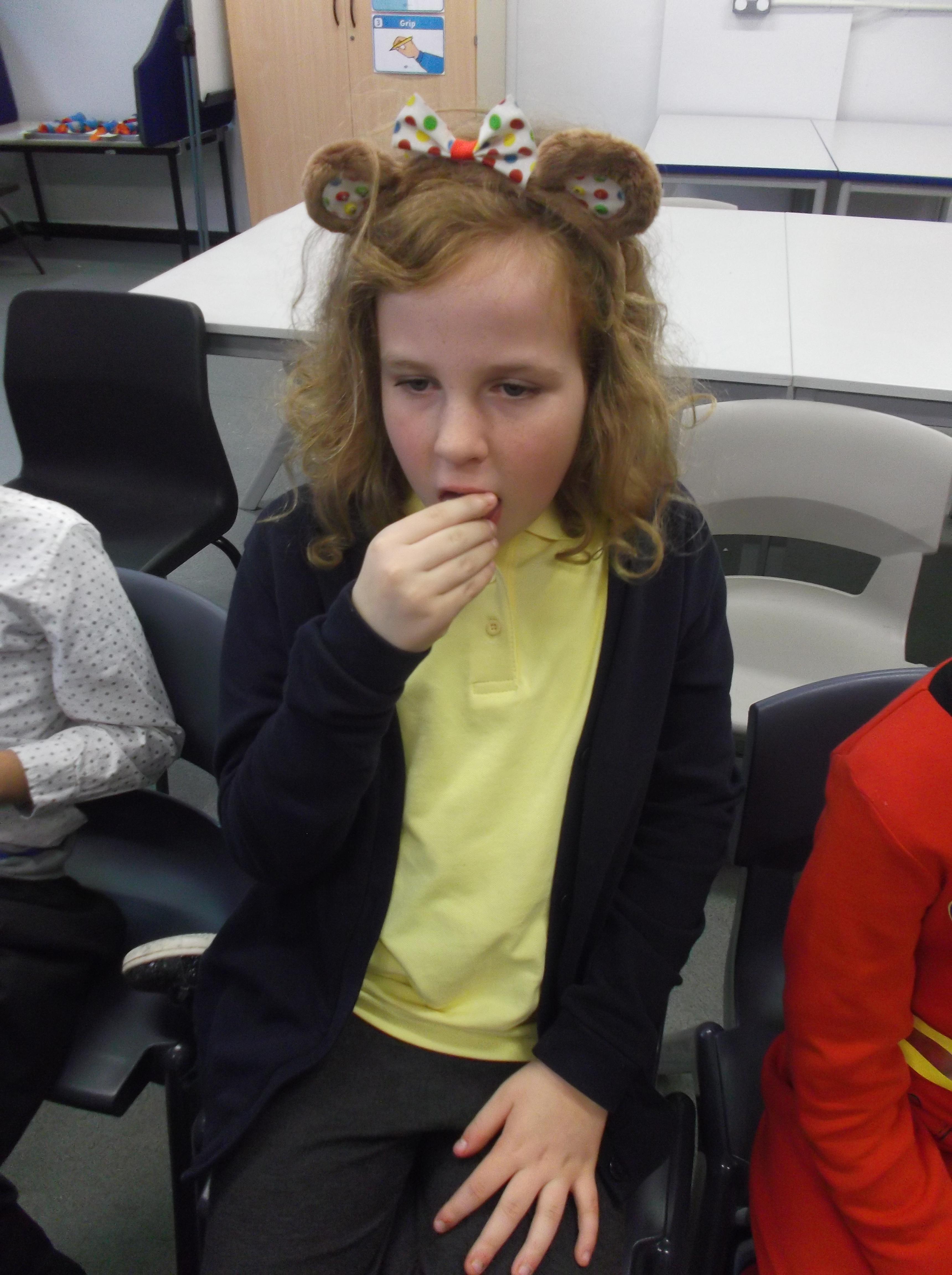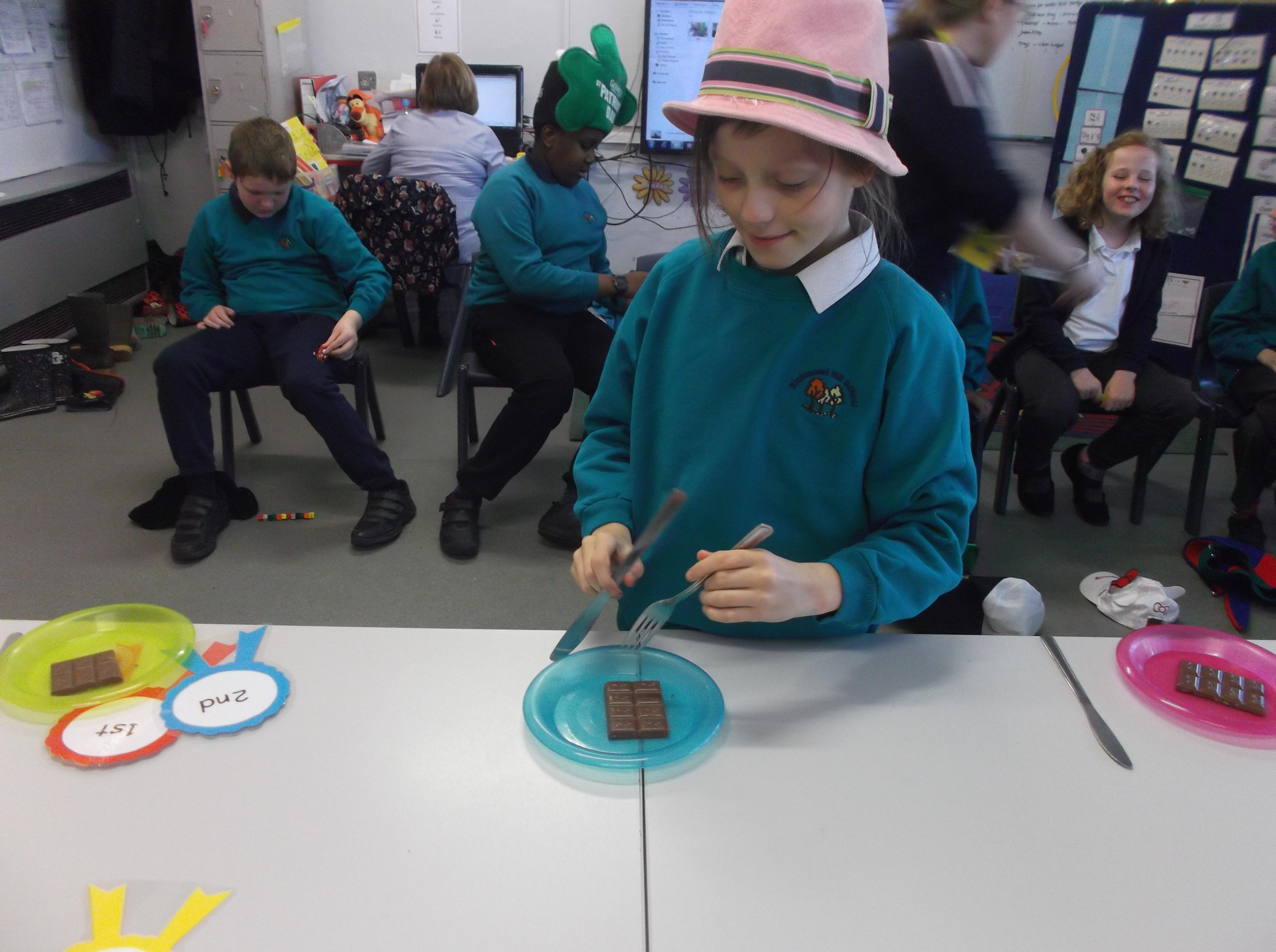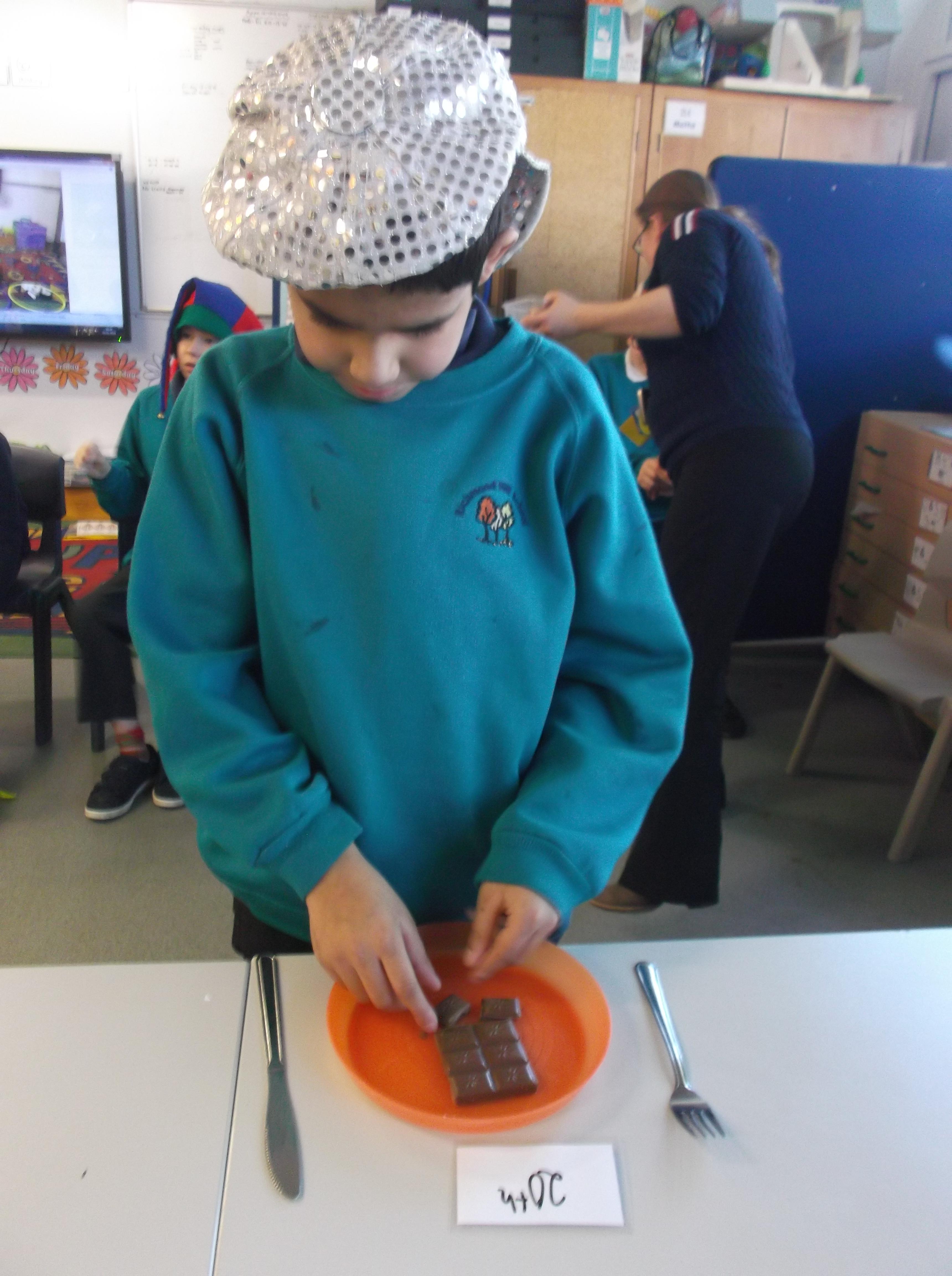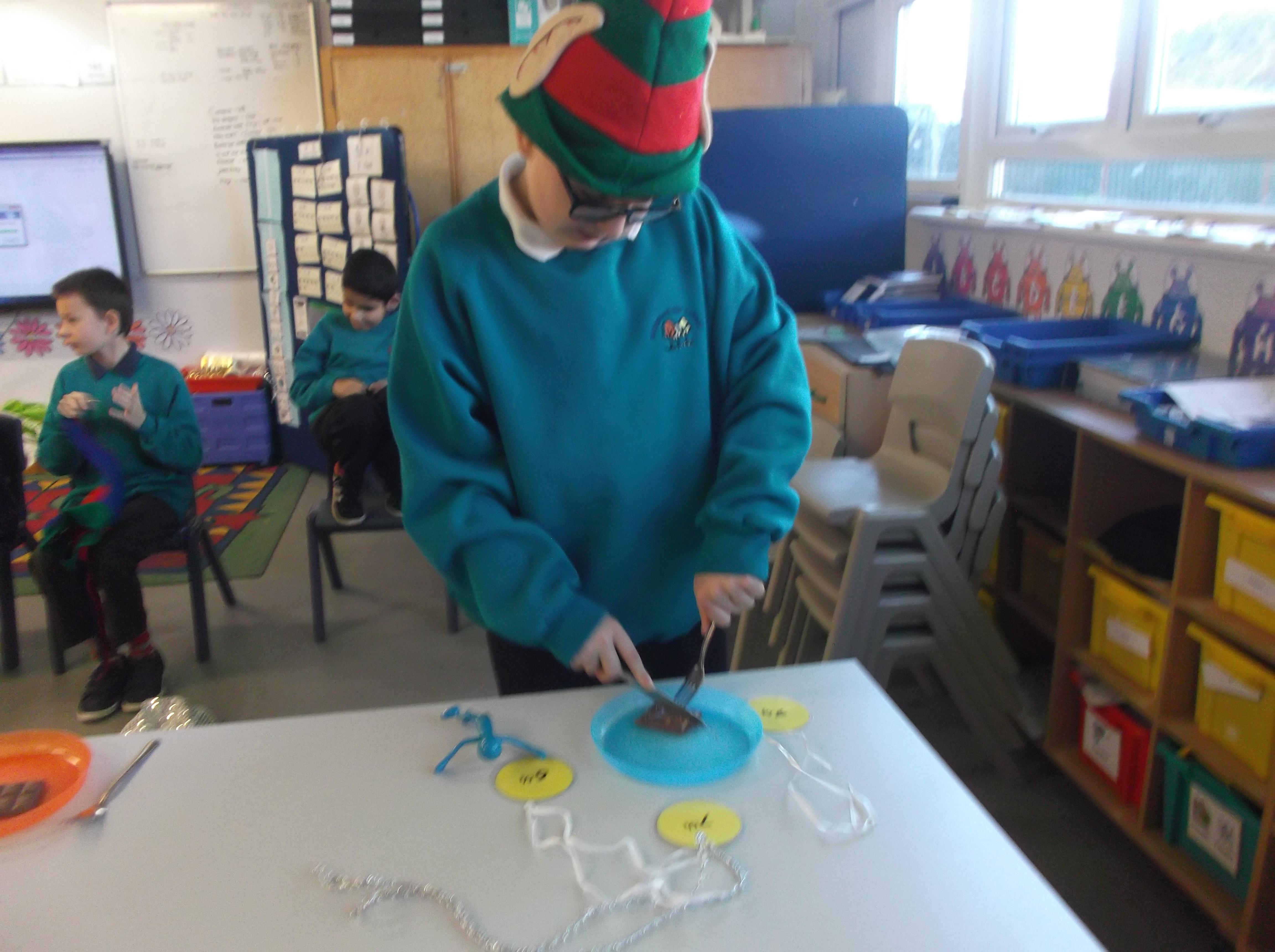 In our Mathematics lessons, we have been looking at ordinal numbers. The children particularly enjoyed the game activities. They took it in turns to roll a dice and when they got a 6 they have to put on a hat and cut chocolate with a knife and fork. We recorded who was first, who was second and who was last!