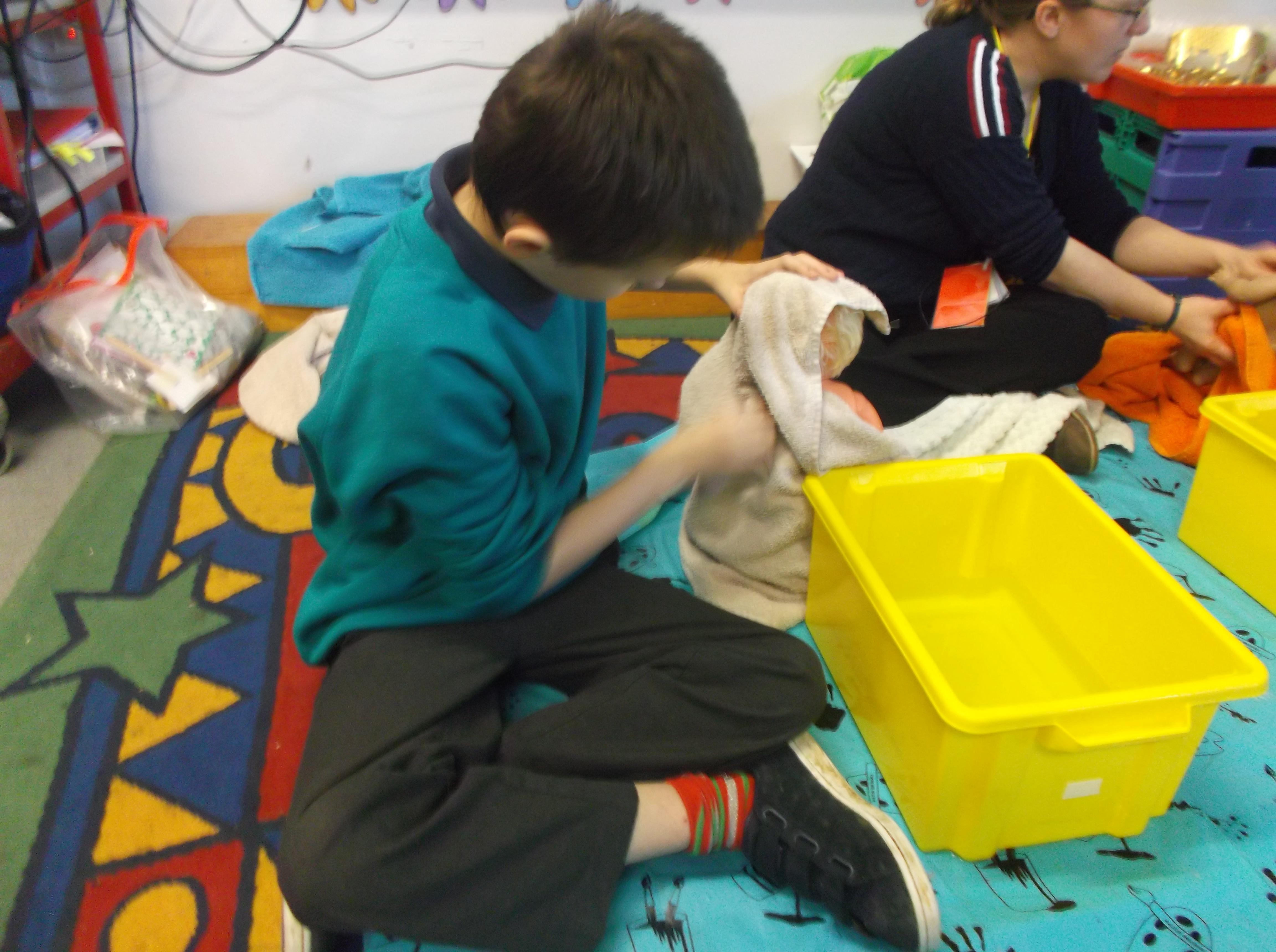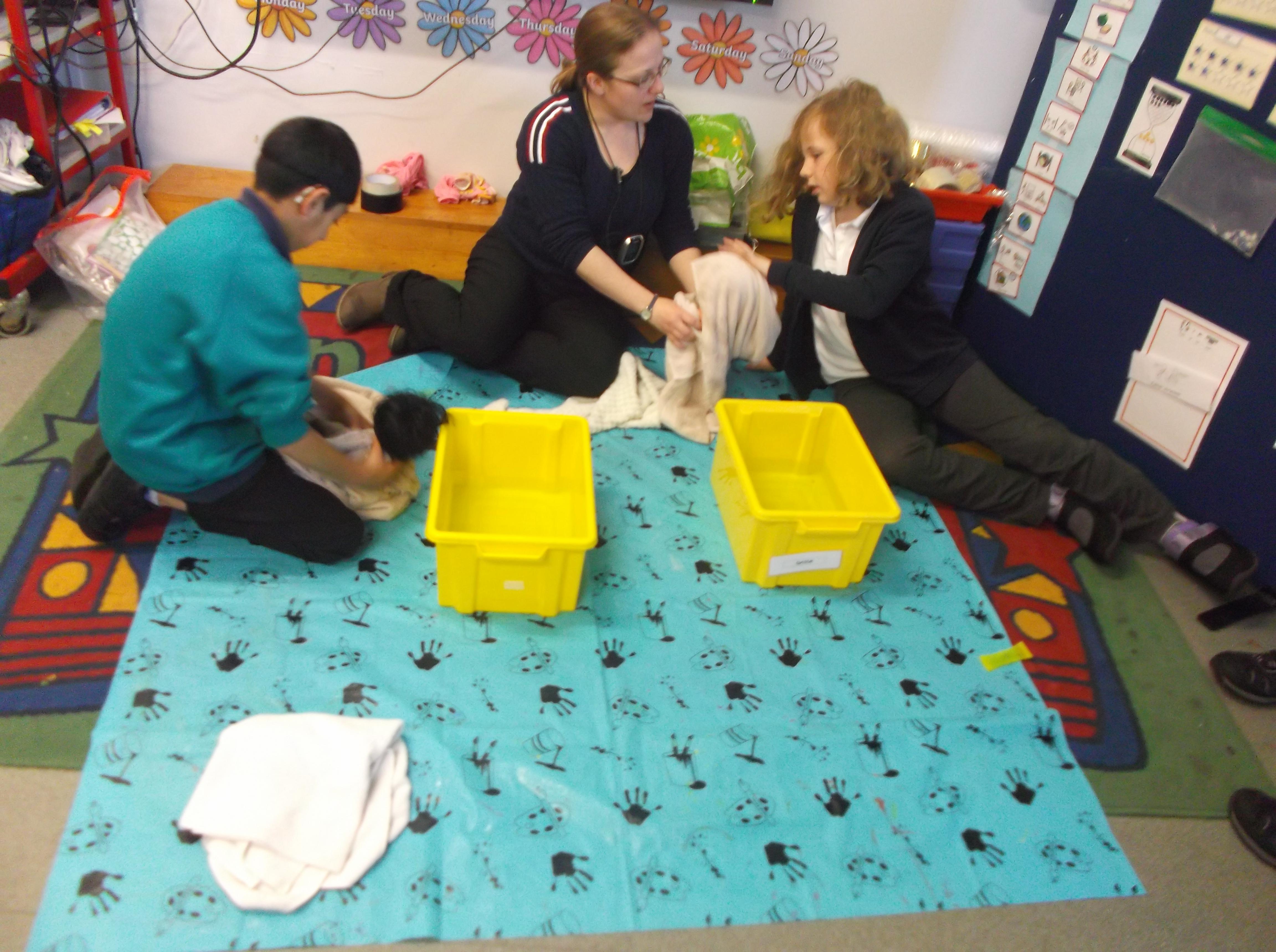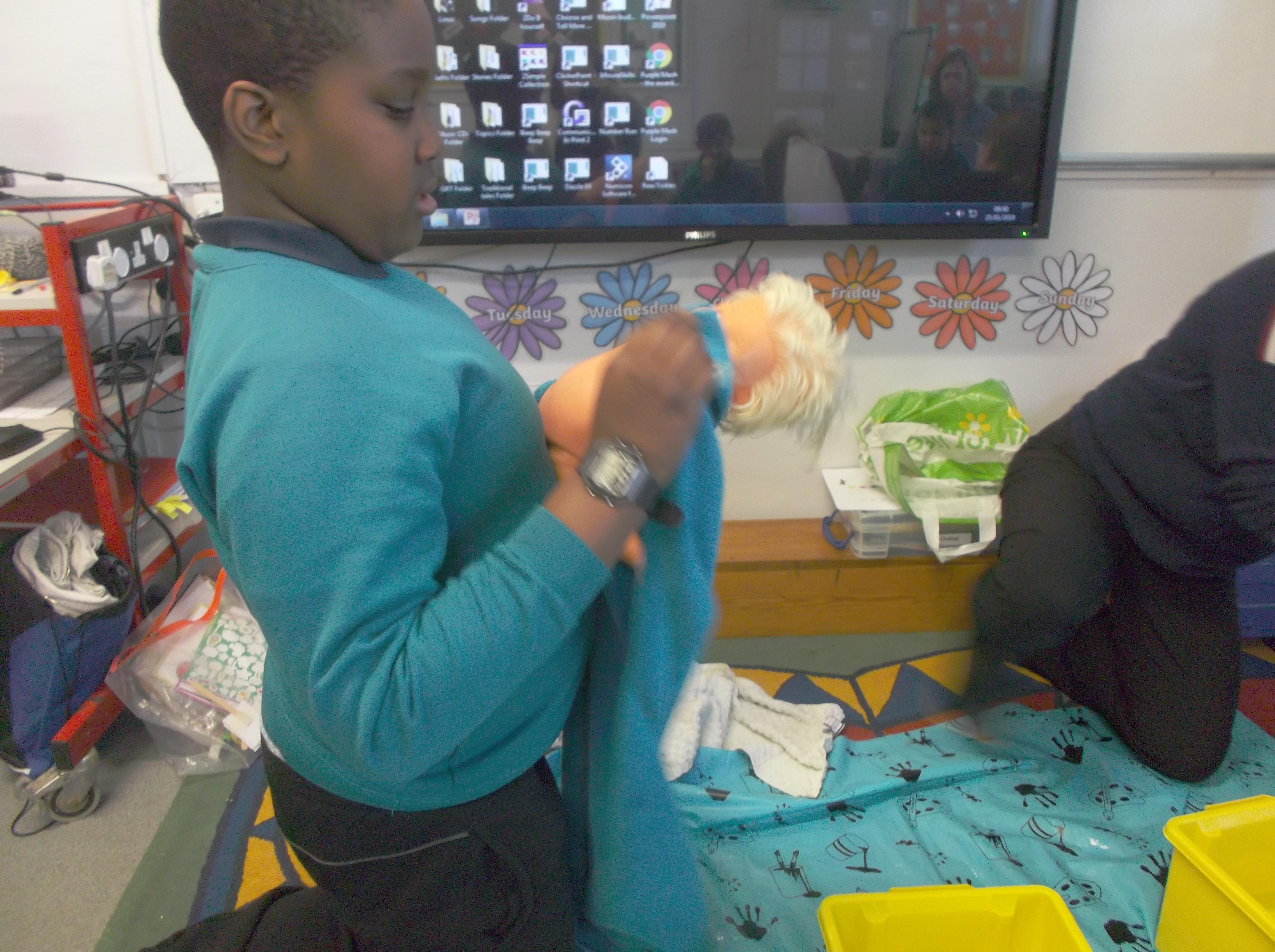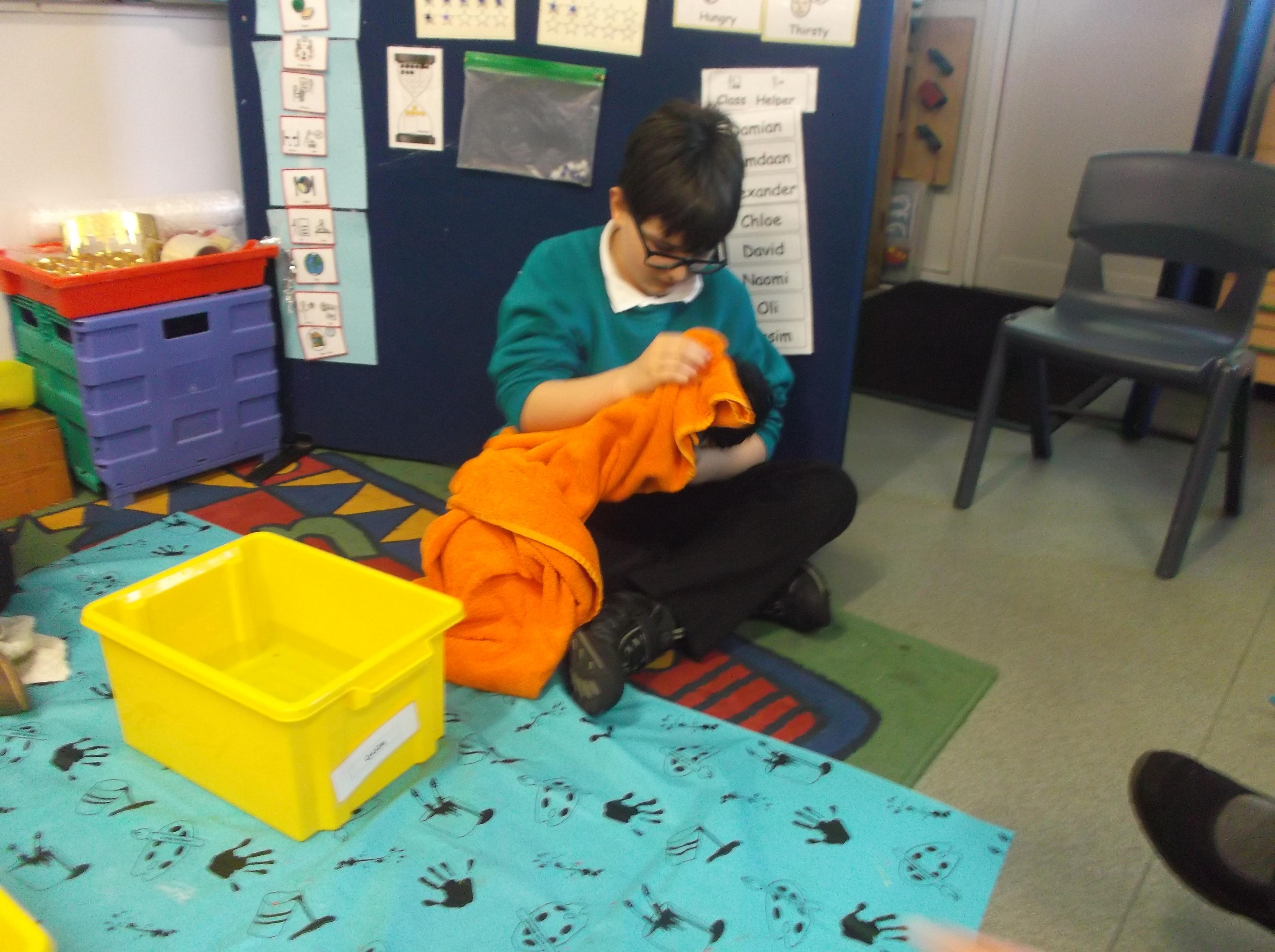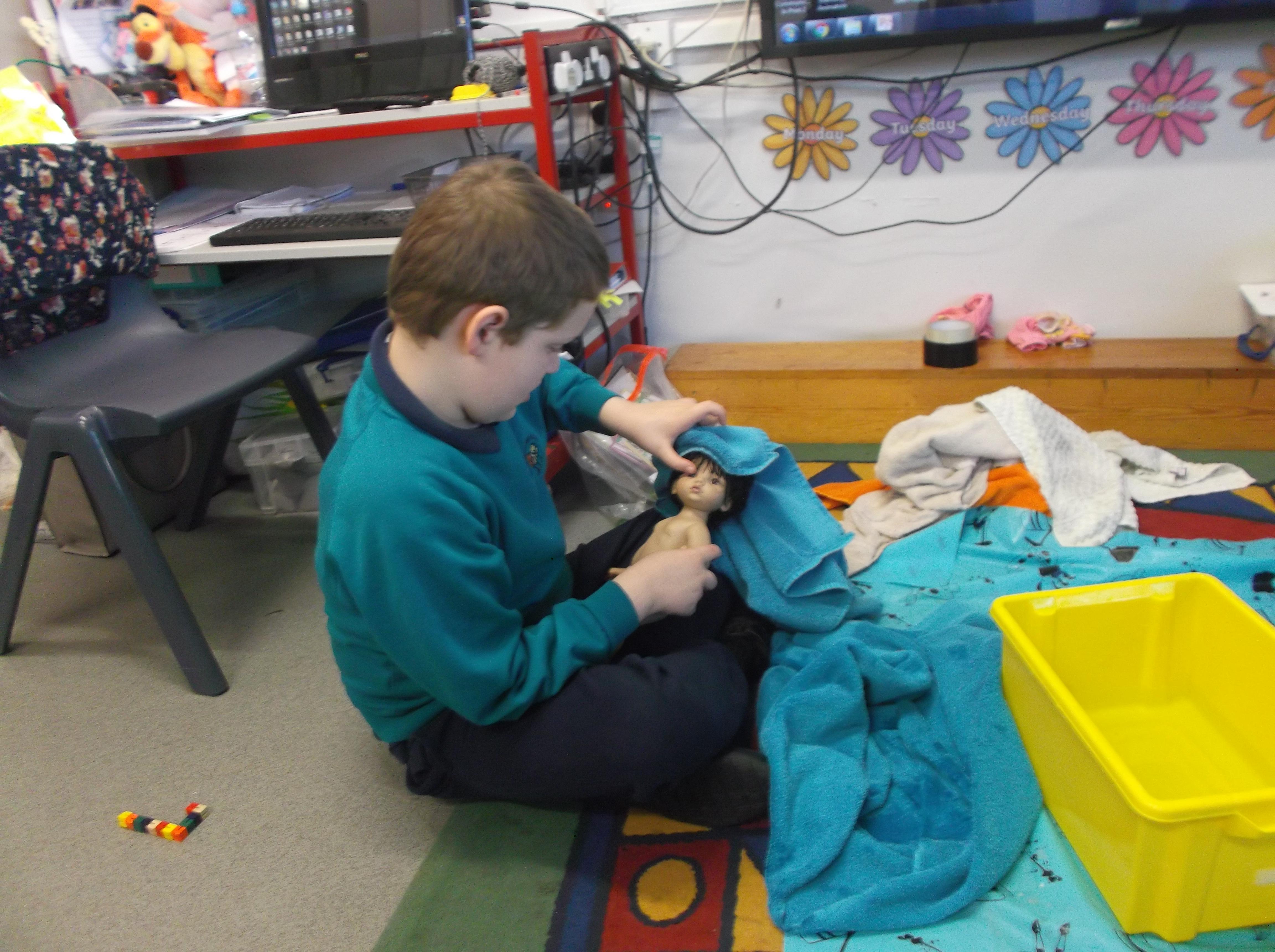 We have been developing our skills of drying ourselves so that we can be a little more independent after swimming. We used a doll and we dried its hair, face and upper body. Then we dried the legs and feet too. We did very well!